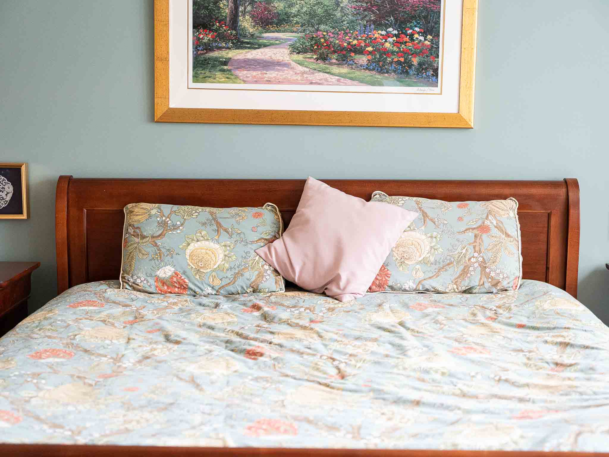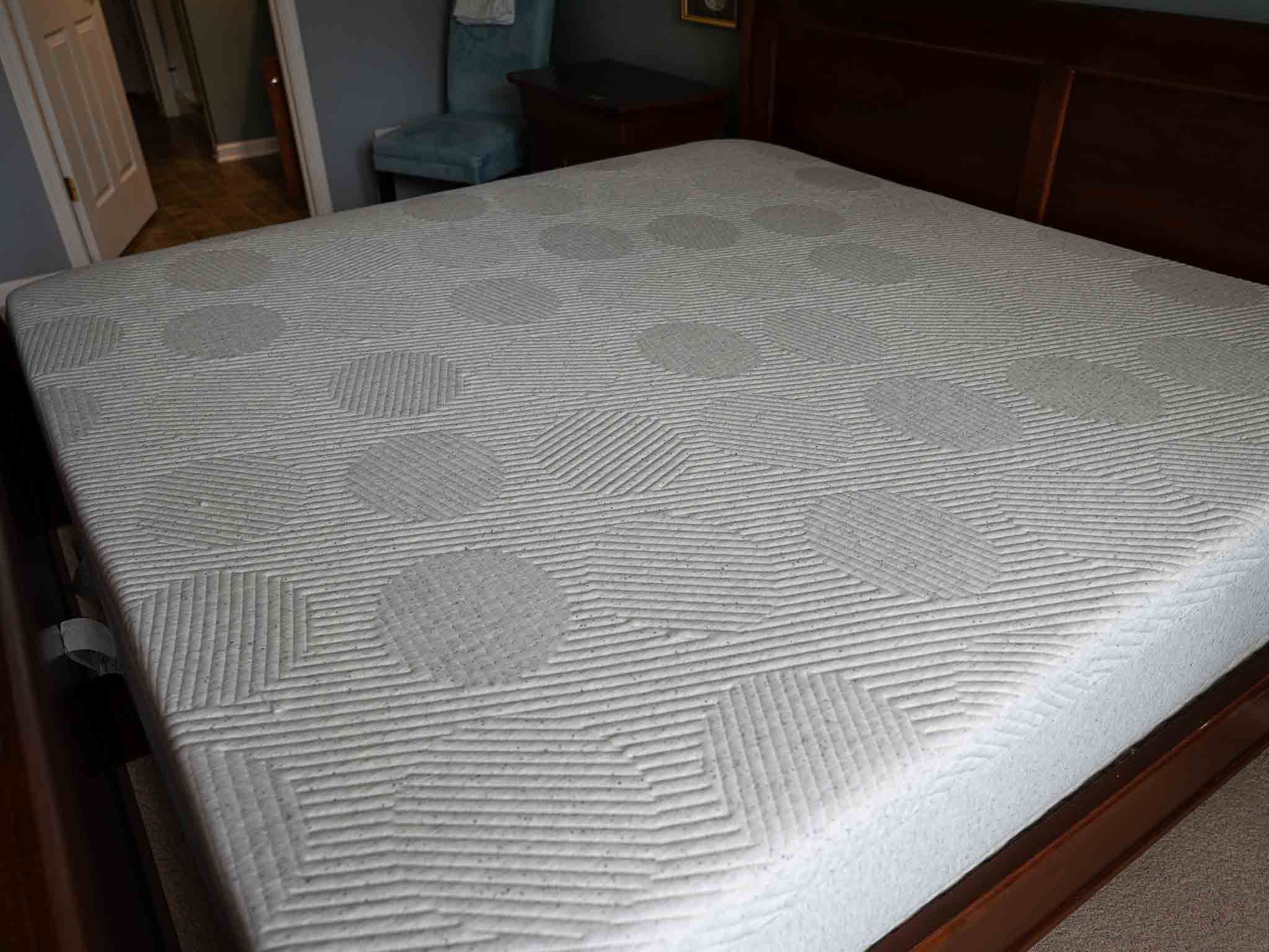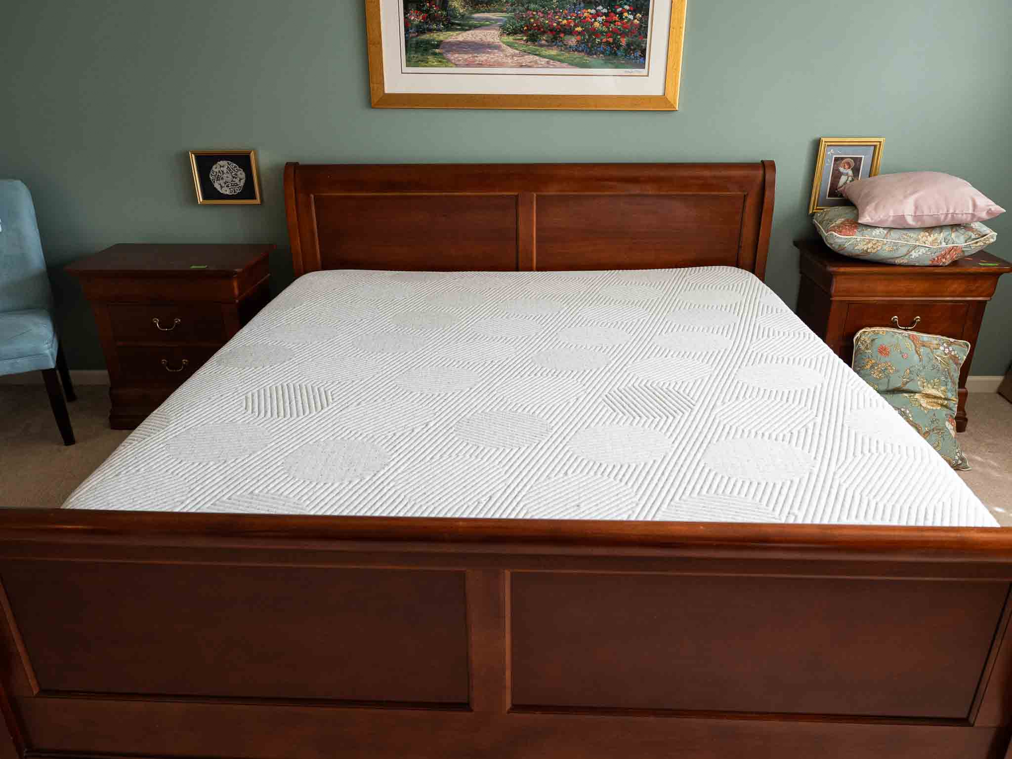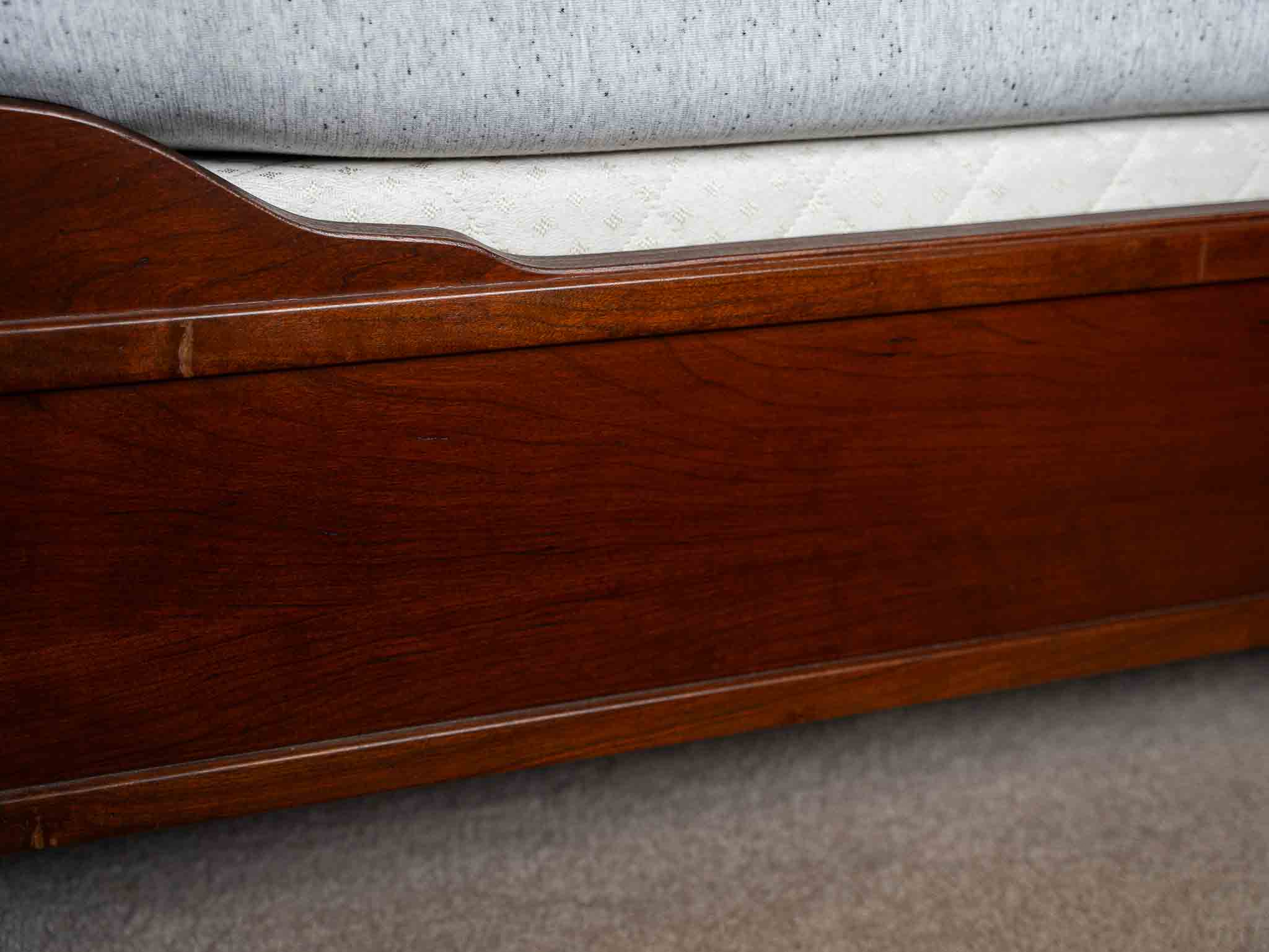 - Solid wood king sleigh bed frame with Casper king mattress