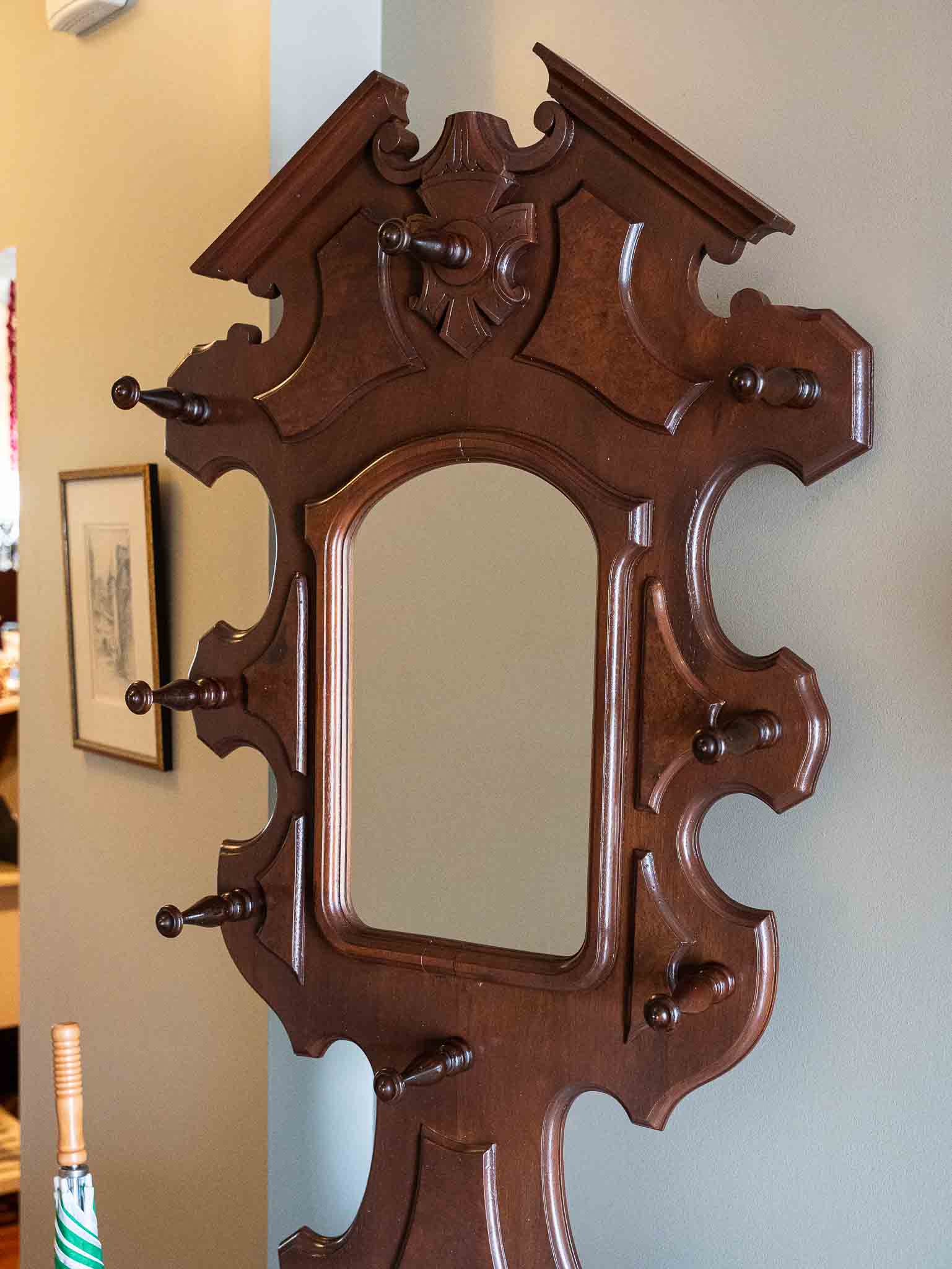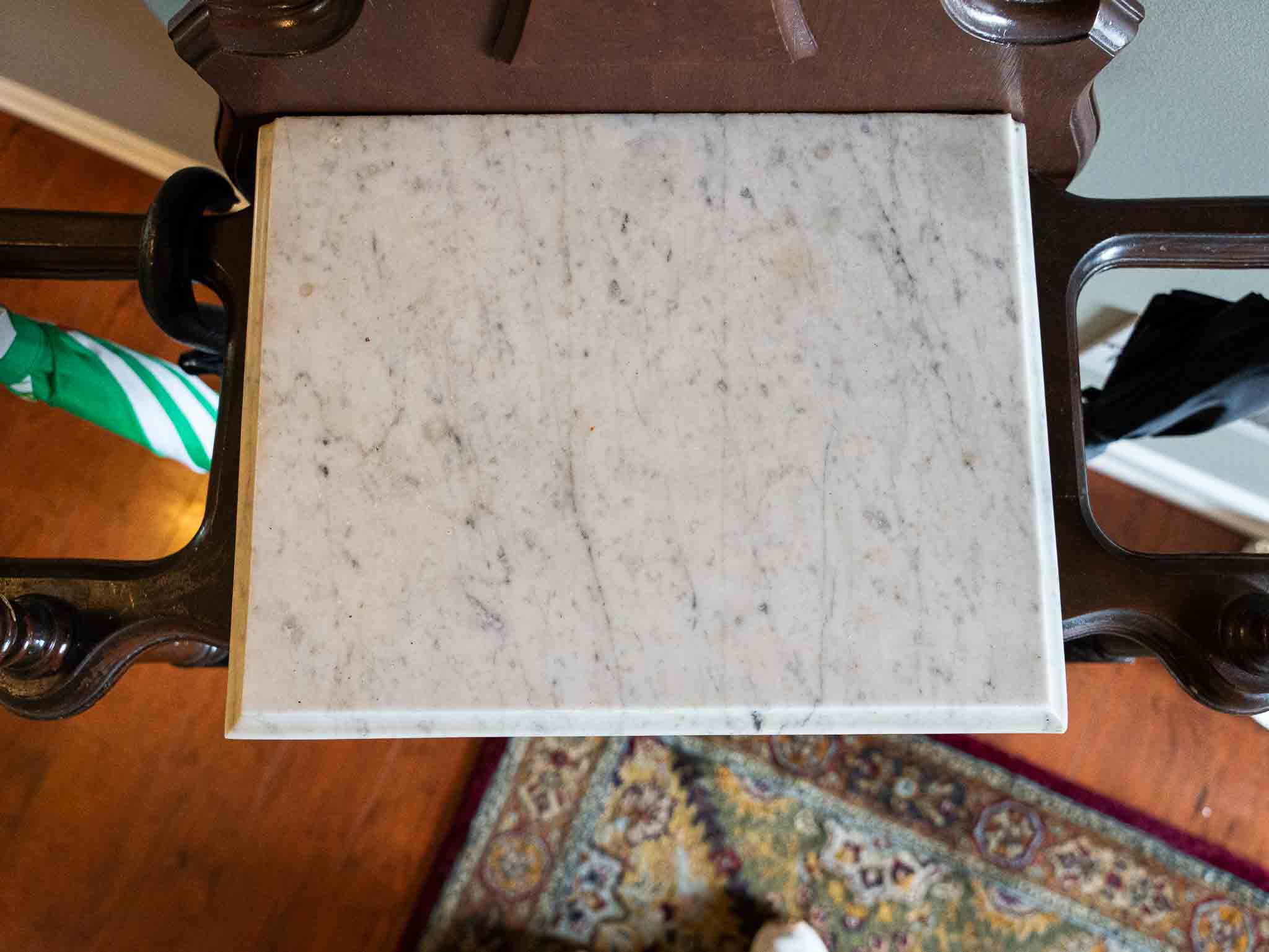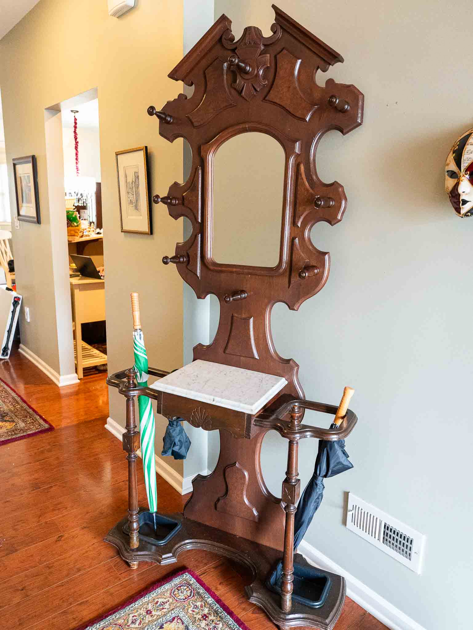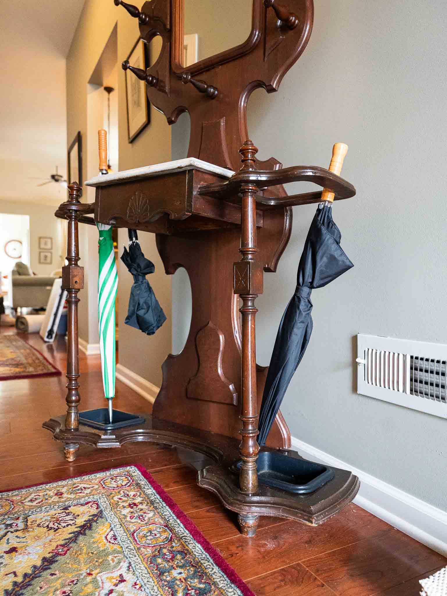 - Antique-style hall tree with mirror and marble top