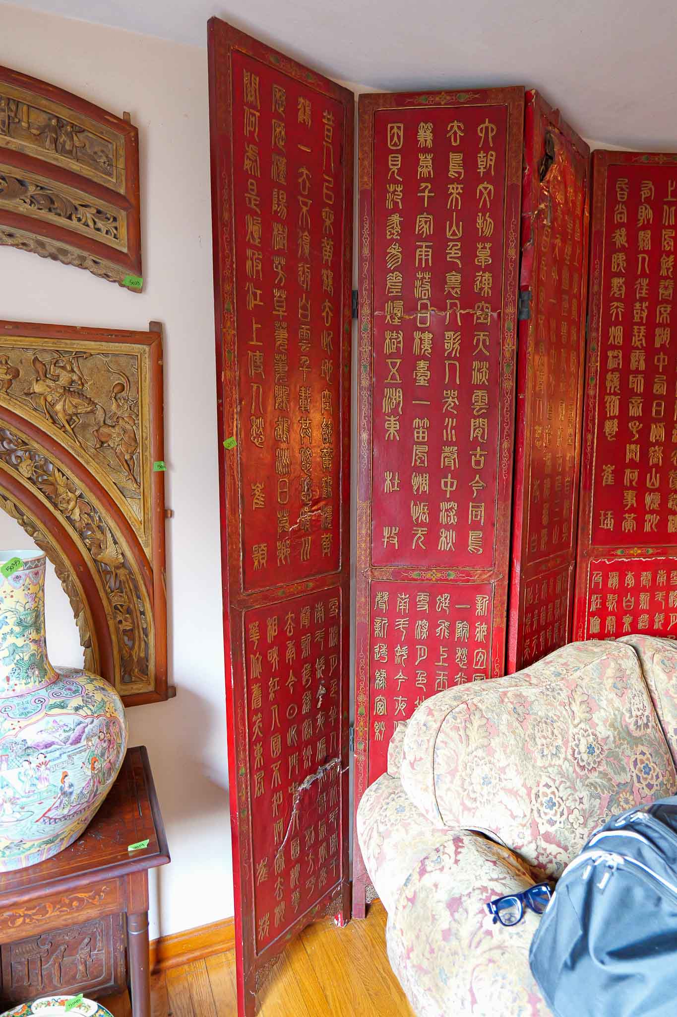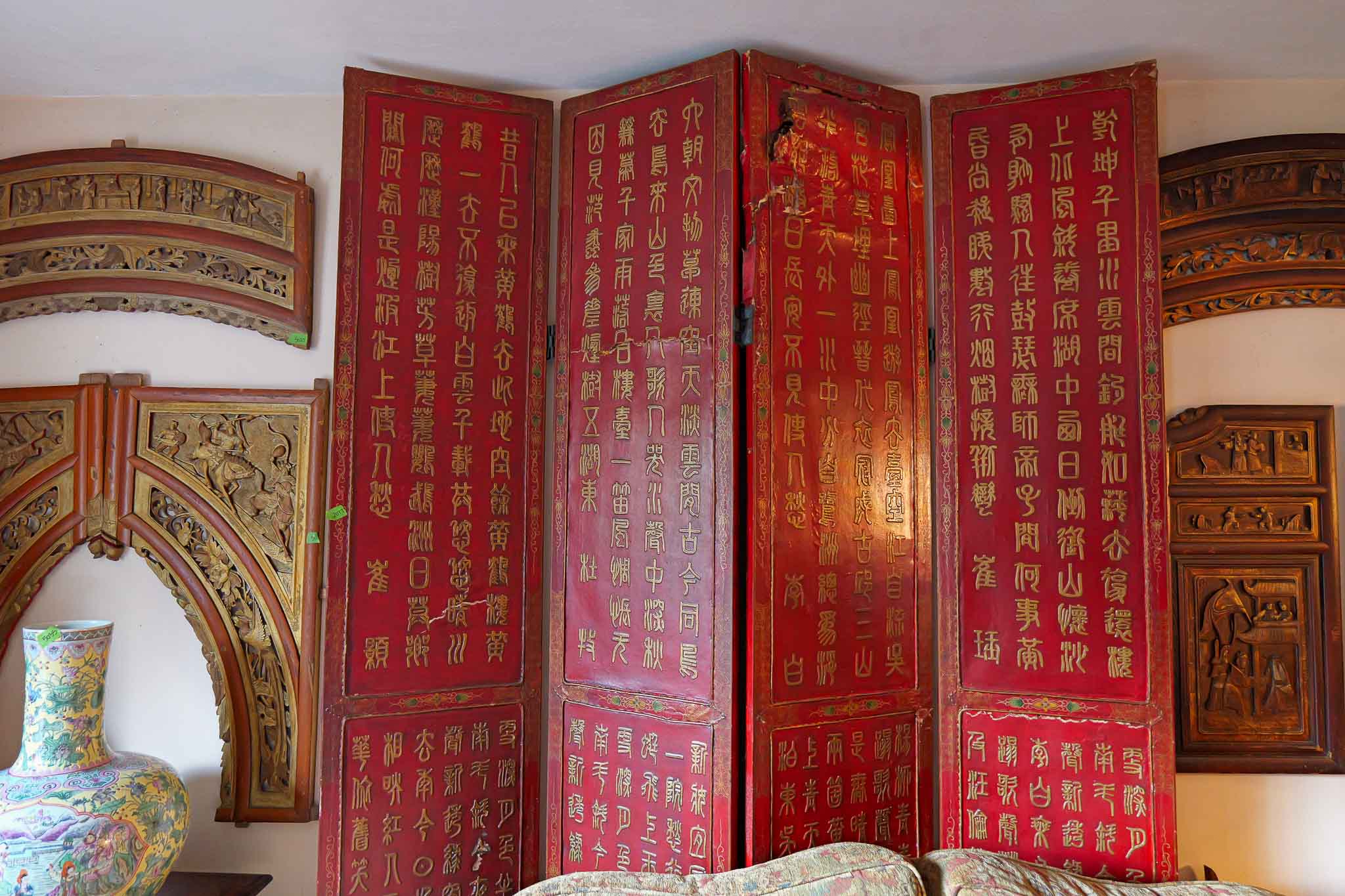 The panels showcase detailed Chinese script in gold against a deep red background, giving it a bold and authentic aesthetic commonly associated with traditional interiors. Ideal as a statement piece, backdrop, or functional room separator.