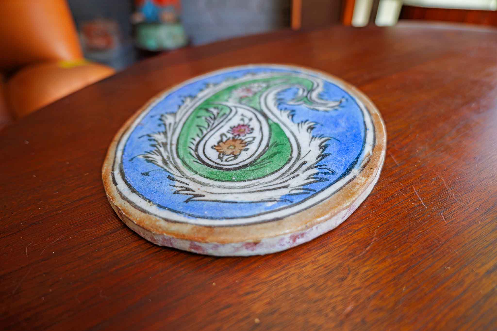 Antique Persian Qajar Style Oval Glazed Ceramic Tile Paisley Floral 10”