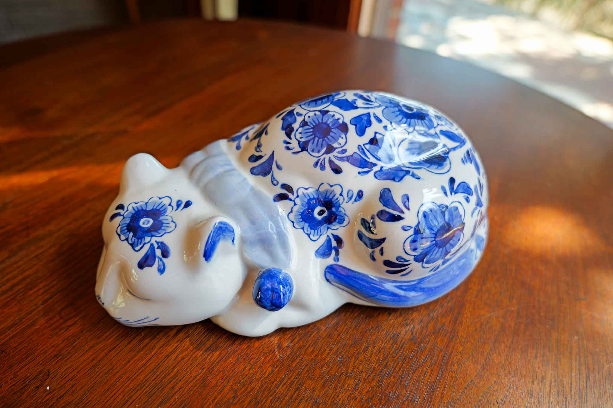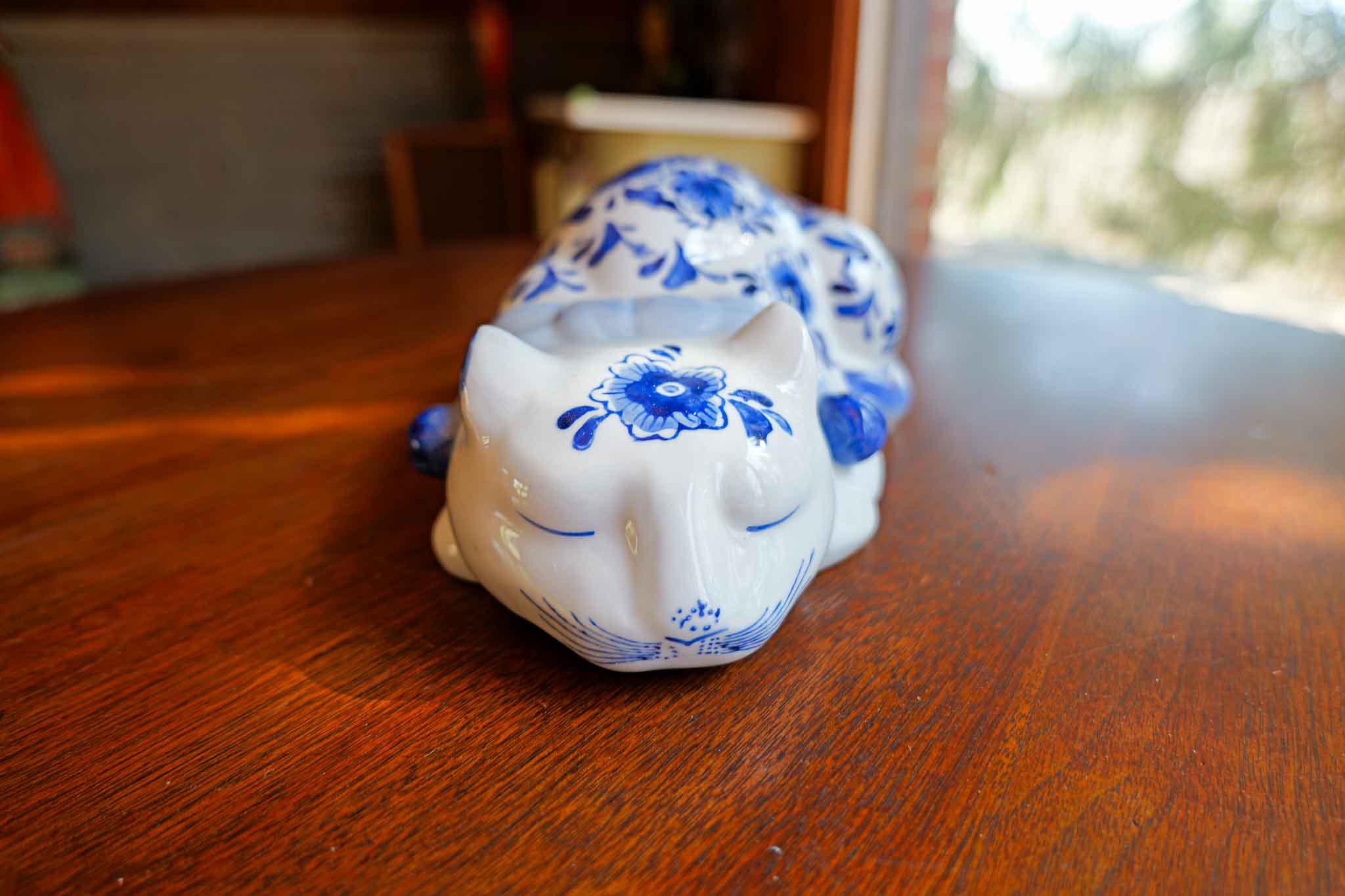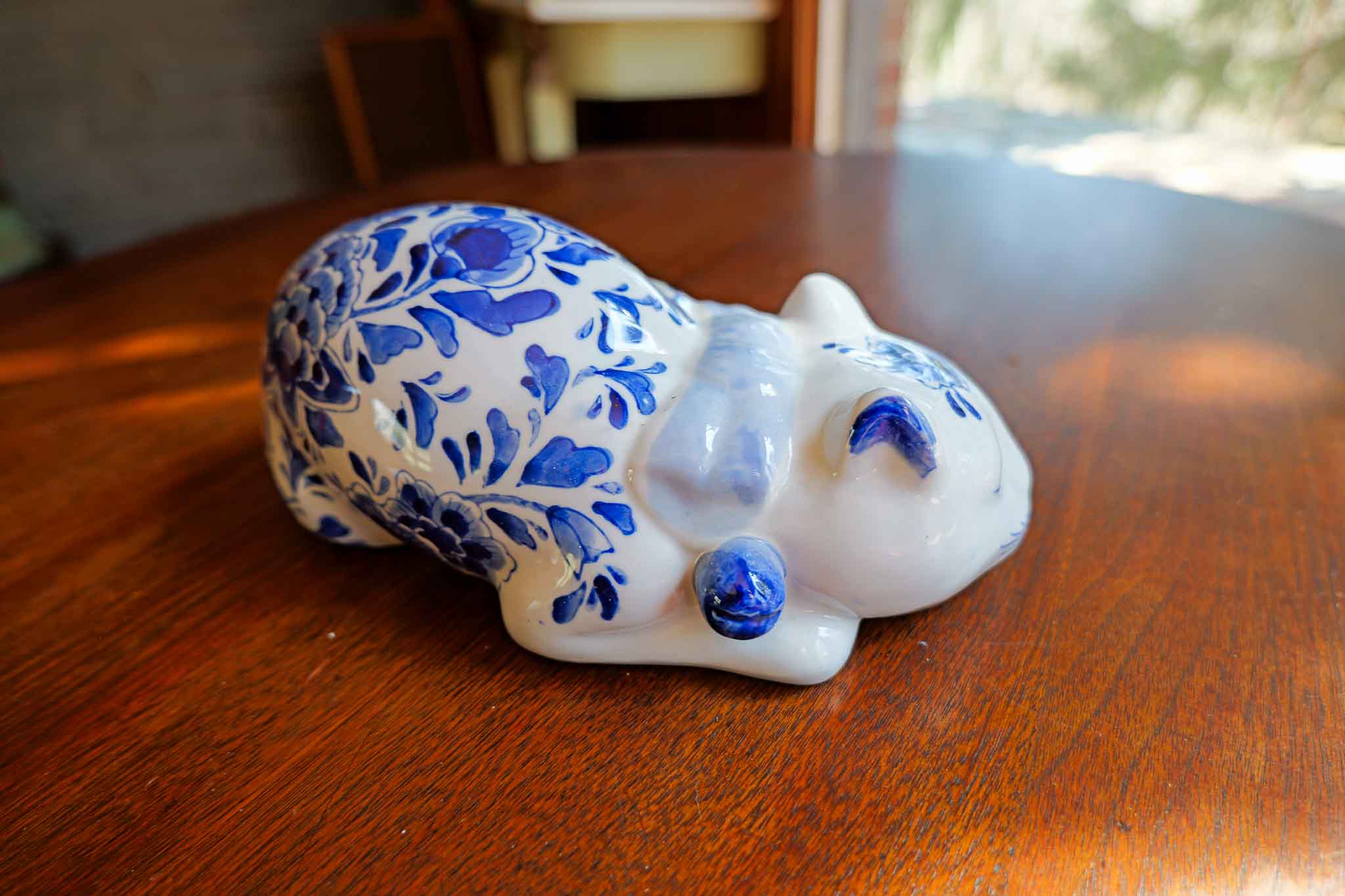 Charming blue and white porcelain figurine depicting a curled “sleeping cat,” decorated in a classic chinoiserie-style floral pattern. Features hand-painted cobalt-style detailing with a glossy glazed finish.