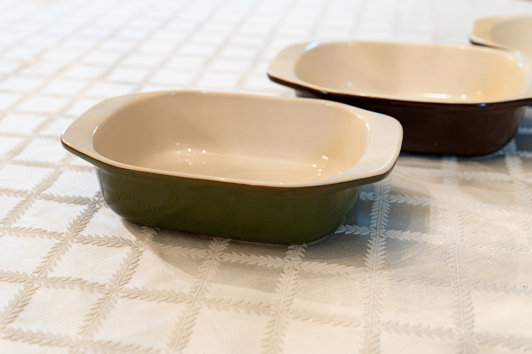 Durable and stylish Chantal stoneware cookware set, featuring 3 versatile baking/serving dishes in assorted colors (green and brown). Each piece is crafted from high-quality stoneware with cream-colored interiors, perfect for both oven-to-table serving and everyday use.
