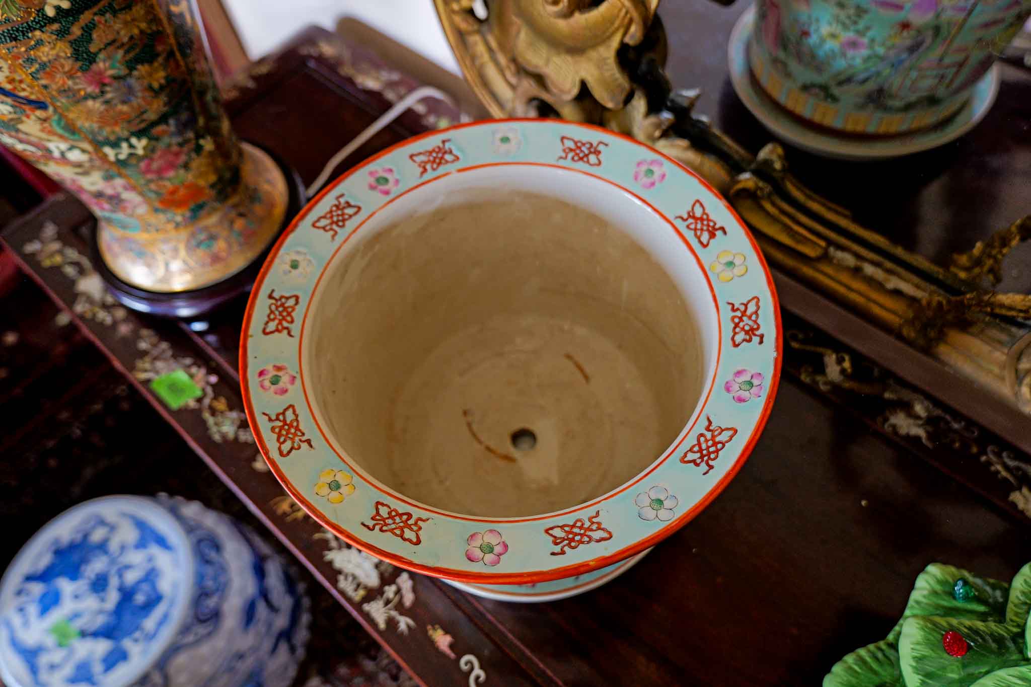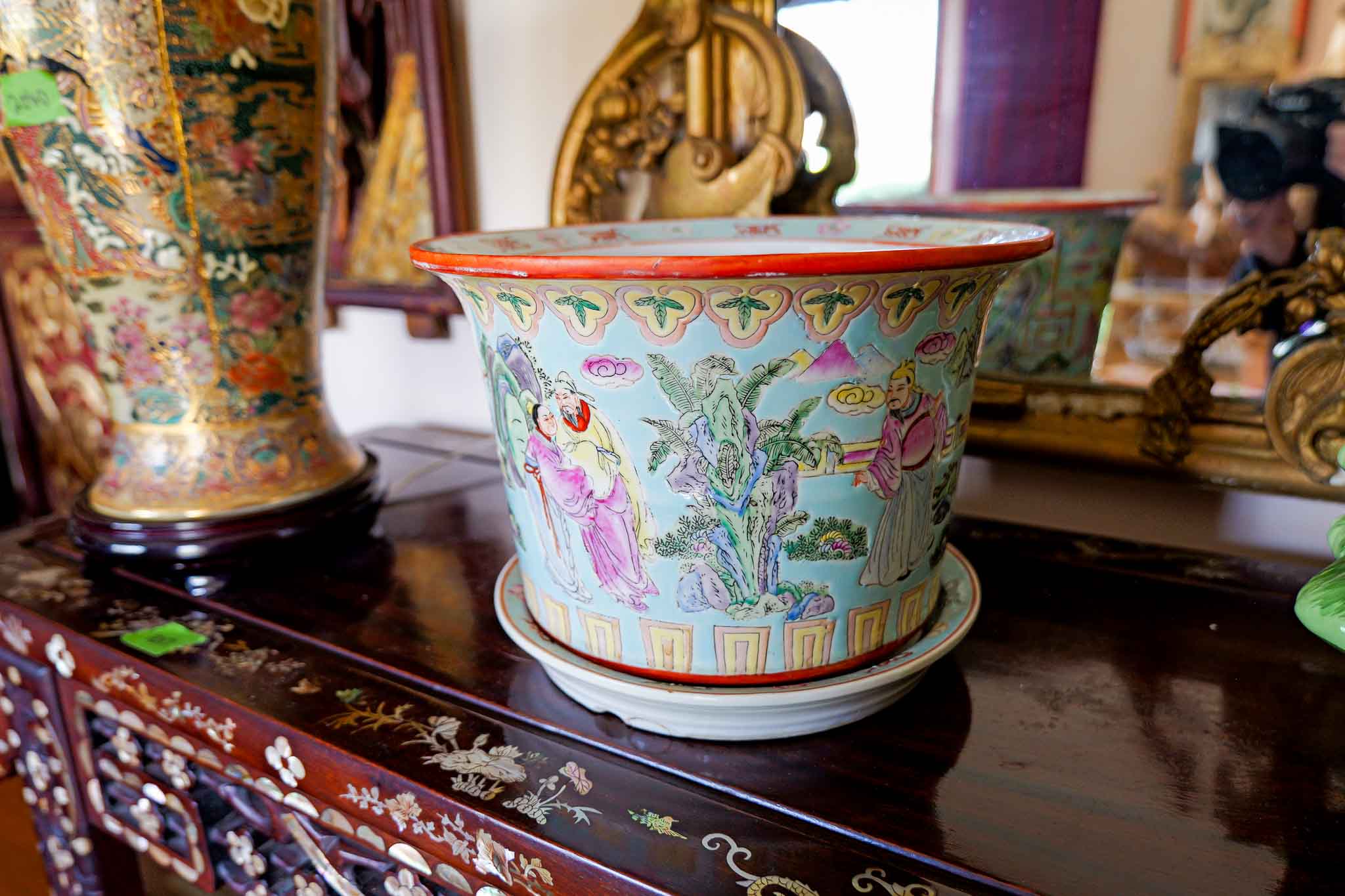 Chinese Famille Rose Porcelain Planter with Saucer 11” Hand Painted Figural Scene