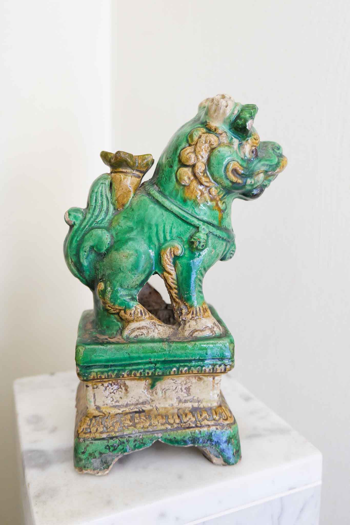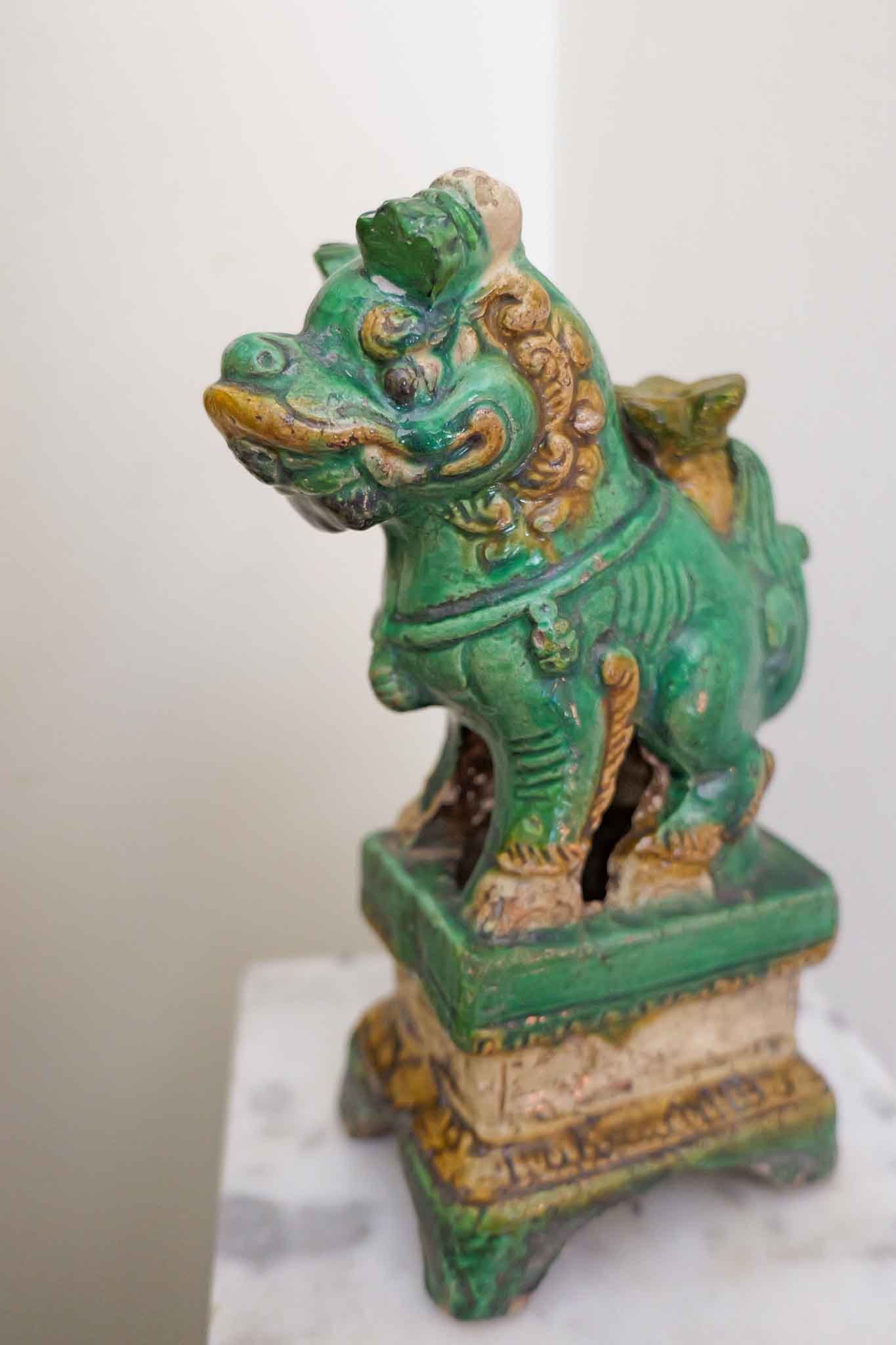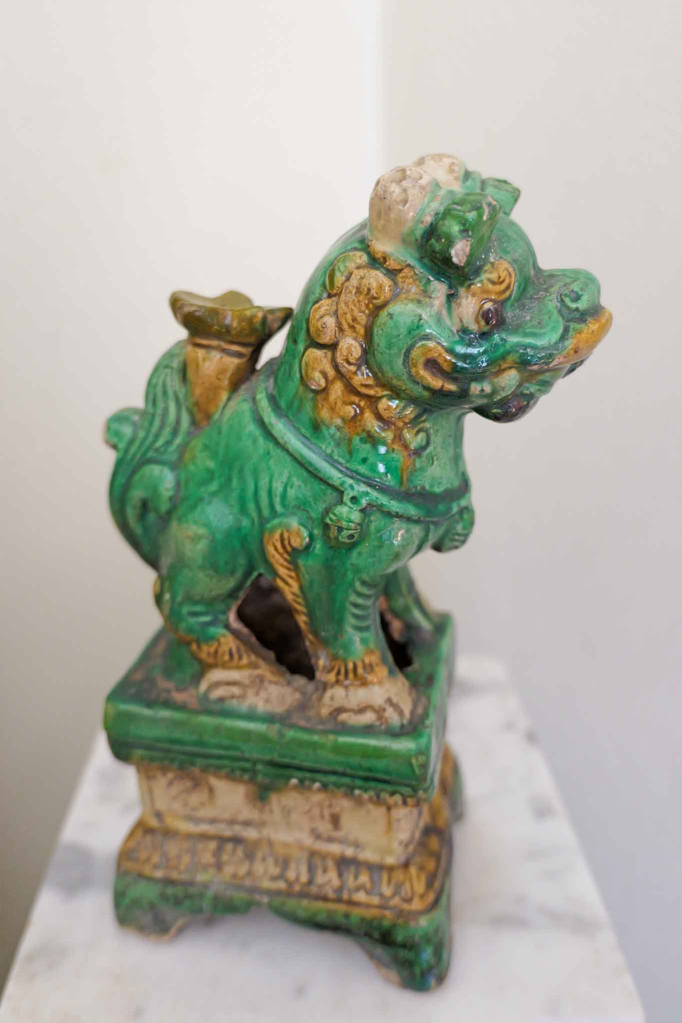 Foo dogs symbolize protection and are traditionally placed to guard homes and sacred spaces. This piece has a strong presence with detailed sculpting and rich glaze variation.