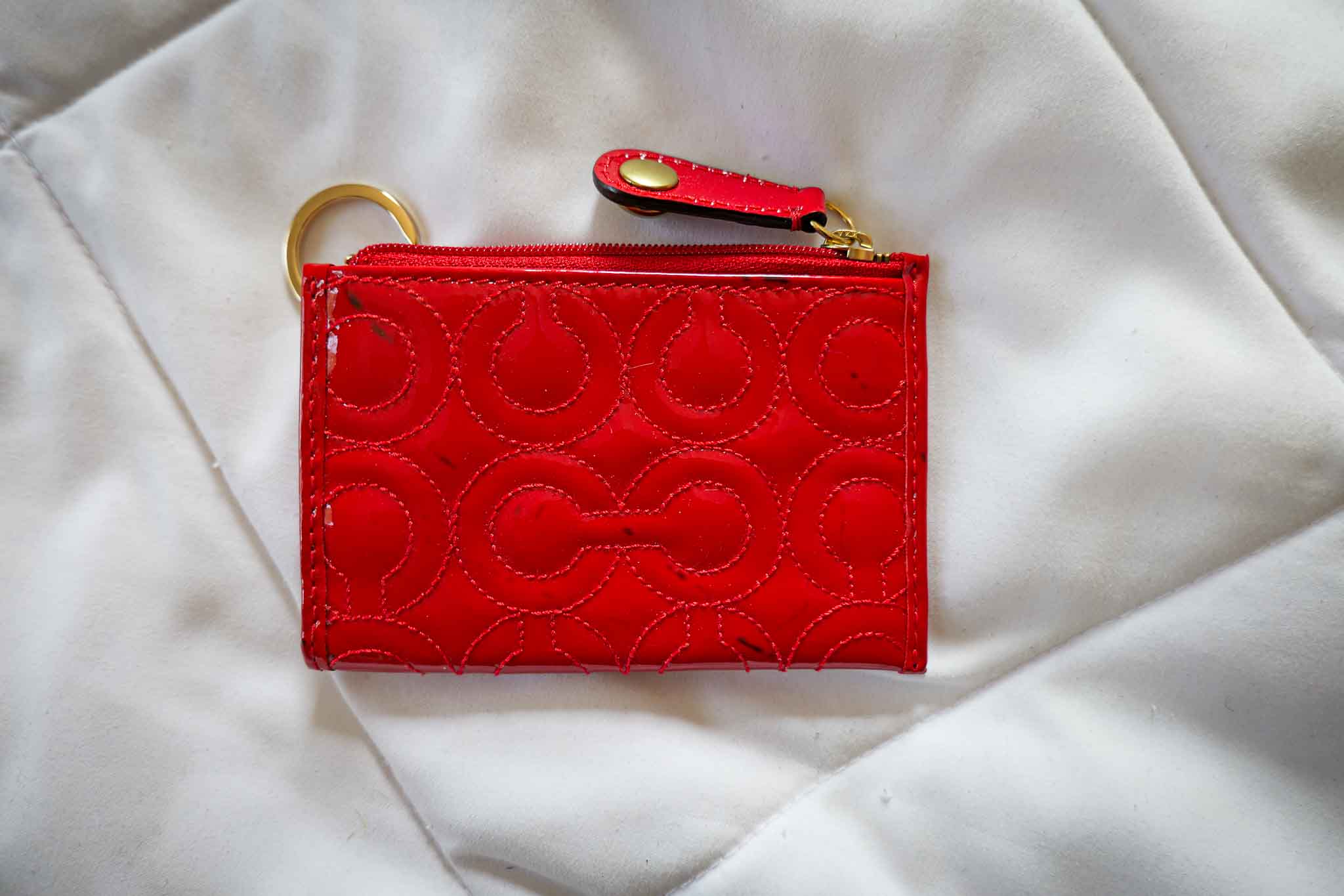 Coach Hot Pink Patent Leather Card Case Wallet Signature Embossed Key Ring Zip Coin