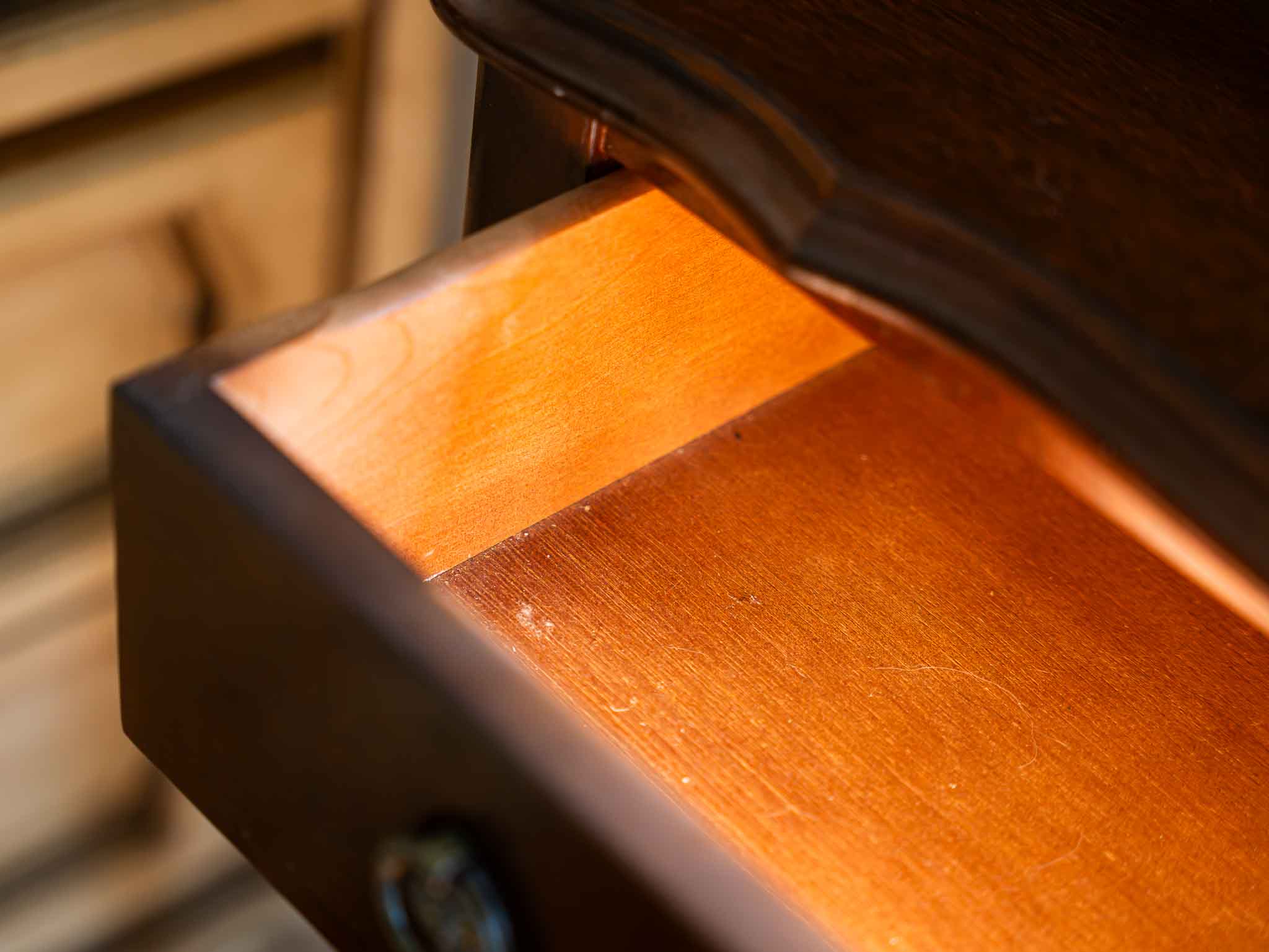 Simple but timeless look with warm wood tones and brass-style drawer pulls.