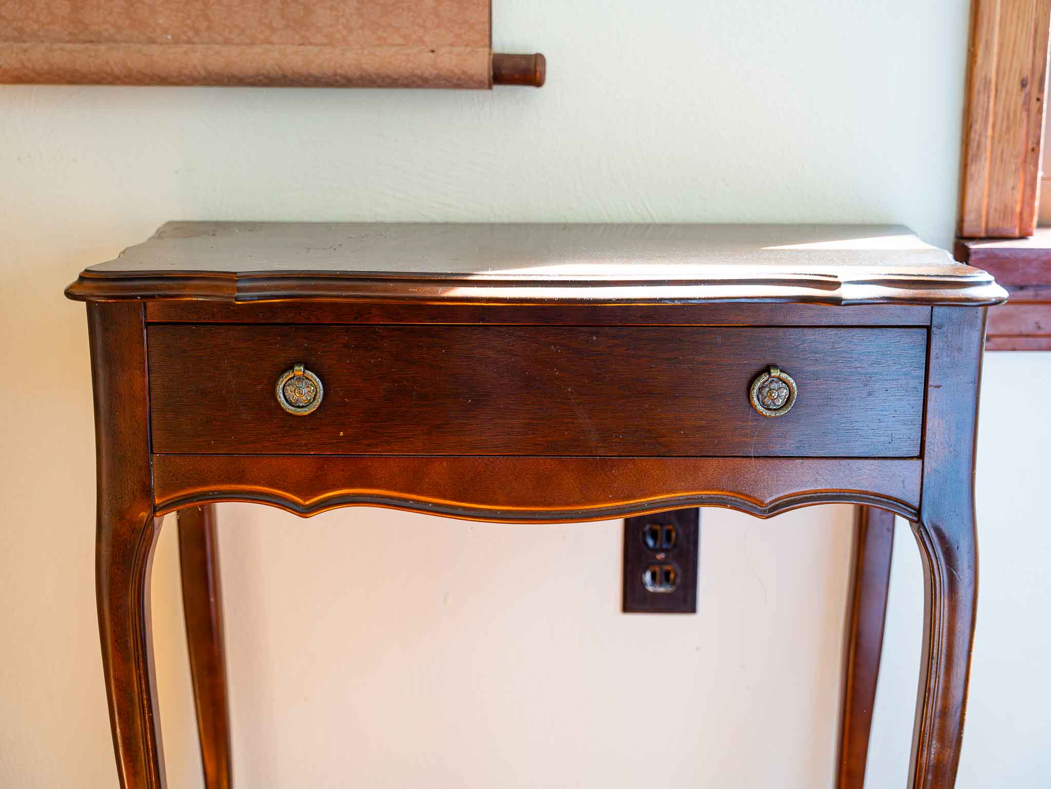 Dark Wood Vintage Side Table w/ Drawer – Curved Leg Accent Table