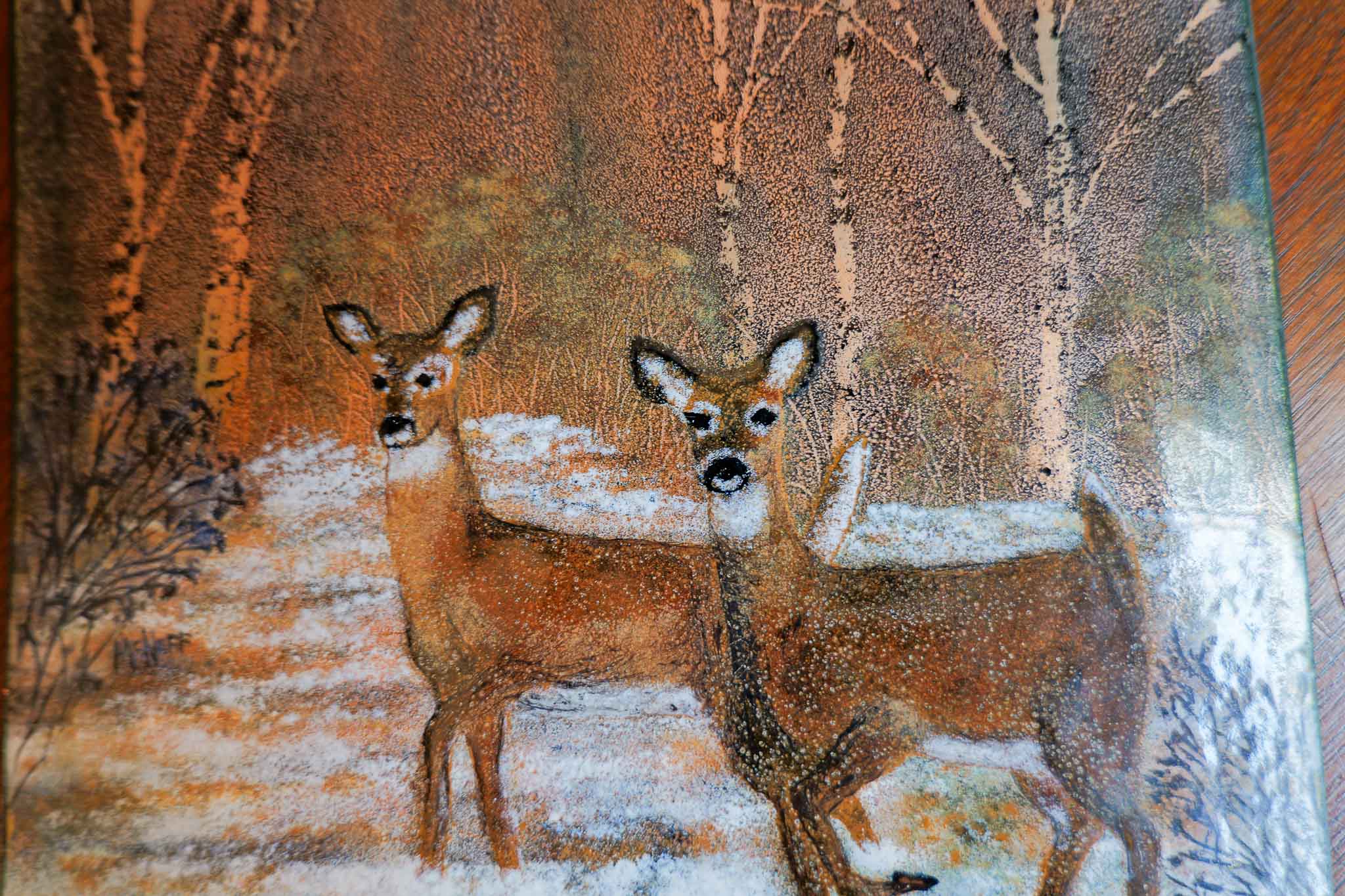 Textured decorative metal plaque featuring two deer standing in a wooded winter landscape. Rendered in warm earth tones with a raised, enamel-like finish that gives the piece depth and dimension.
