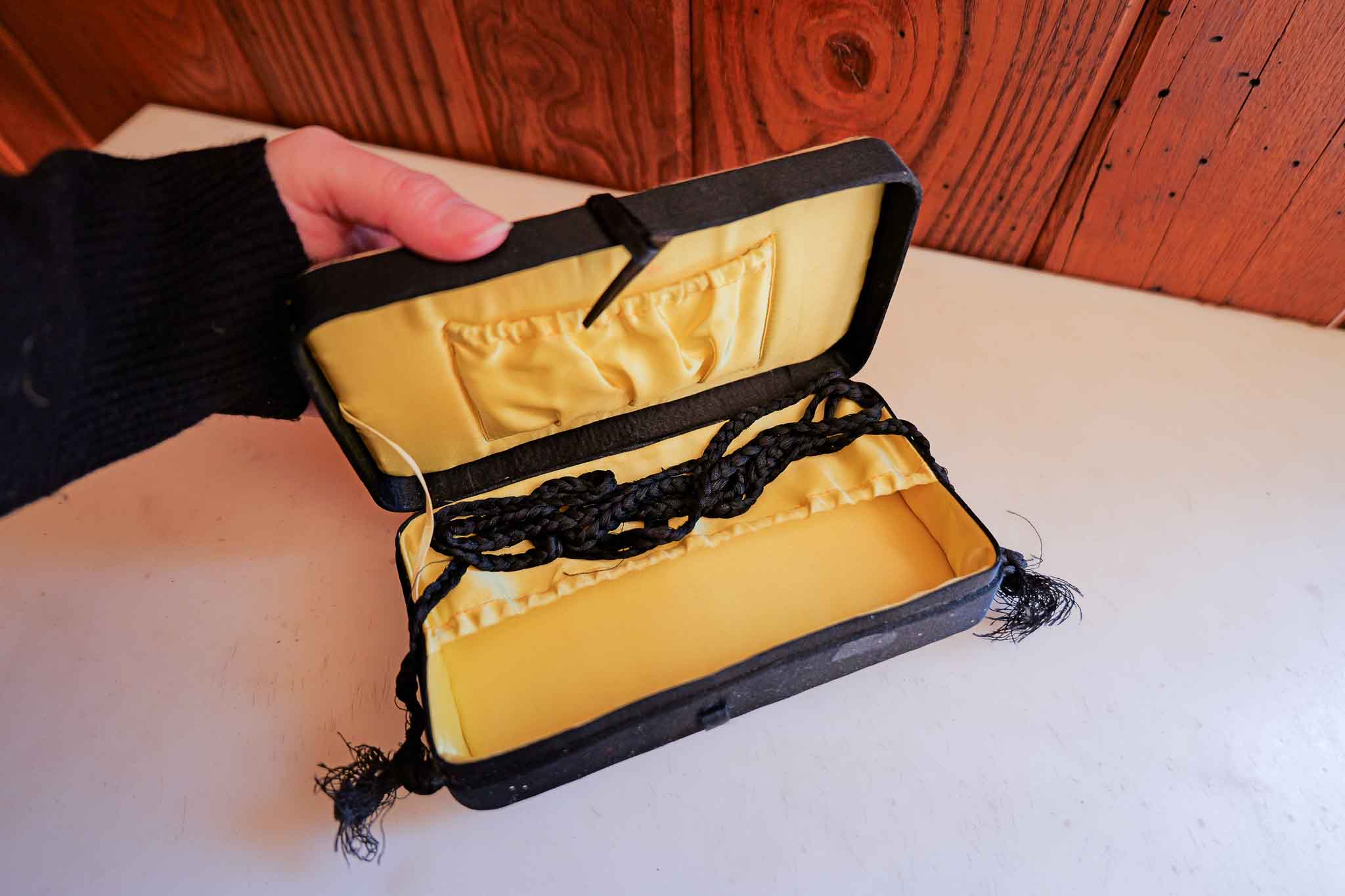 Good vintage condition with light wear consistent with age. Minor fraying to the braided cord and slight surface wear to exterior/interior lining. Clasp and structure remain intact and functional.