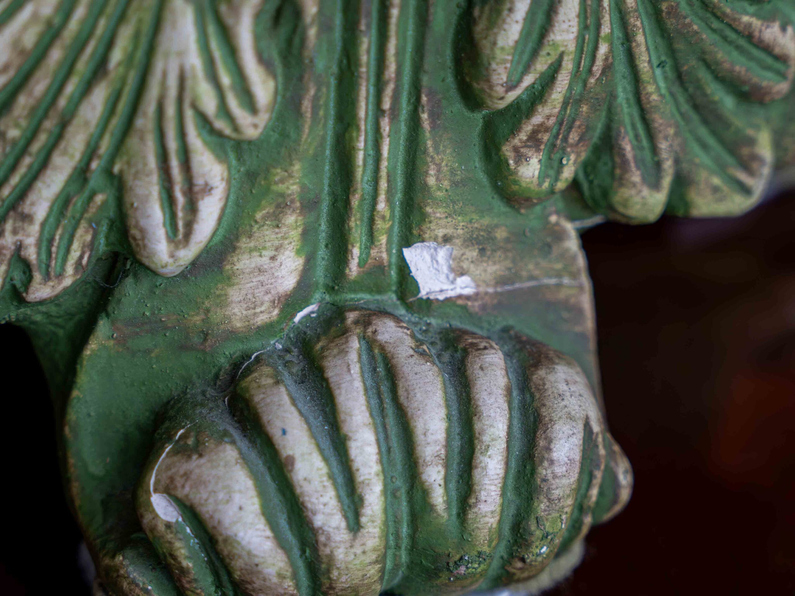 Elegant Ethan Allen green ceramic vase with ornate relief leaf designs, complete with a large silk floral arrangement in rich tones of red, cream, and gold. A striking accent piece perfect for entryways, dining rooms, or formal living areas.