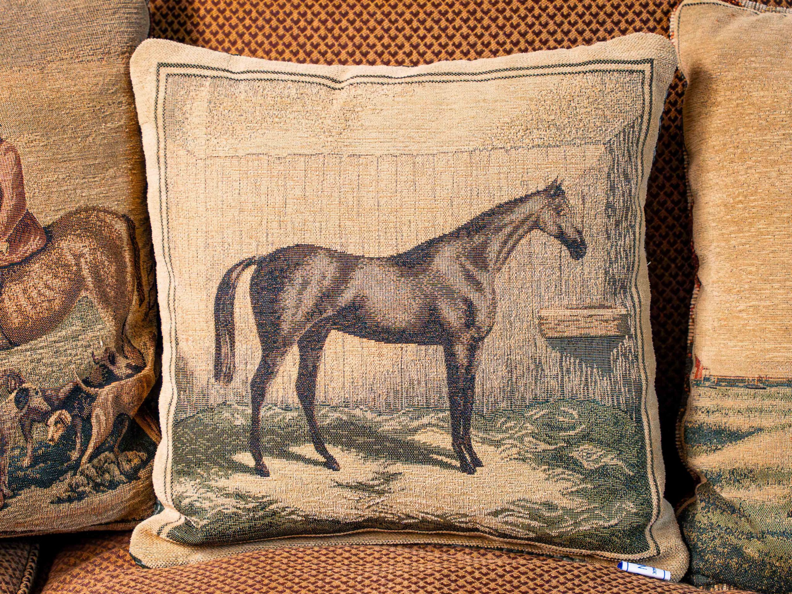 Elegant tapestry-style Ethan Allen pillow collection featuring equestrian and countryside themes. Each pillow is finely woven with detailed scenes — two larger pillows showcase fox hunting and country estate motifs, while the smaller pillow features a classic horse portrait. Excellent for traditional or English country interiors.
