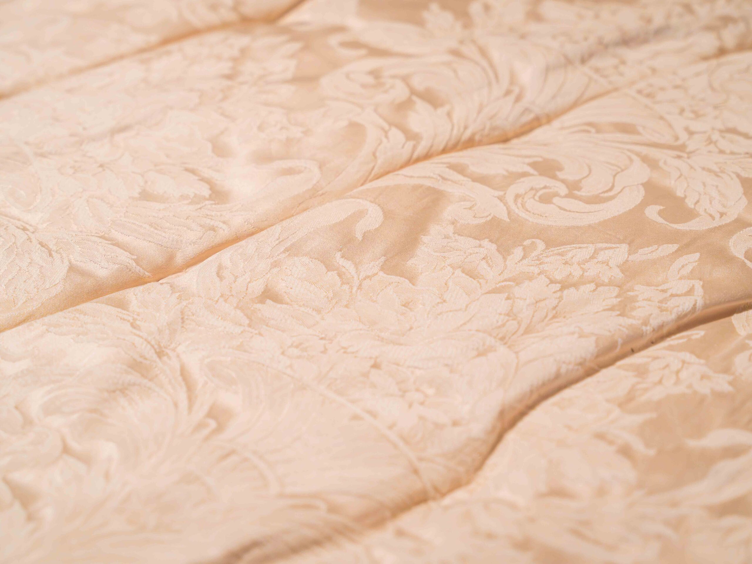 - High-quality Ethan Allen bedding in elegant cream damask pattern