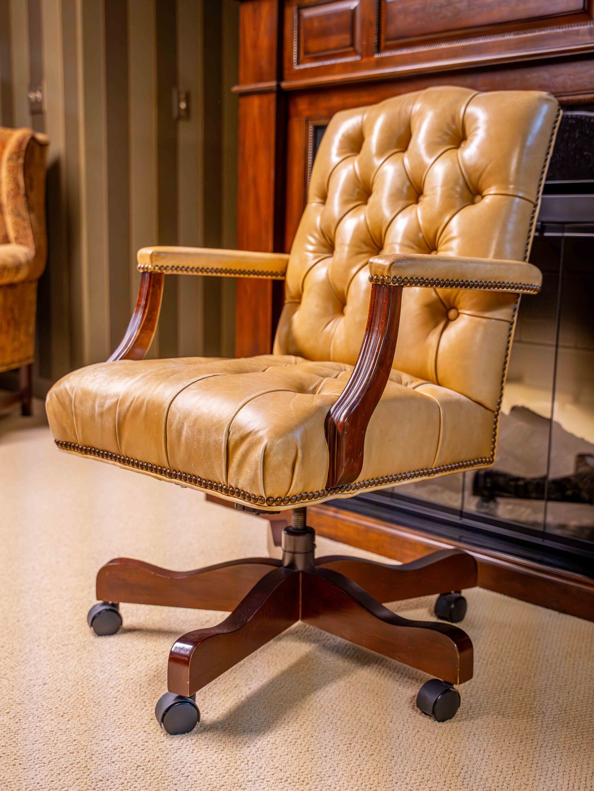 Handsome Ethan Allen office chair upholstered in rich tan leather with tufted back and seat. Features wooden arms with carved detail, nailhead trim, and a sturdy swivel base on casters for mobility. A perfect blend of executive style and Ethan Allen craftsmanship, offering both comfort and durability.