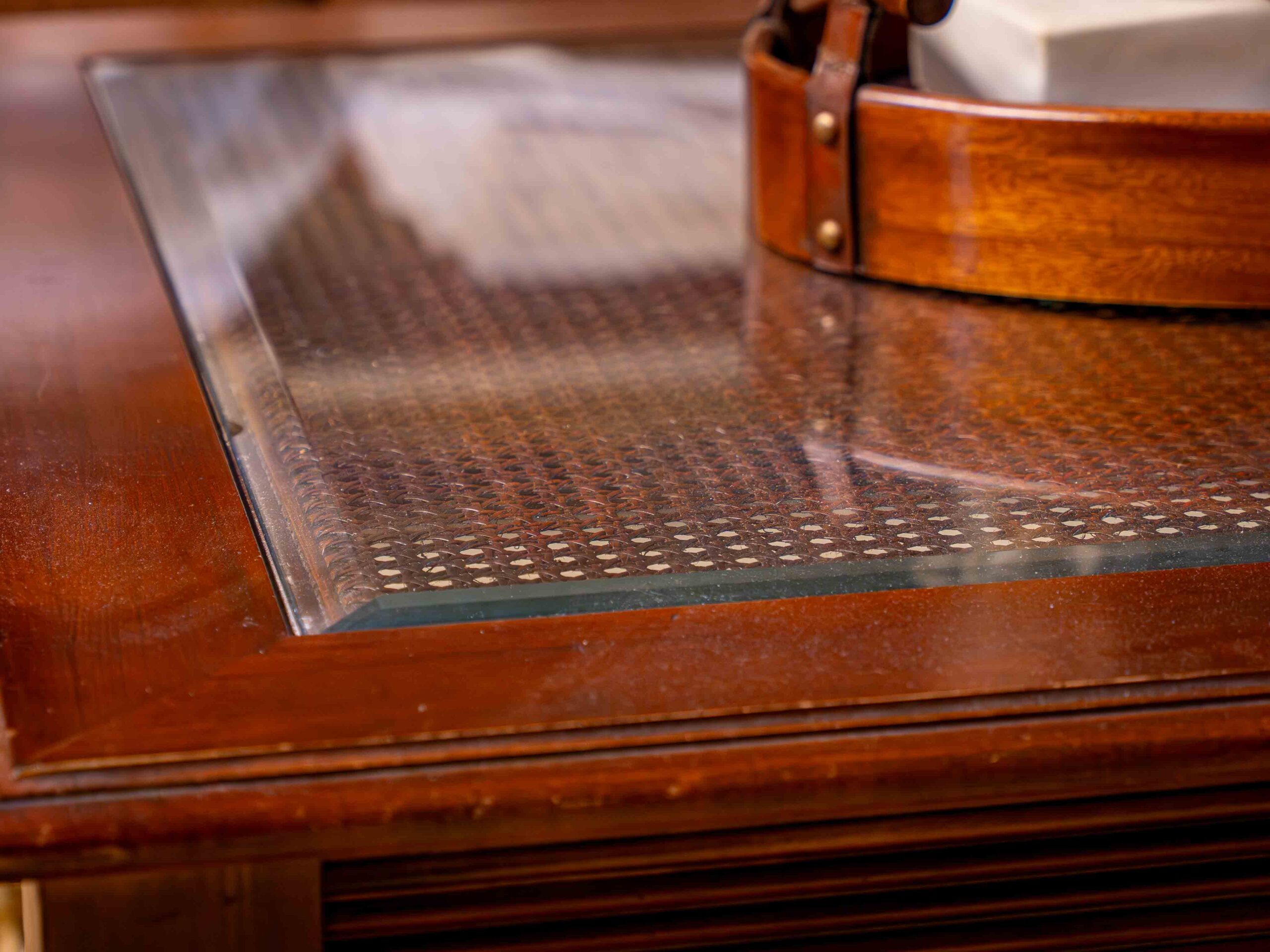 Elegant Ethan Allen coffee table crafted in rich wood with a beveled glass inset top. Features turned legs on casters for easy mobility and a fluted apron for added detail. A sturdy and stylish centerpiece for any living room, combining timeless design with Ethan Allen craftsmanship.