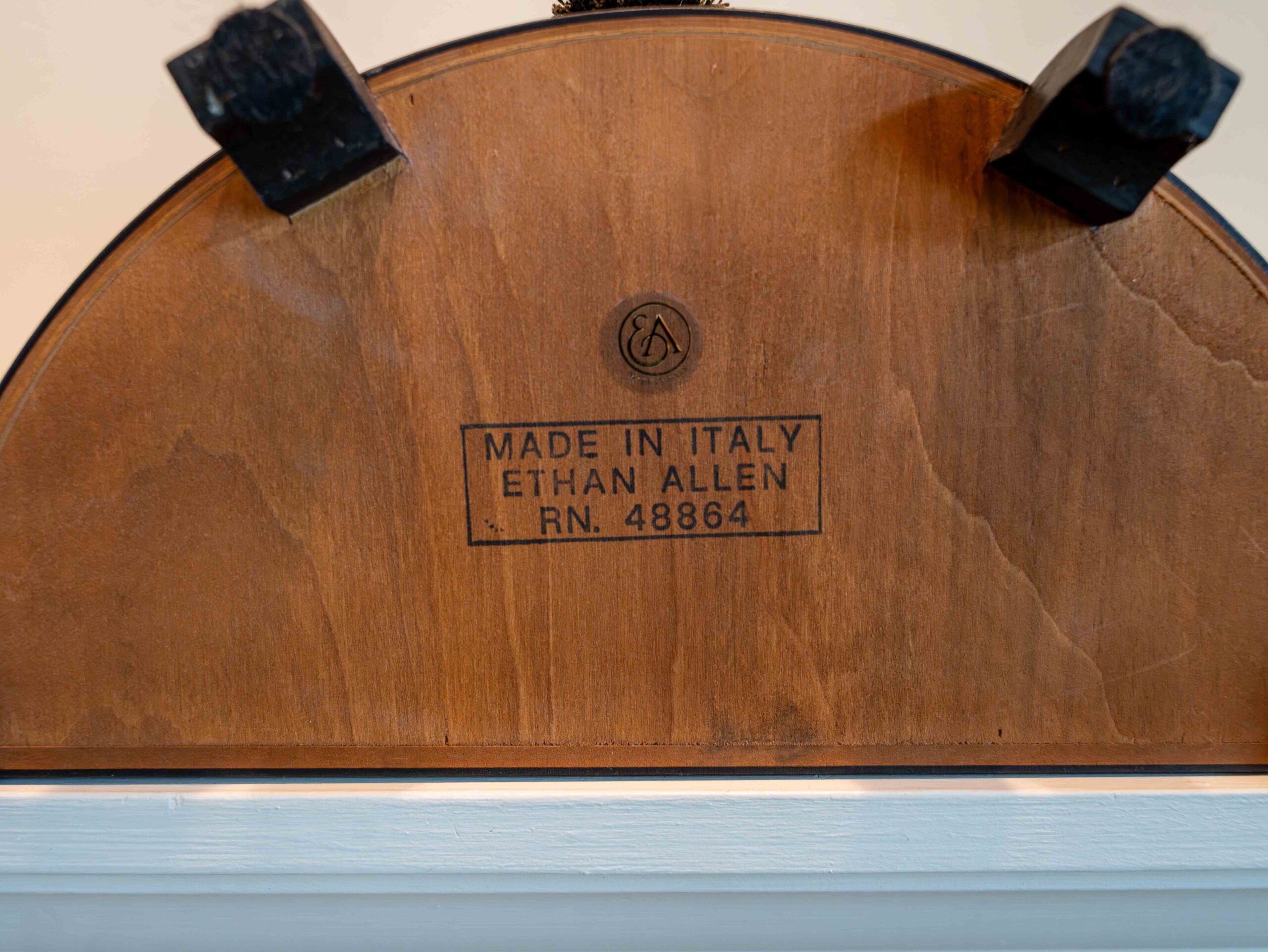 Elegant Ethan Allen wooden trinket box with a smooth curved front and rich wood grain finish. Features a decorative green tassel on the front and rests on sturdy black feet, making it both functional and stylish for storage or display.