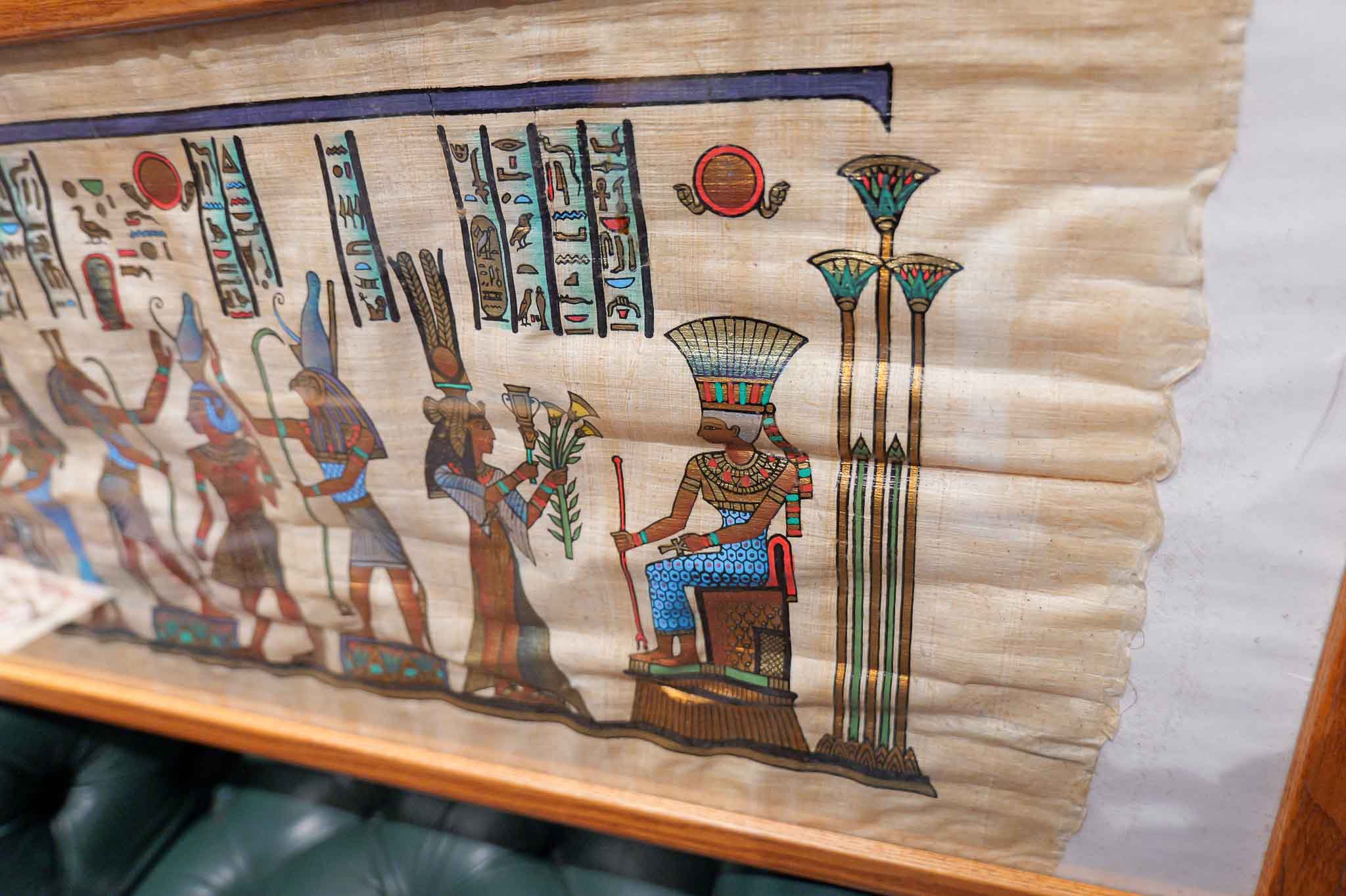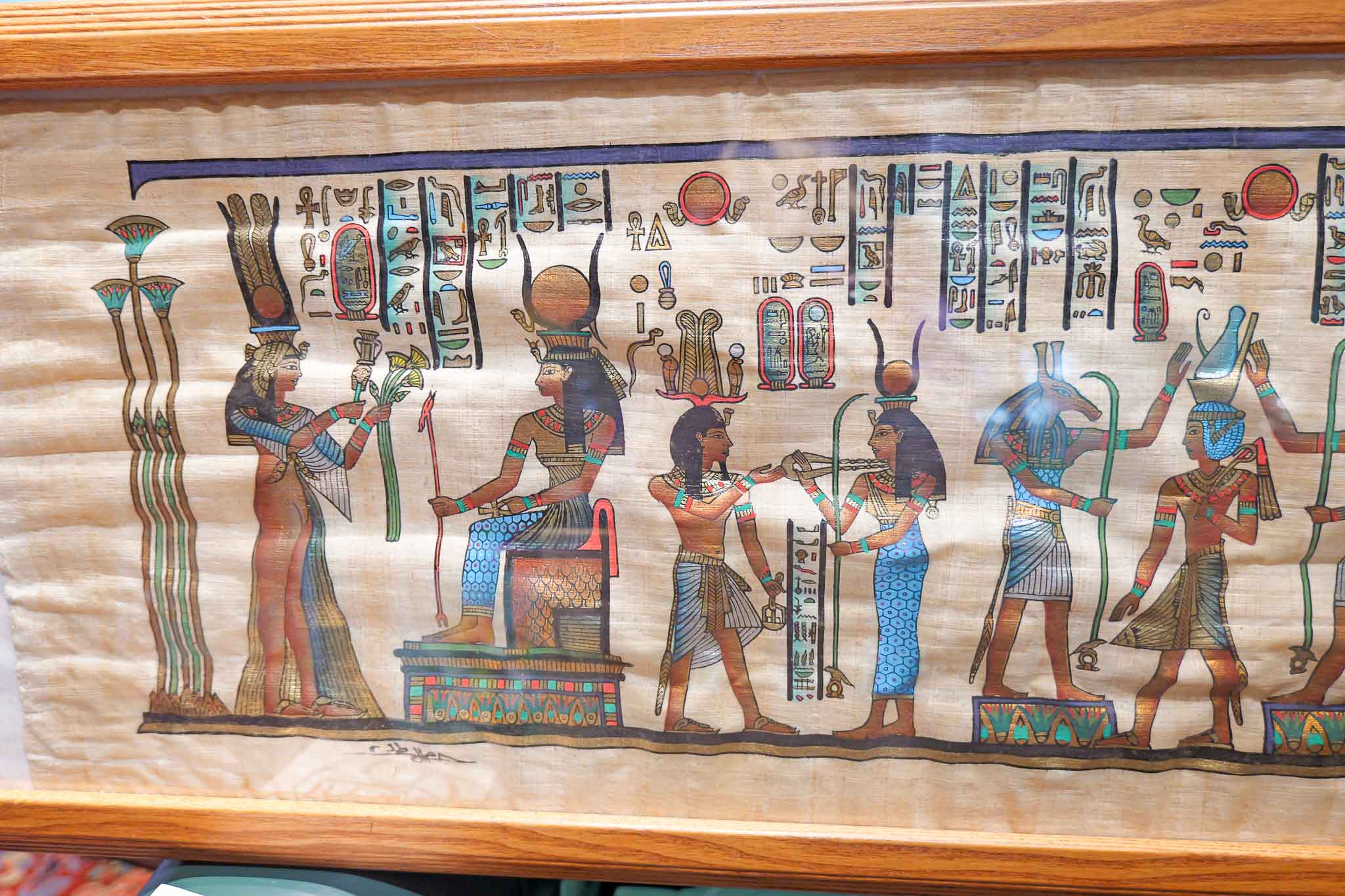 Framed Egyptian Papyrus Painting – Hieroglyphics & Deity Scene (14.5” x 38”)
