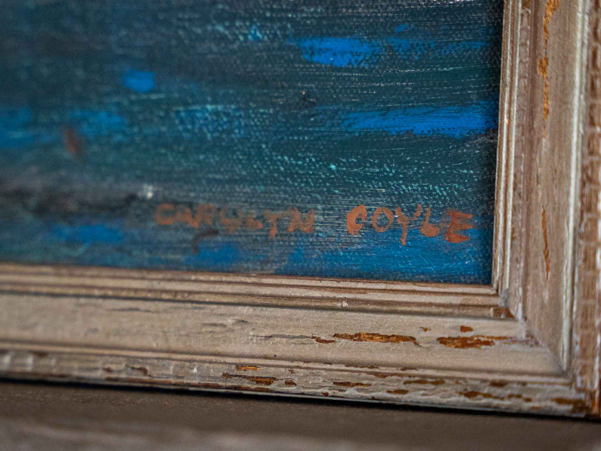 Vintage framed painting by artist Carolyn Doyle, featuring two classic steamboats cruising along a river.