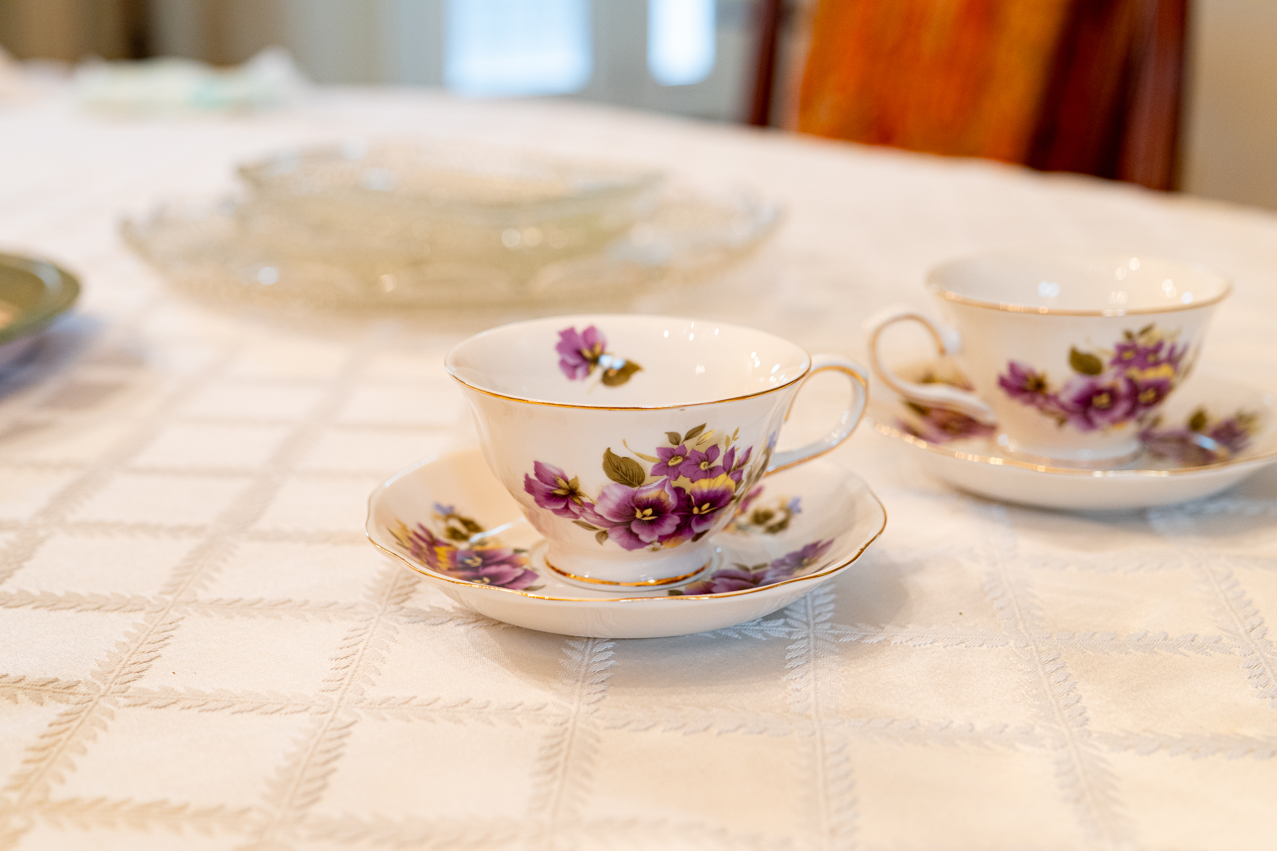 Elegant Gracie China by Coastline Imports teacup set featuring a charming purple floral design with delicate gold trim. This set includes: