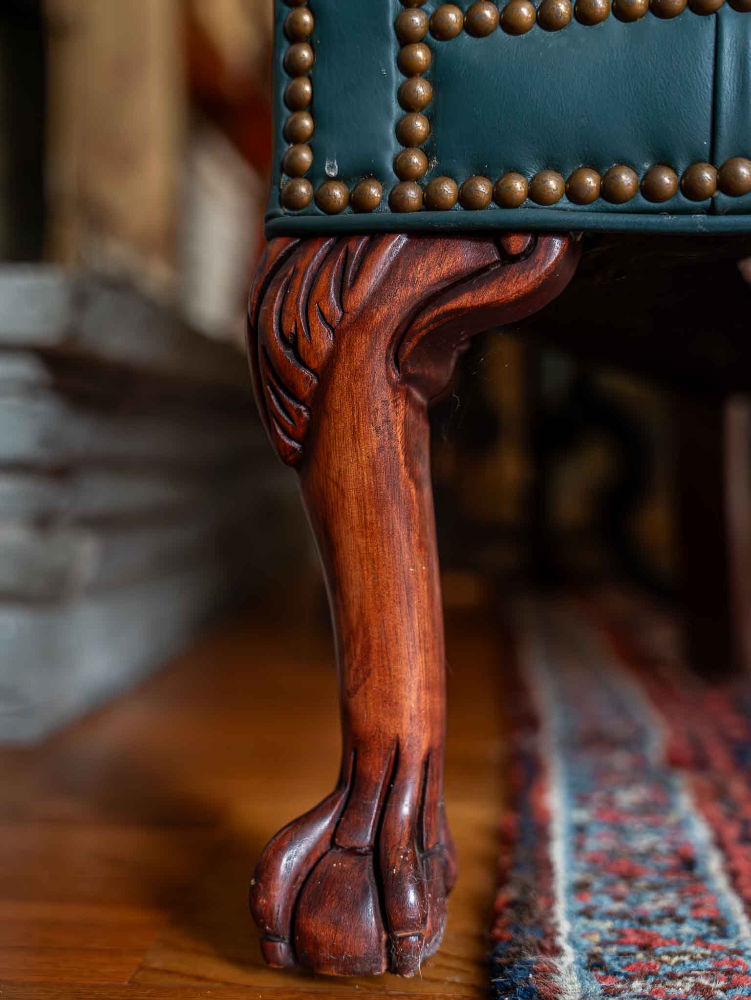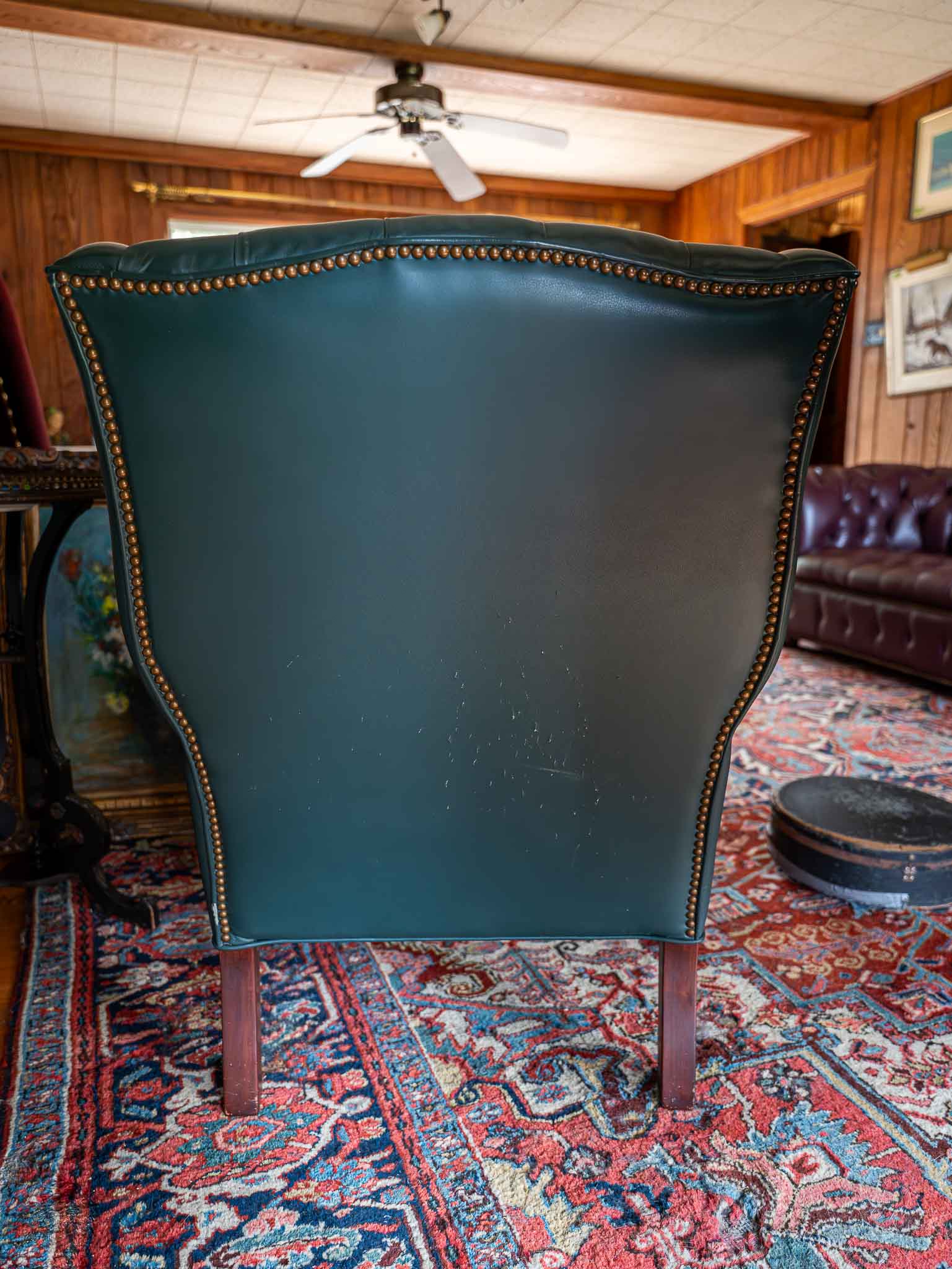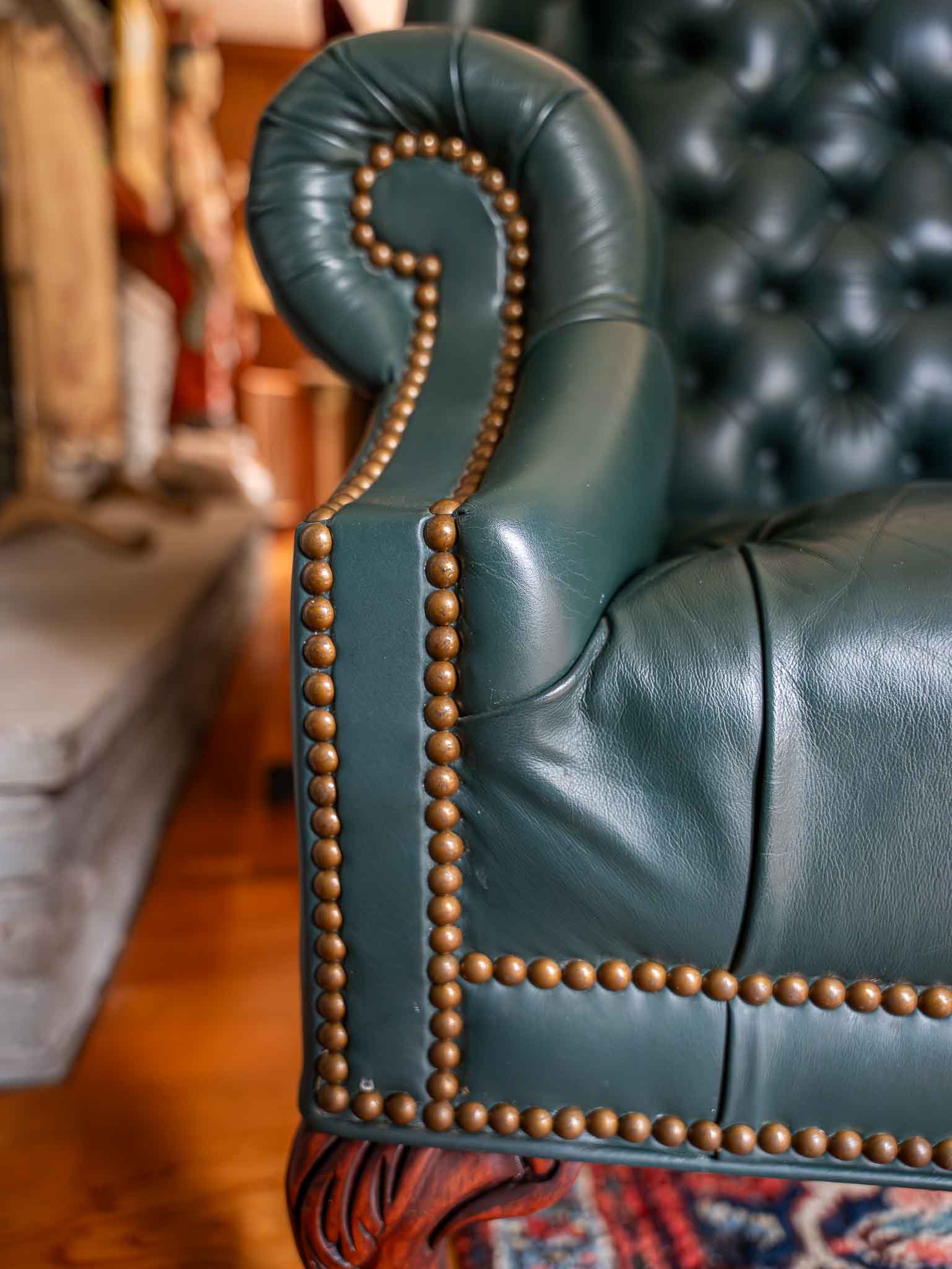 Classic green leather wingback armchair featuring deep button tufting, rolled arms, and decorative nailhead trim throughout. The chair sits on carved wood claw-style legs, giving it a timeless traditional look.