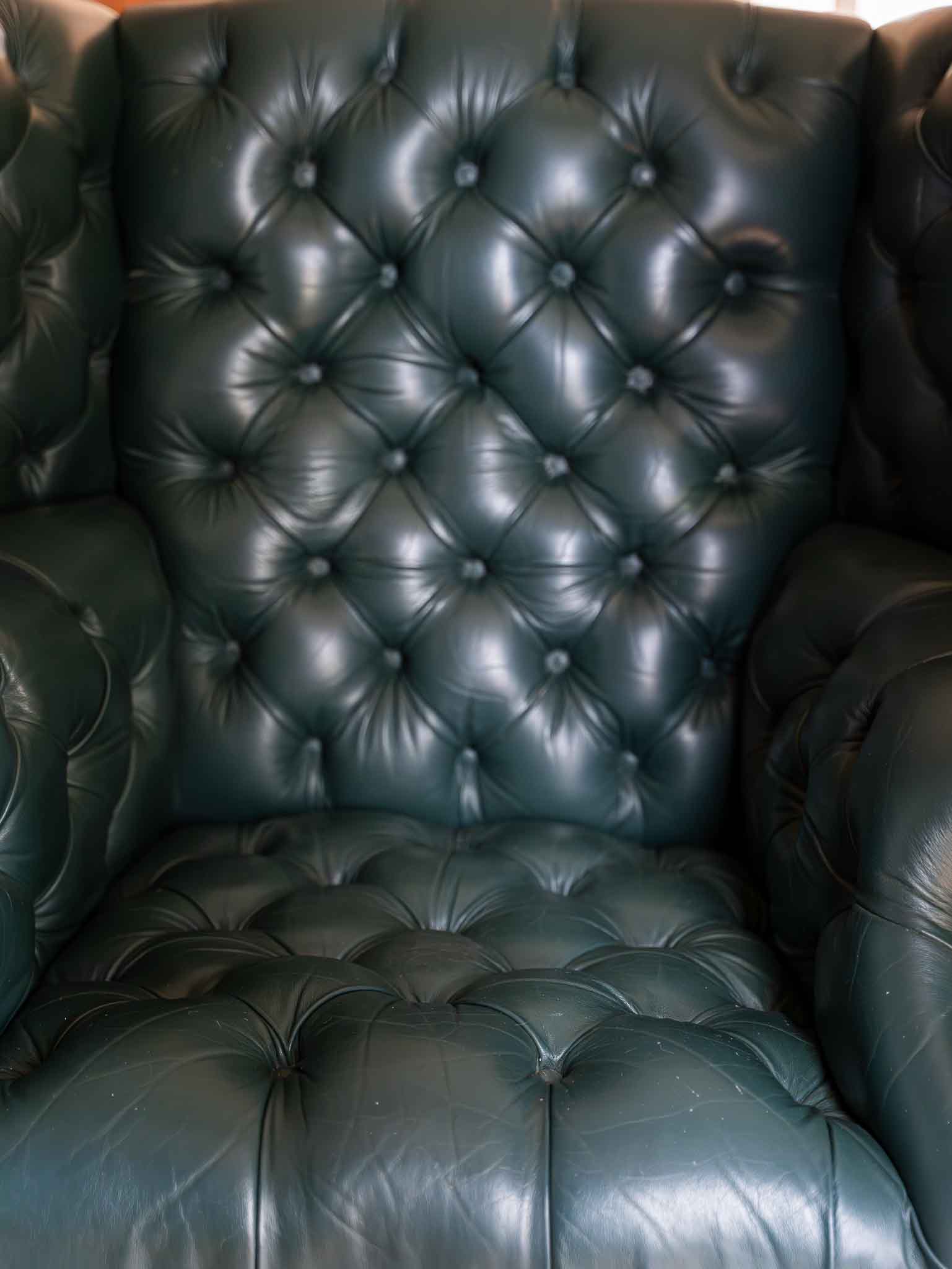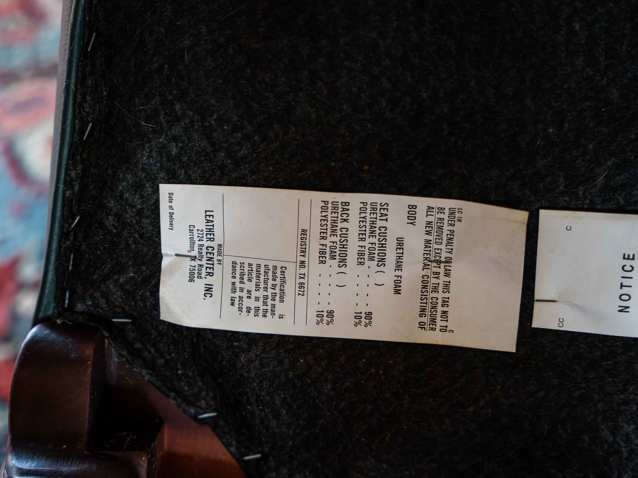 Measures approximately 39” high, 32” wide, and 28.5” deep. Rich green leather upholstery with a high back and supportive seat.