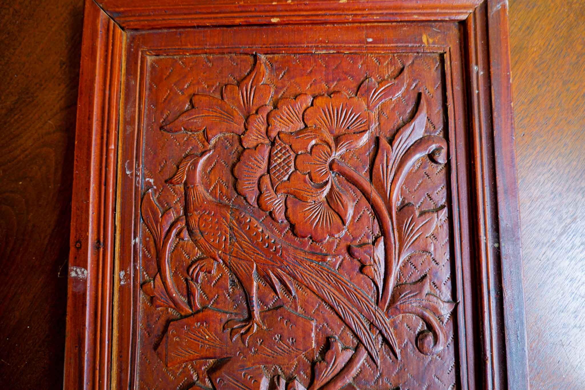 Hand-Carved Wooden Panel with Bird & Floral Motif – Framed Asian Relief Wall Art