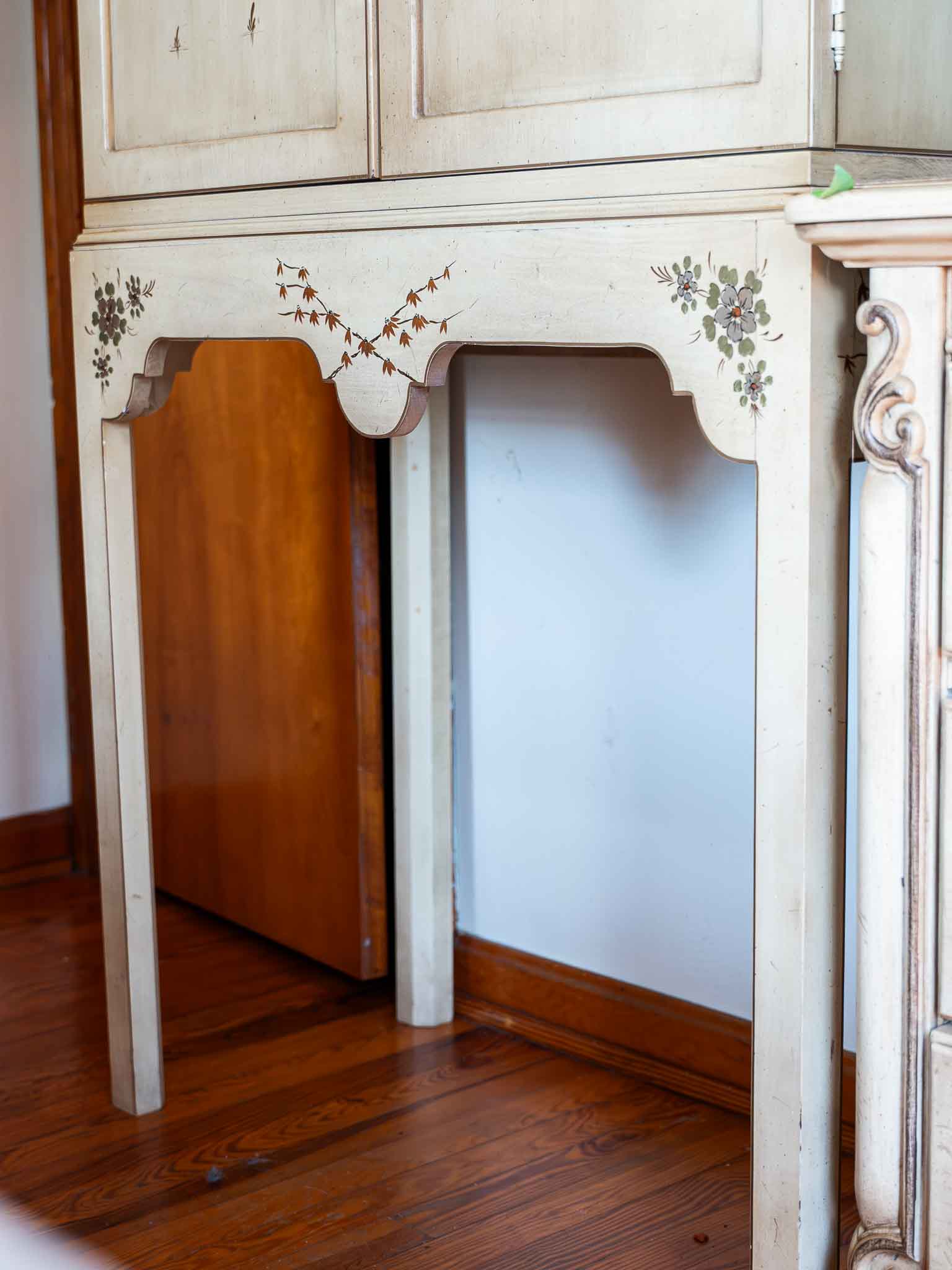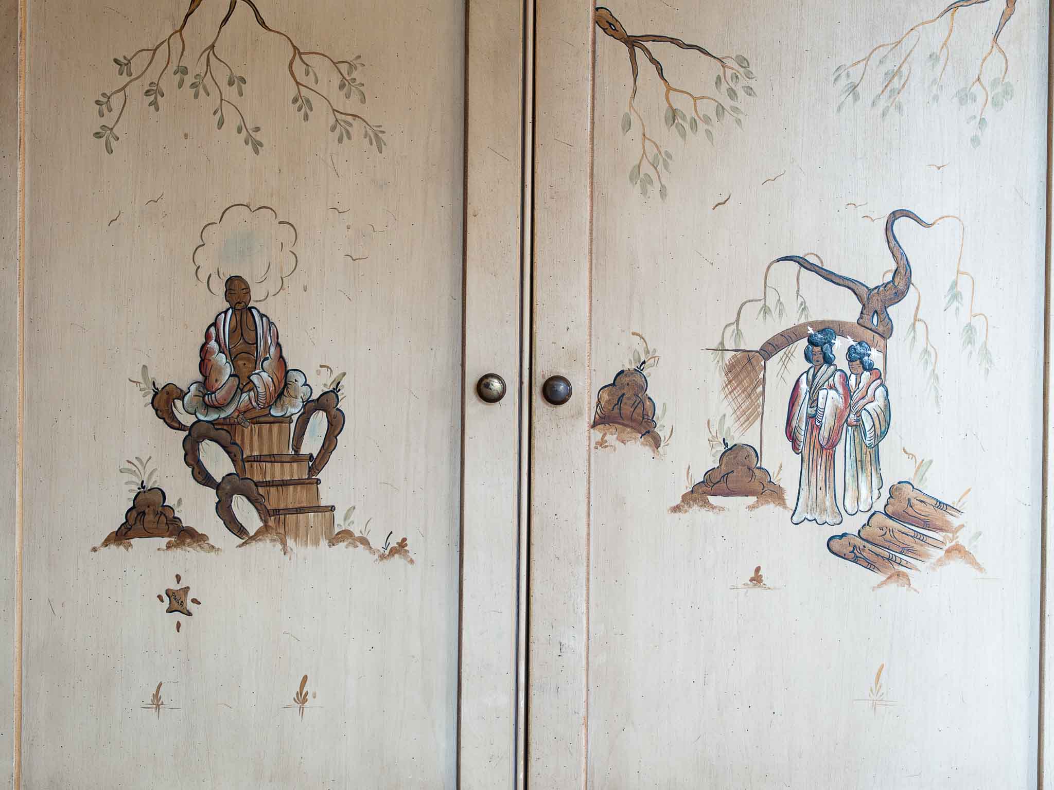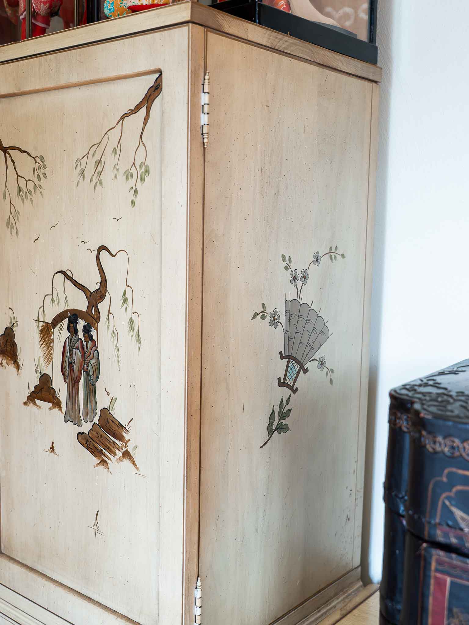 Elegant light wood cabinet featuring hand-painted oriental-style detailing and a unique tall-leg design. This piece has a clean, airy look with subtle artwork on the doors and base, making it perfect for decorative storage or accent use.