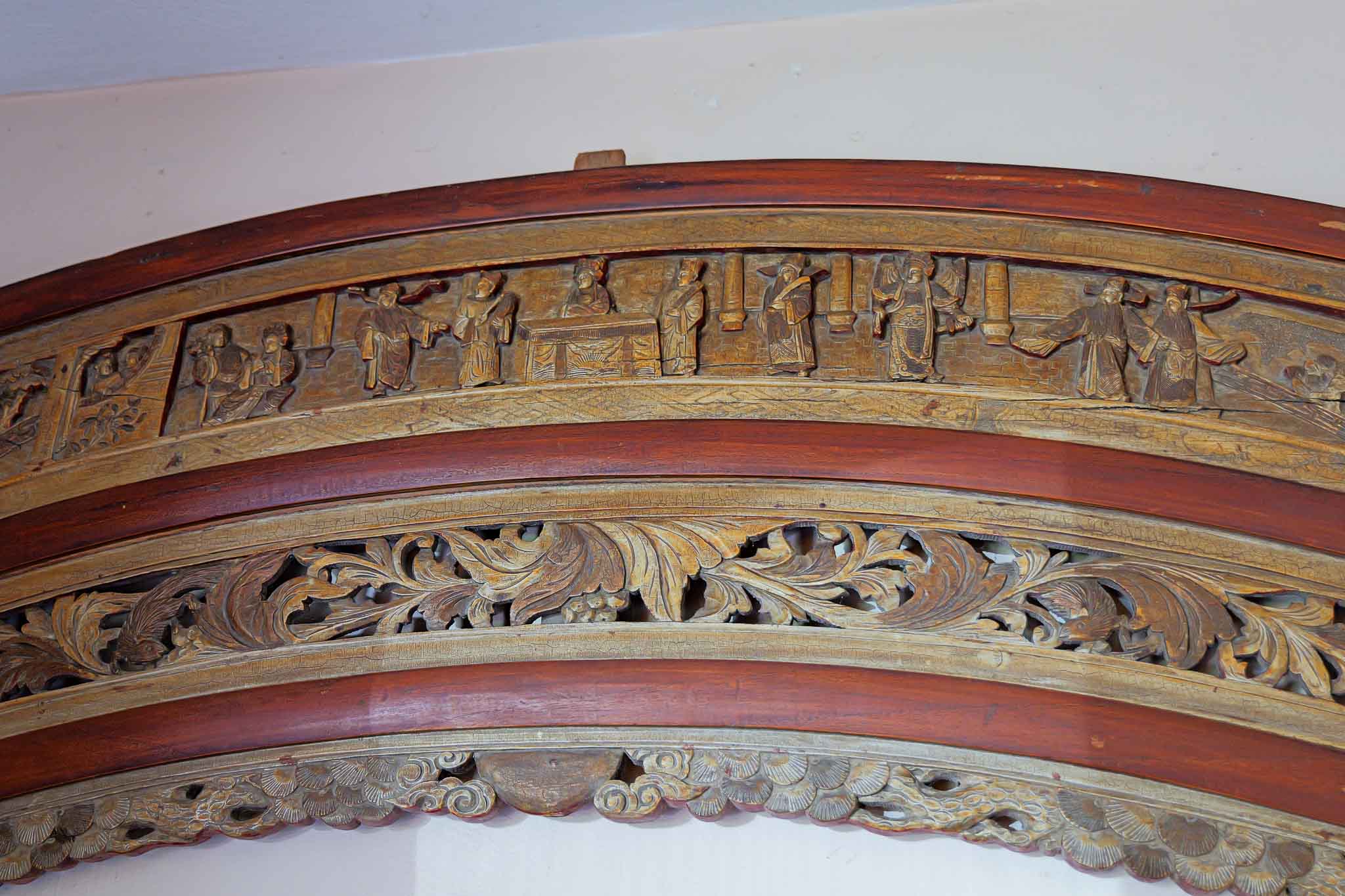 Large Antique Chinese Hand-Carved Arched Wooden Panel – Figural Scene Relief, Architectural Wall Decor
