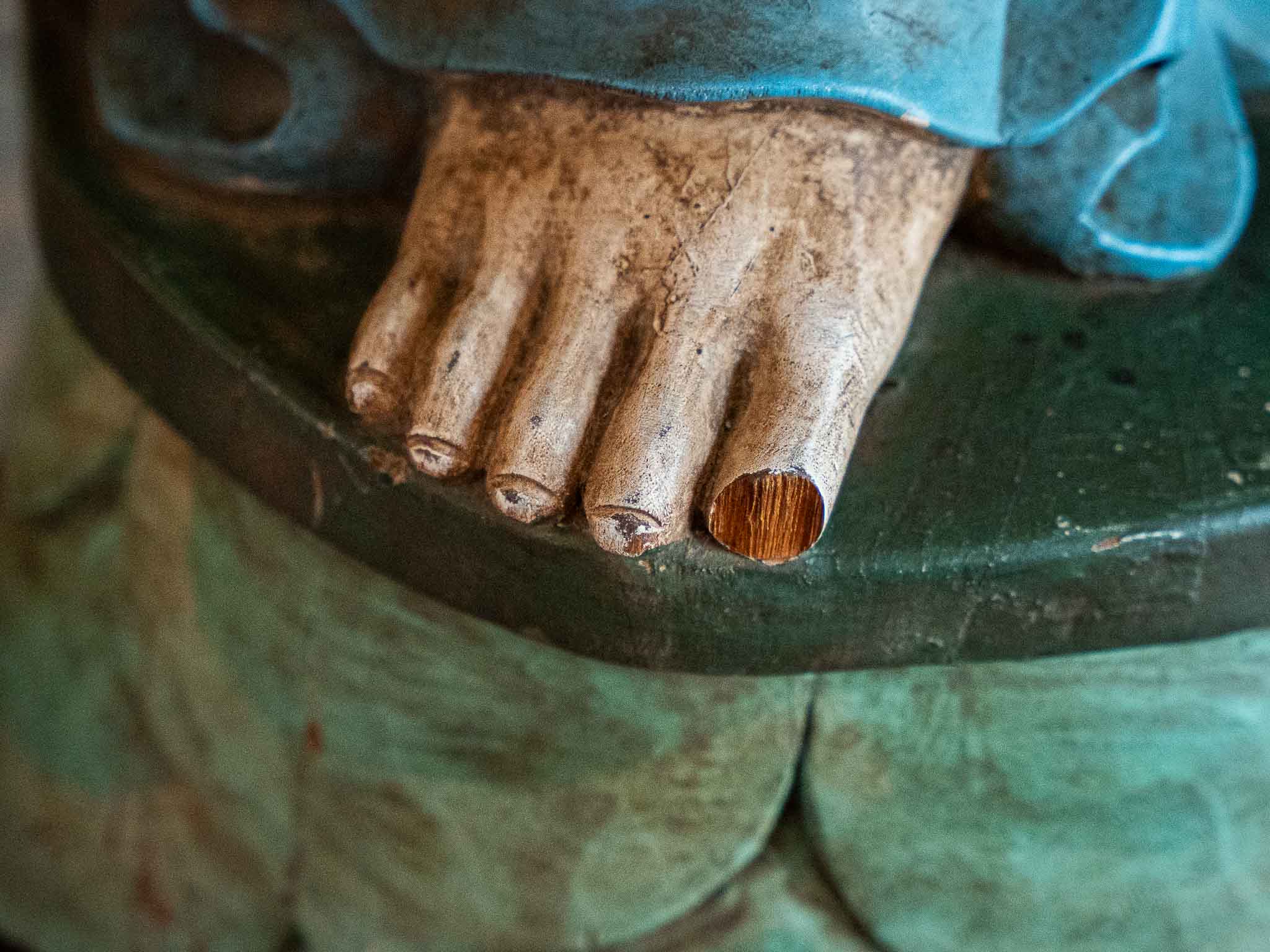 Good vintage condition overall with visible age-related wear. There are some cracks in the wood and minor loss (including part of a toe), consistent with age. Paint and overall presentation remain very attractive.
