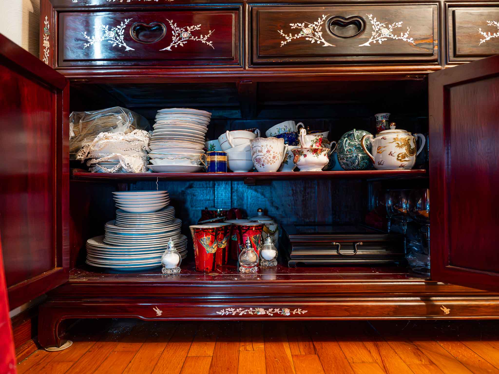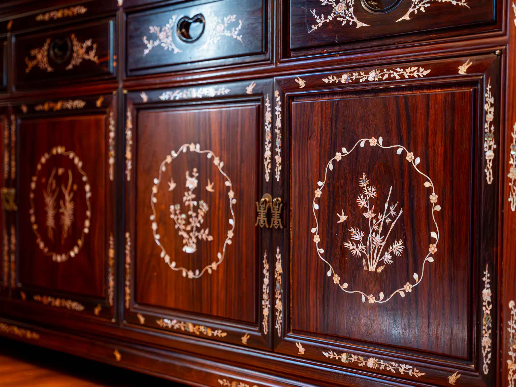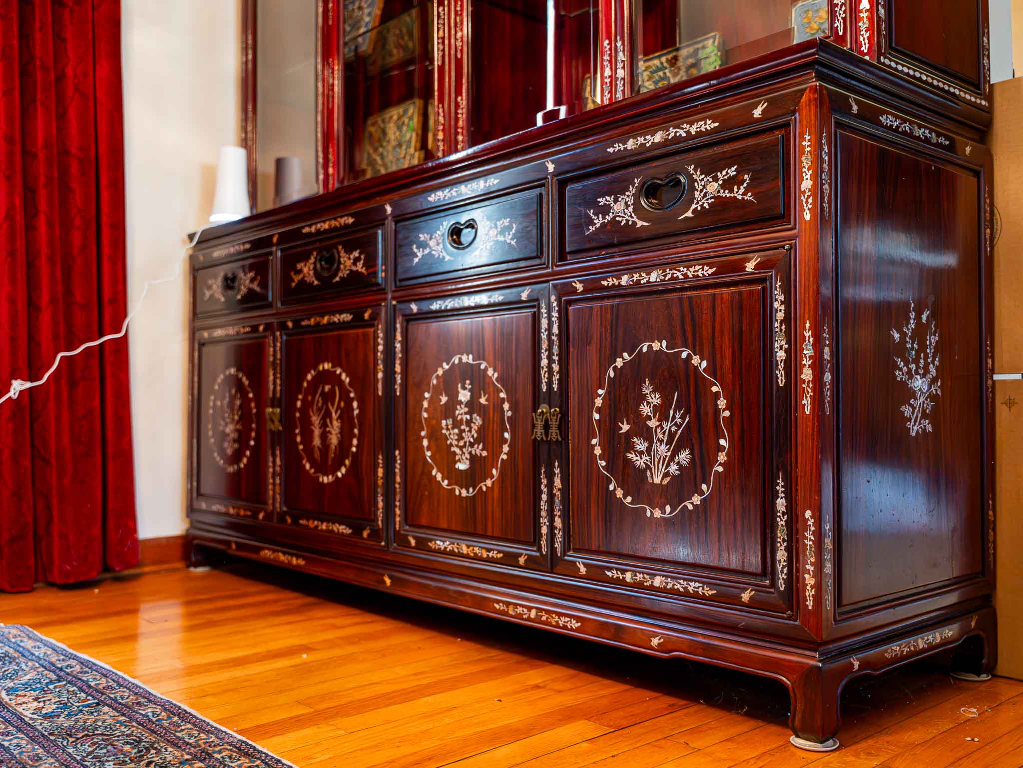 Large vintage oriental-style china cabinet featuring rich wood tones with intricate inlay detailing throughout. Upper section includes glass display doors with multiple shelves, ideal for showcasing dishes, collectibles, or décor. Lower section offers multiple drawers and cabinet storage with matching inlaid designs.
