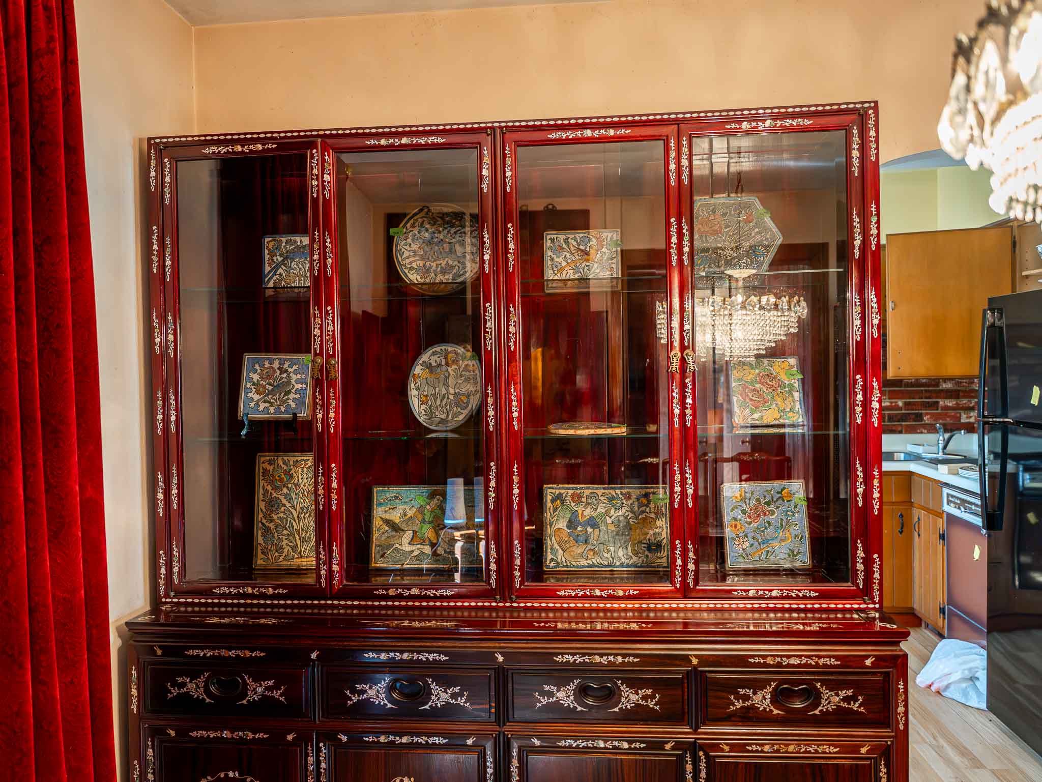 Large Oriental Style China Cabinet Display Hutch Inlaid Wood Glass Doors