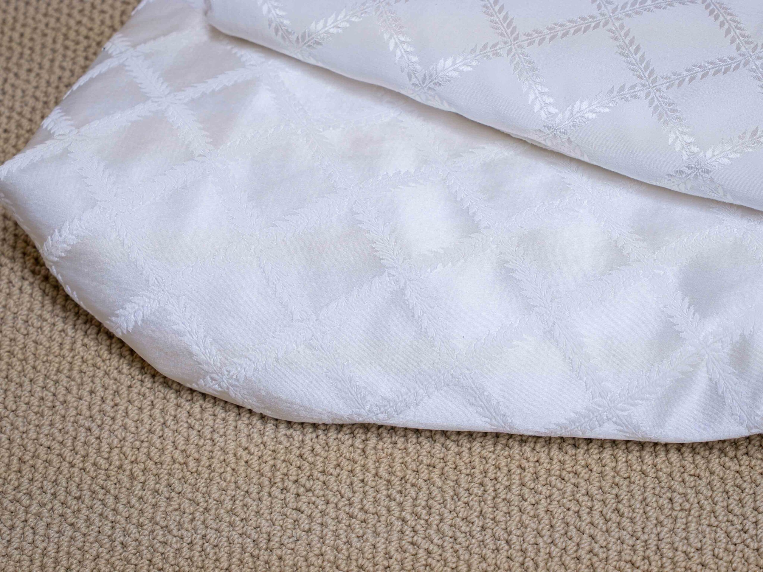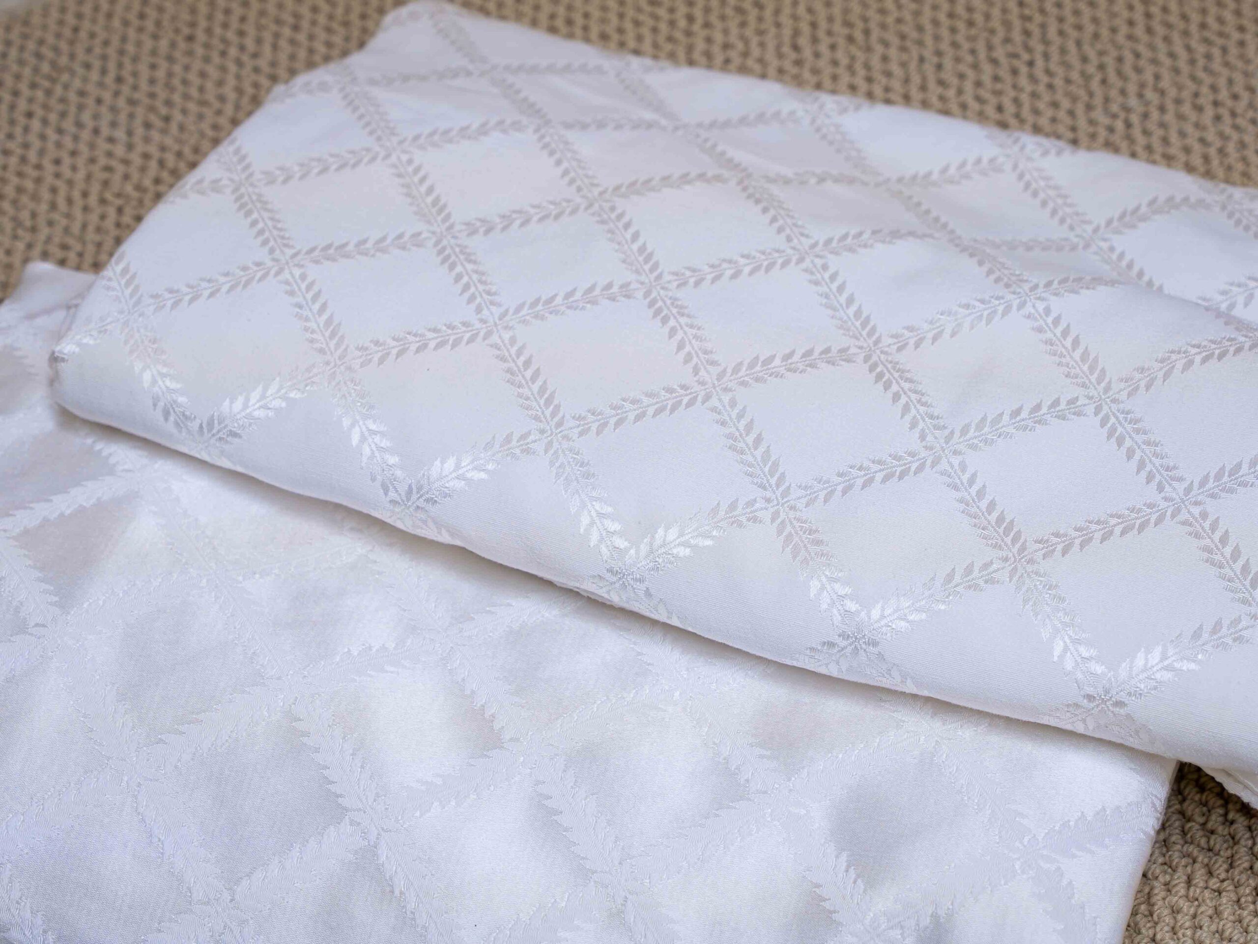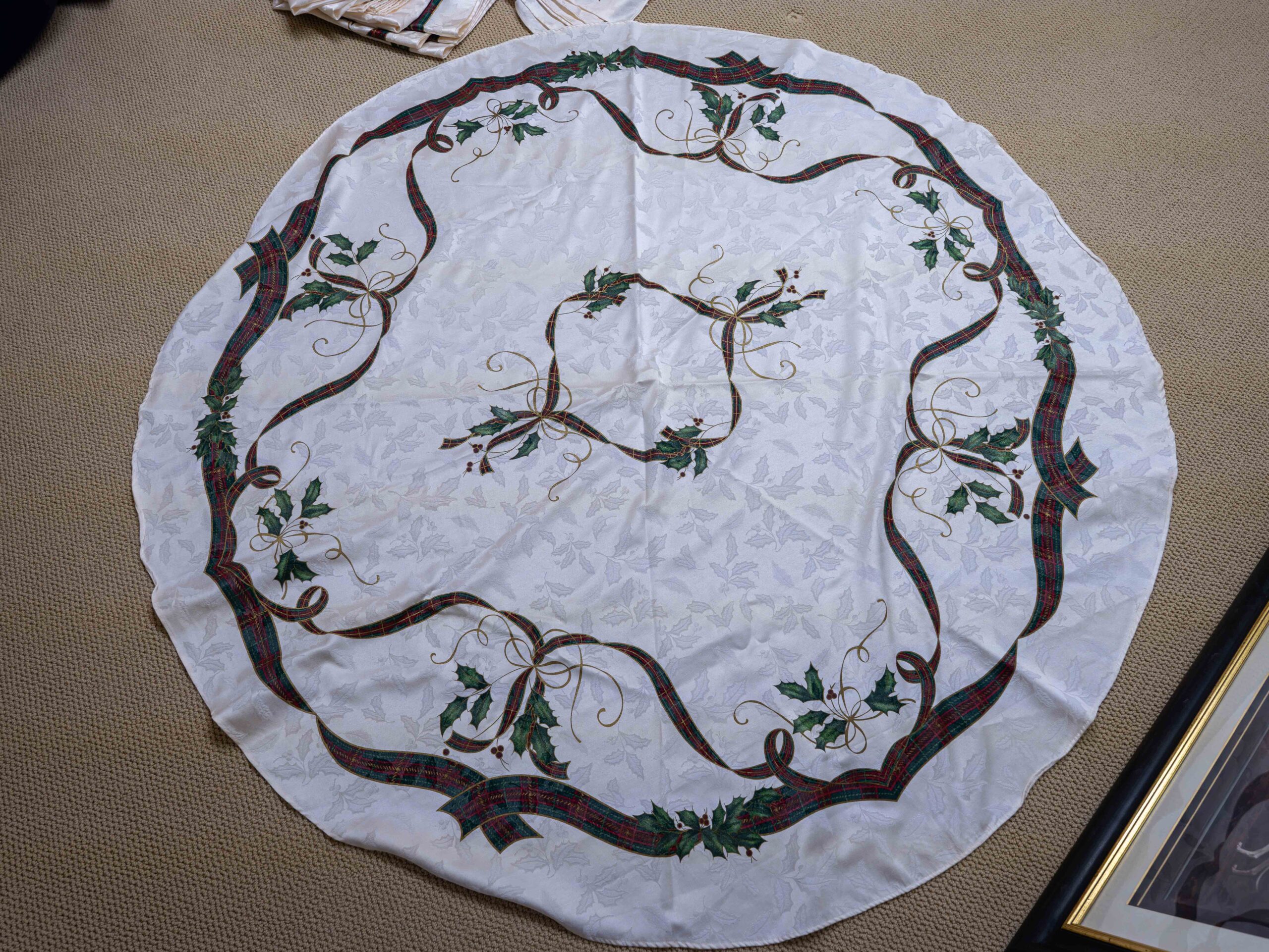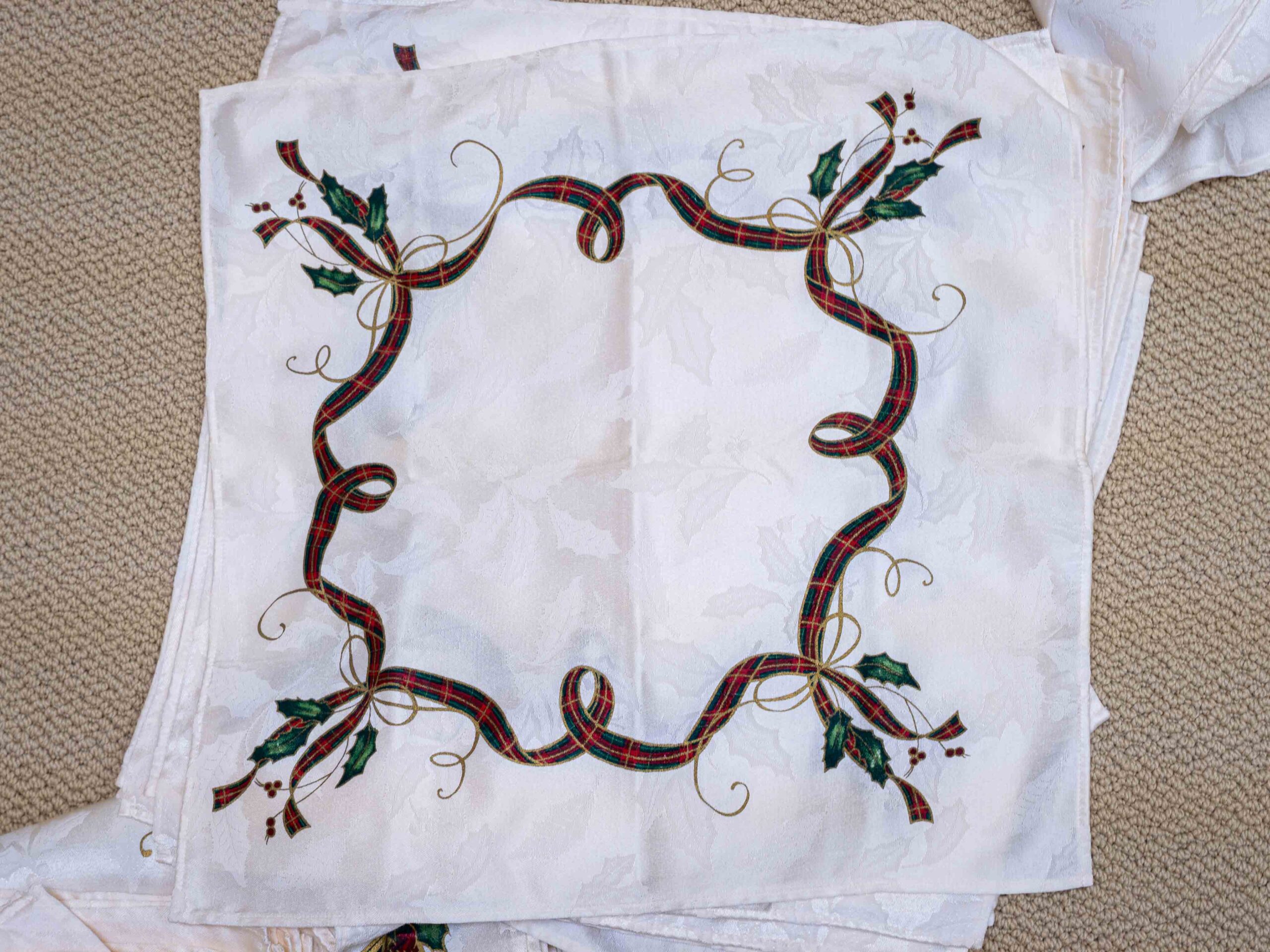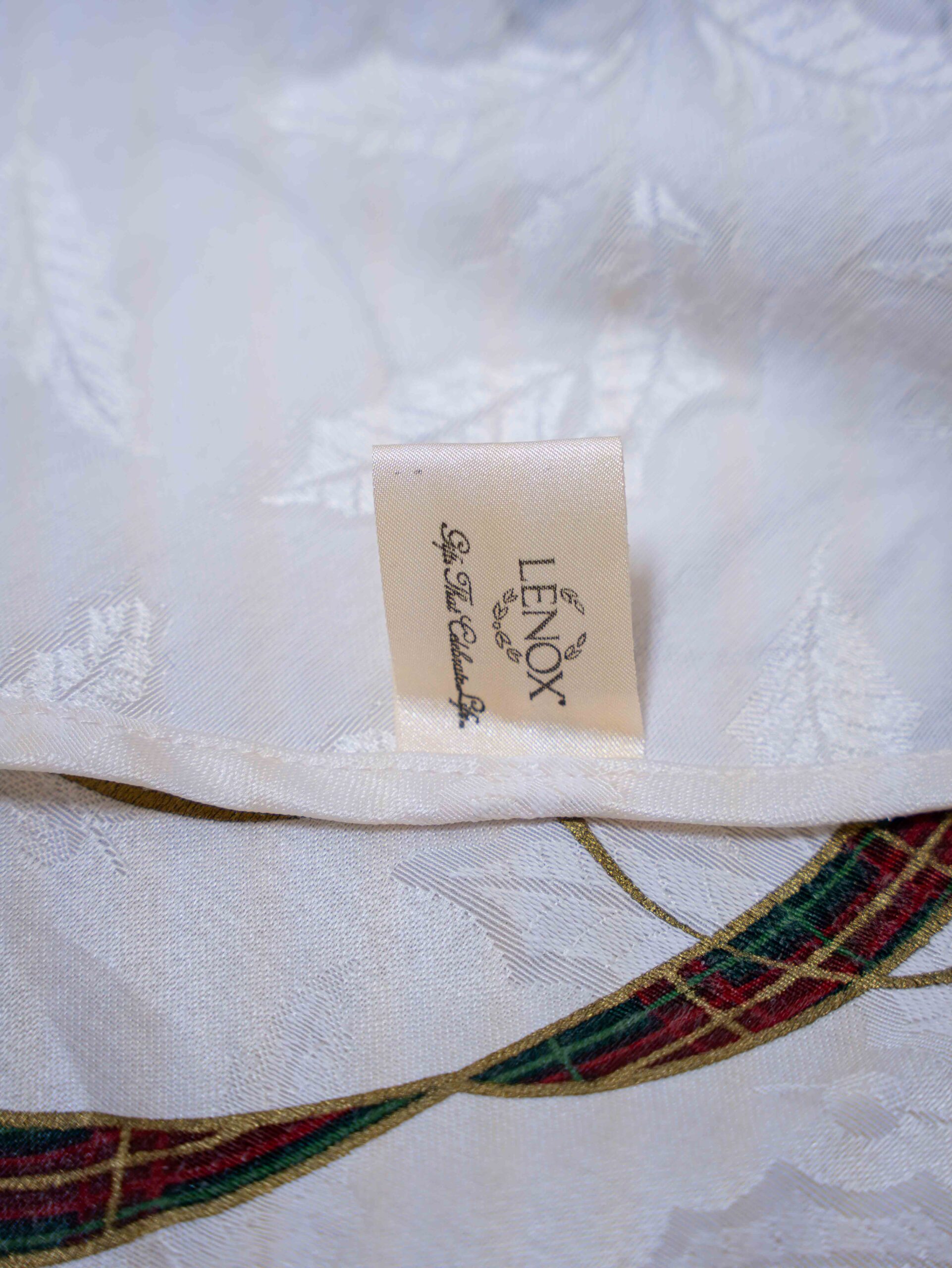 Elegant holiday-themed table linens by Lenox, featuring a timeless holly and tartan ribbon motif. Perfect for Christmas gatherings or formal dining year-round. High-quality jacquard weave with subtle leaf pattern background.