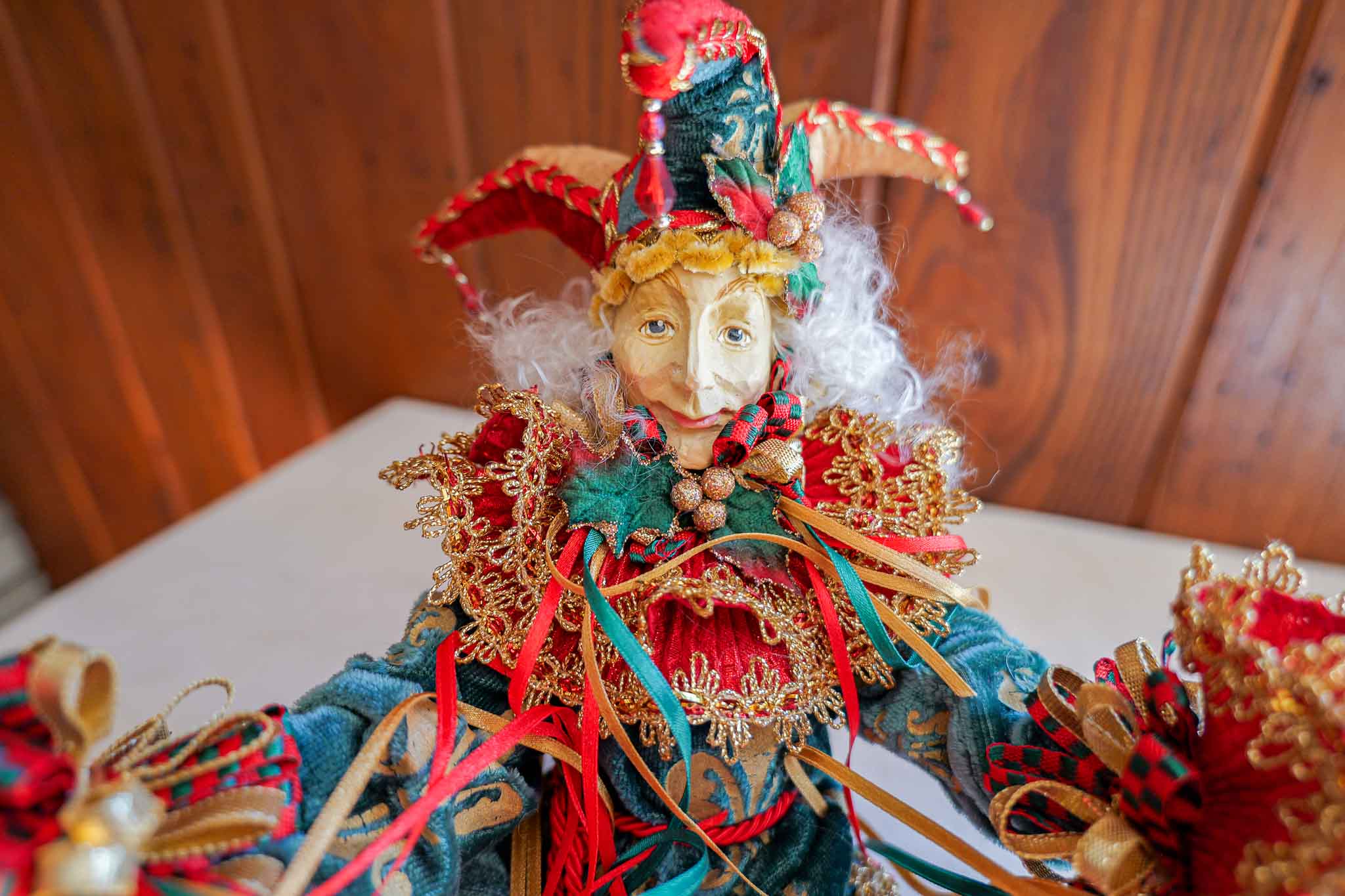 Highly detailed collectible Christmas jester figurine in the style of Mark Roberts, featuring rich red and green fabrics, ornate gold trim, and expressive hand-painted face. This whimsical holiday character includes layered textiles, ribbon accents, and classic jester hat—perfect for high-end Christmas decorating or collector displays.