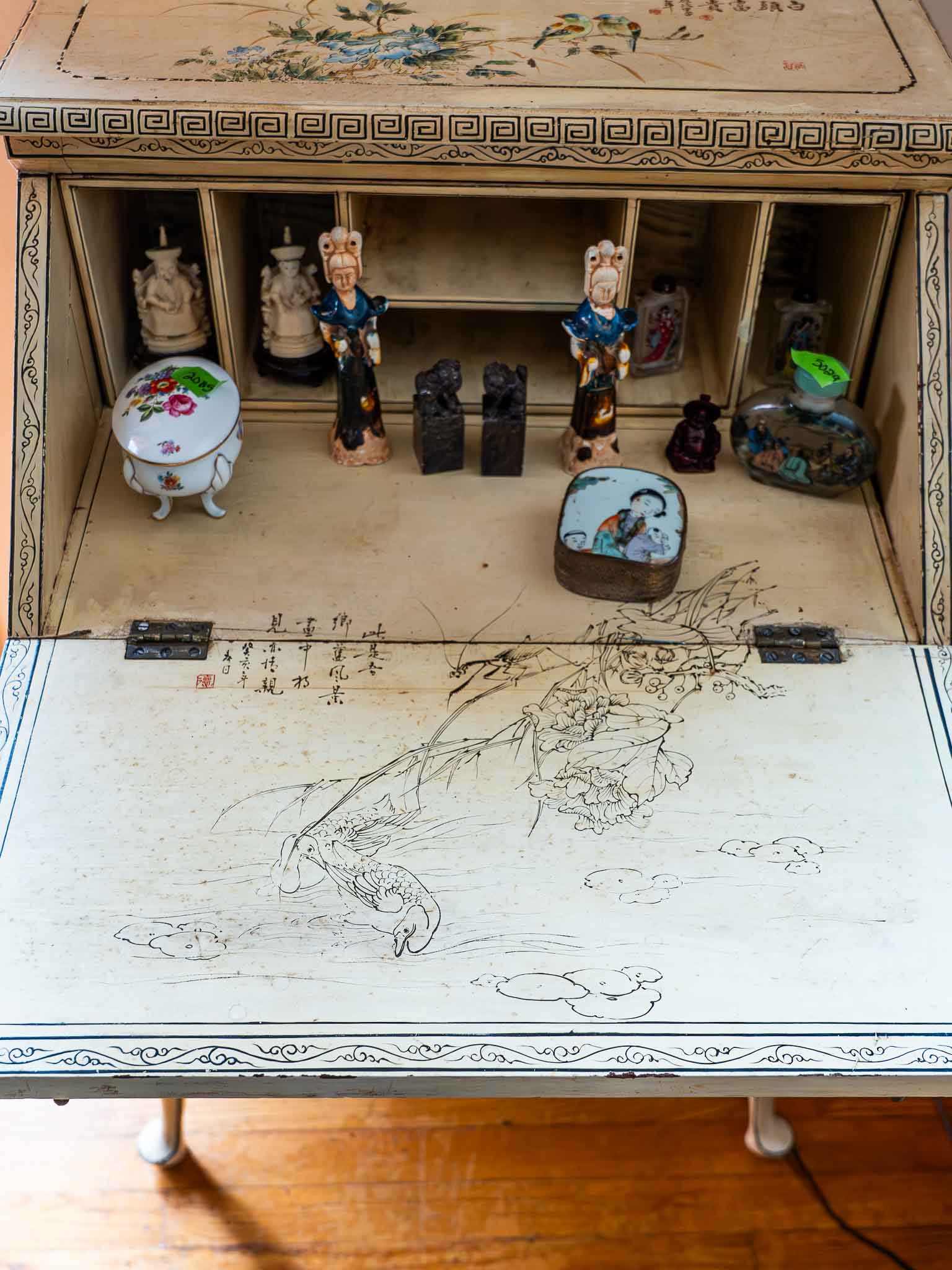 Beautiful Oriental-style secretary desk featuring hand-painted scenes and intricate decorative detailing throughout. The fold-down front reveals a functional writing surface along with interior cubbies for storage, making it both decorative and practical.