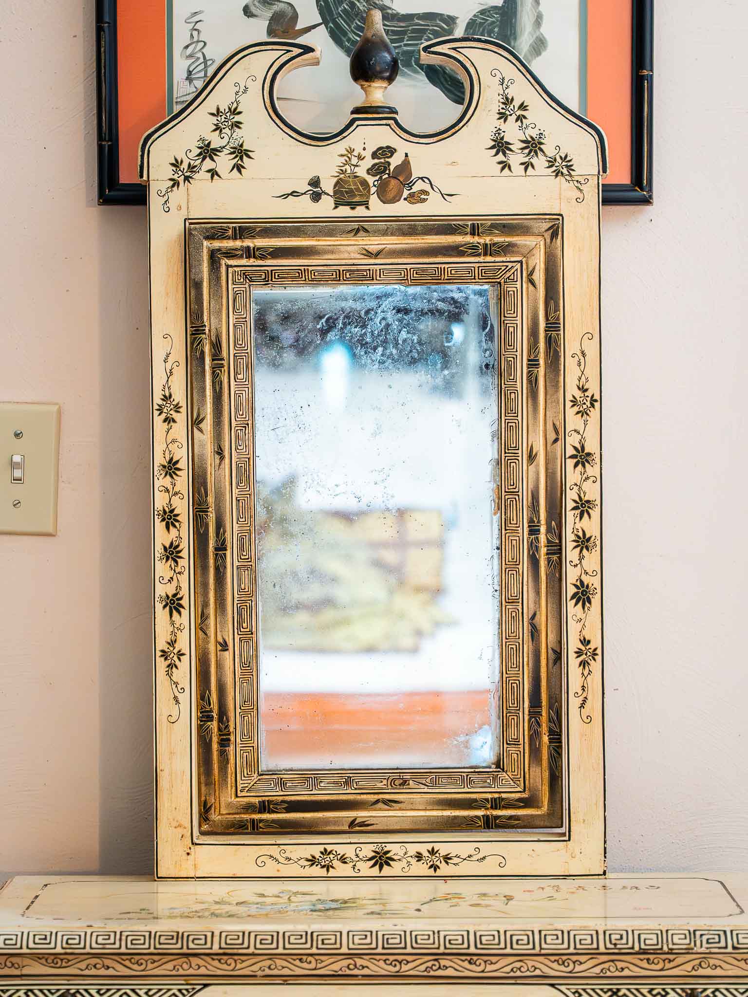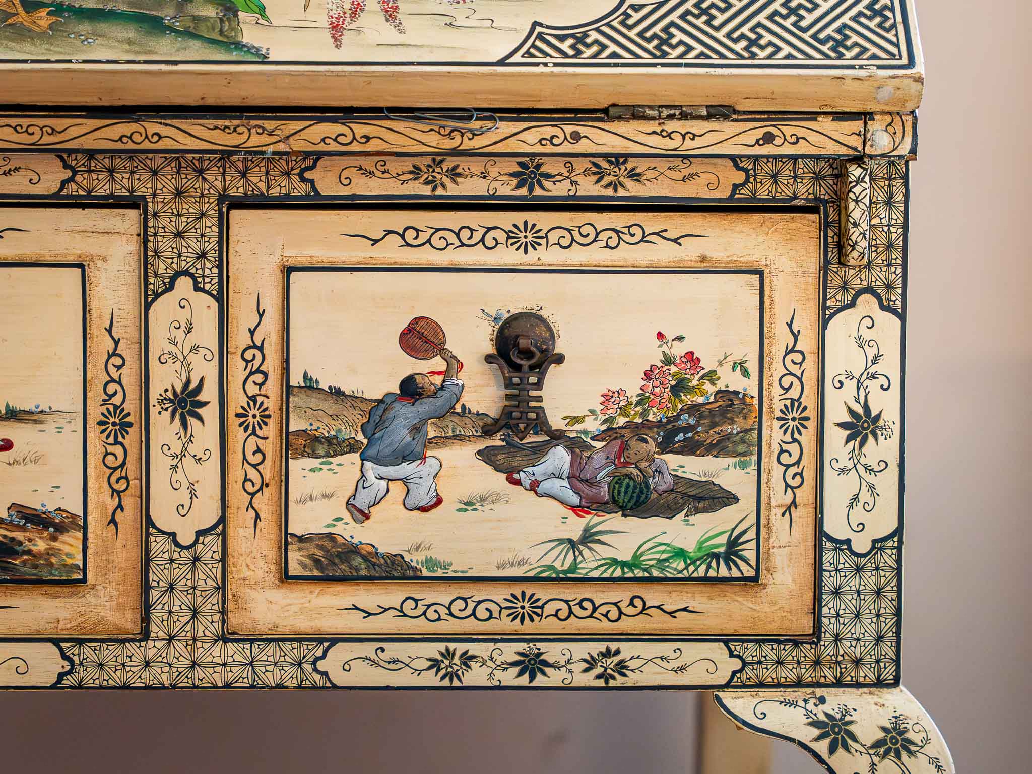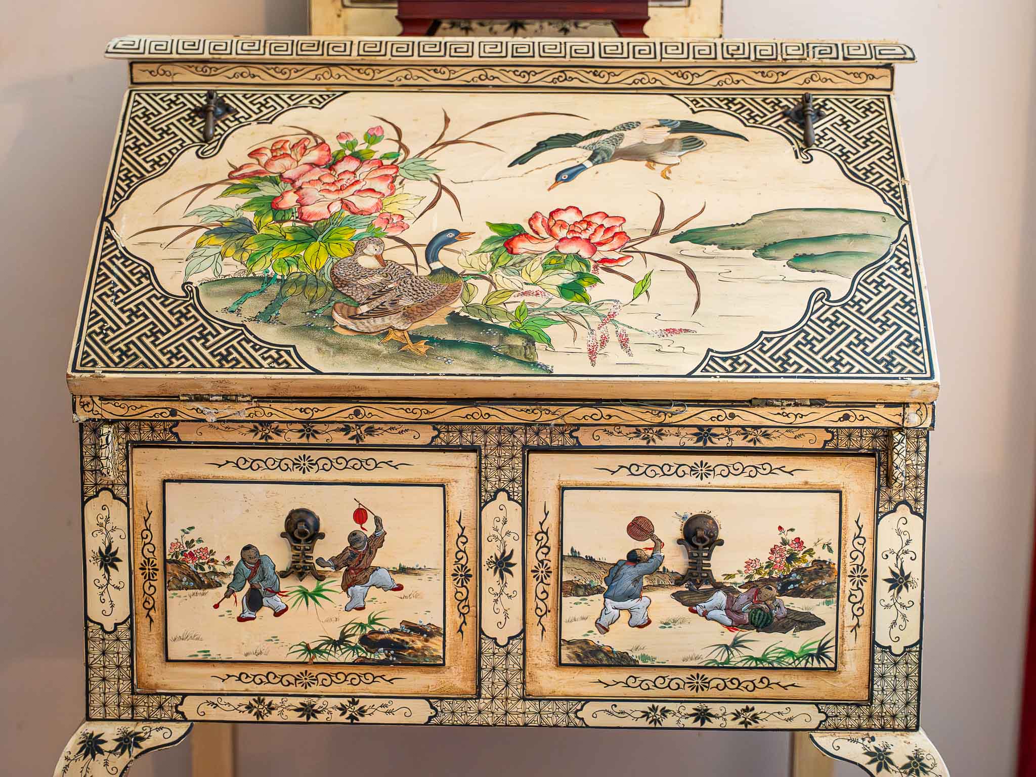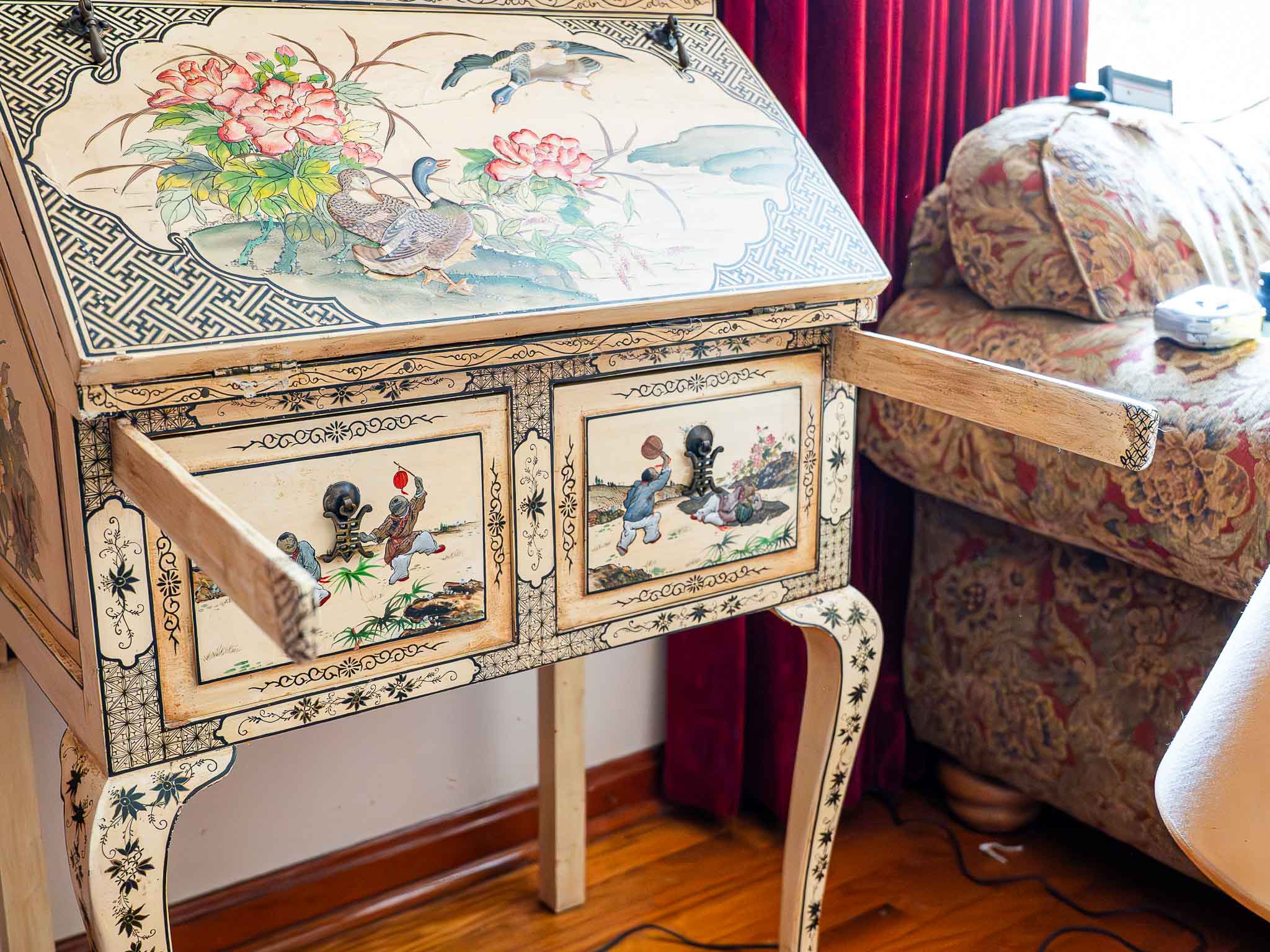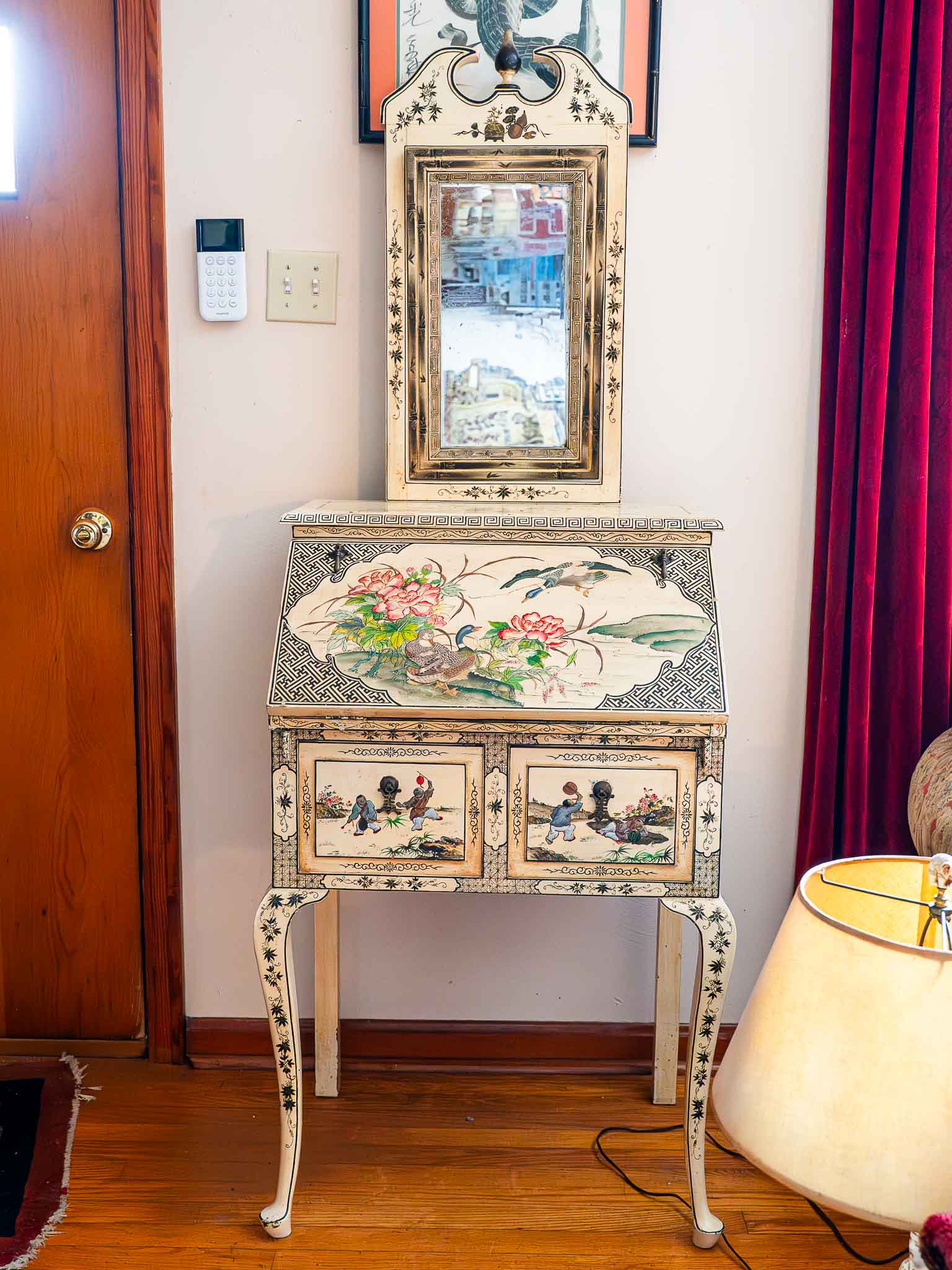 Oriental Painted Secretary Desk with Mirror Fold-Down Writing Desk Asian Style