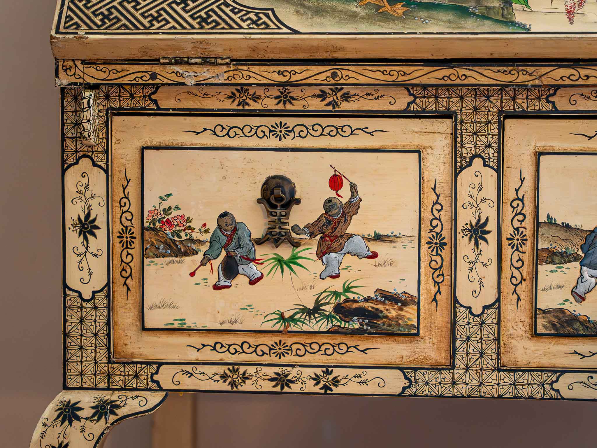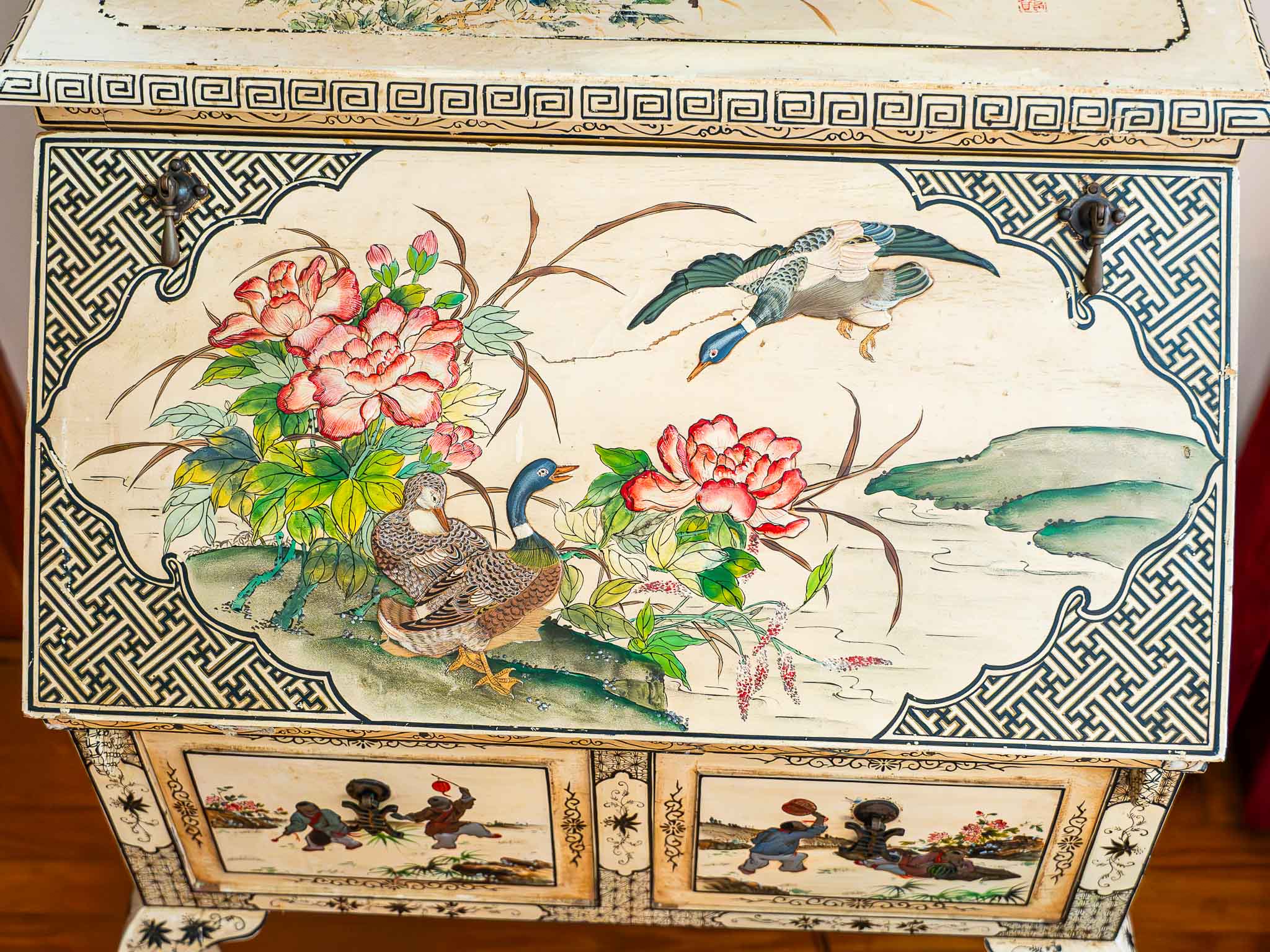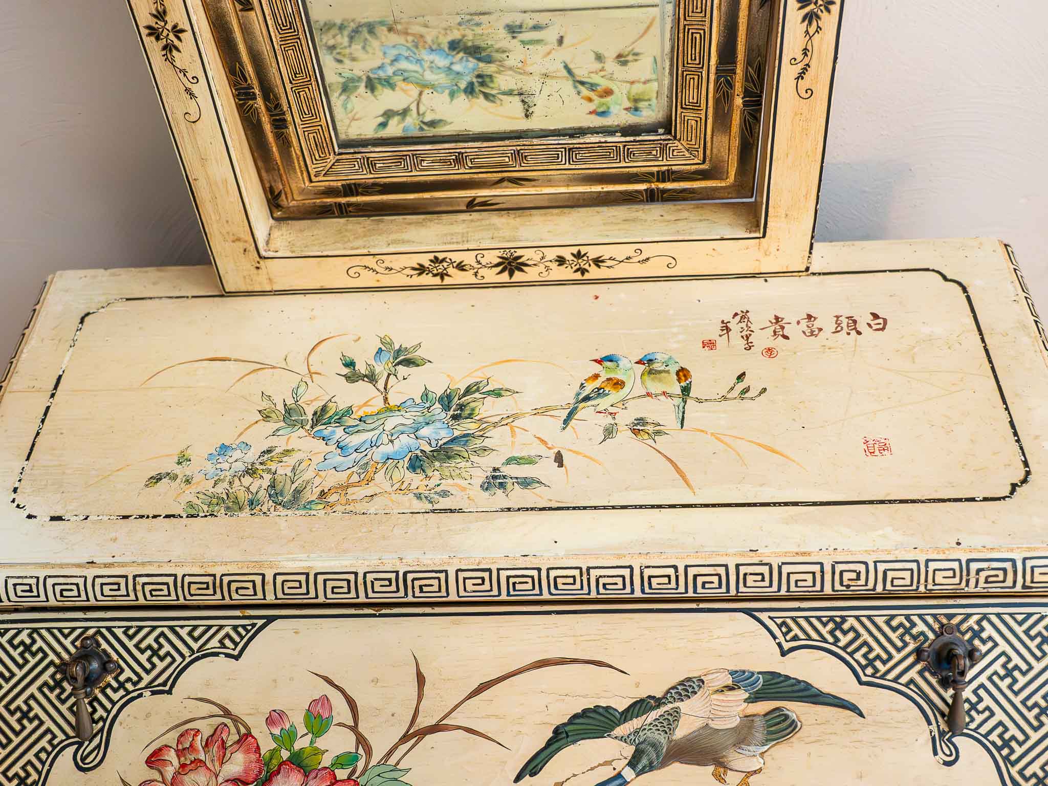 The exterior showcases traditional Asian motifs including florals, birds, and scenic imagery, while the drawer fronts feature detailed painted figures. Elegant curved legs and a light distressed finish give this piece a classic vintage look.
