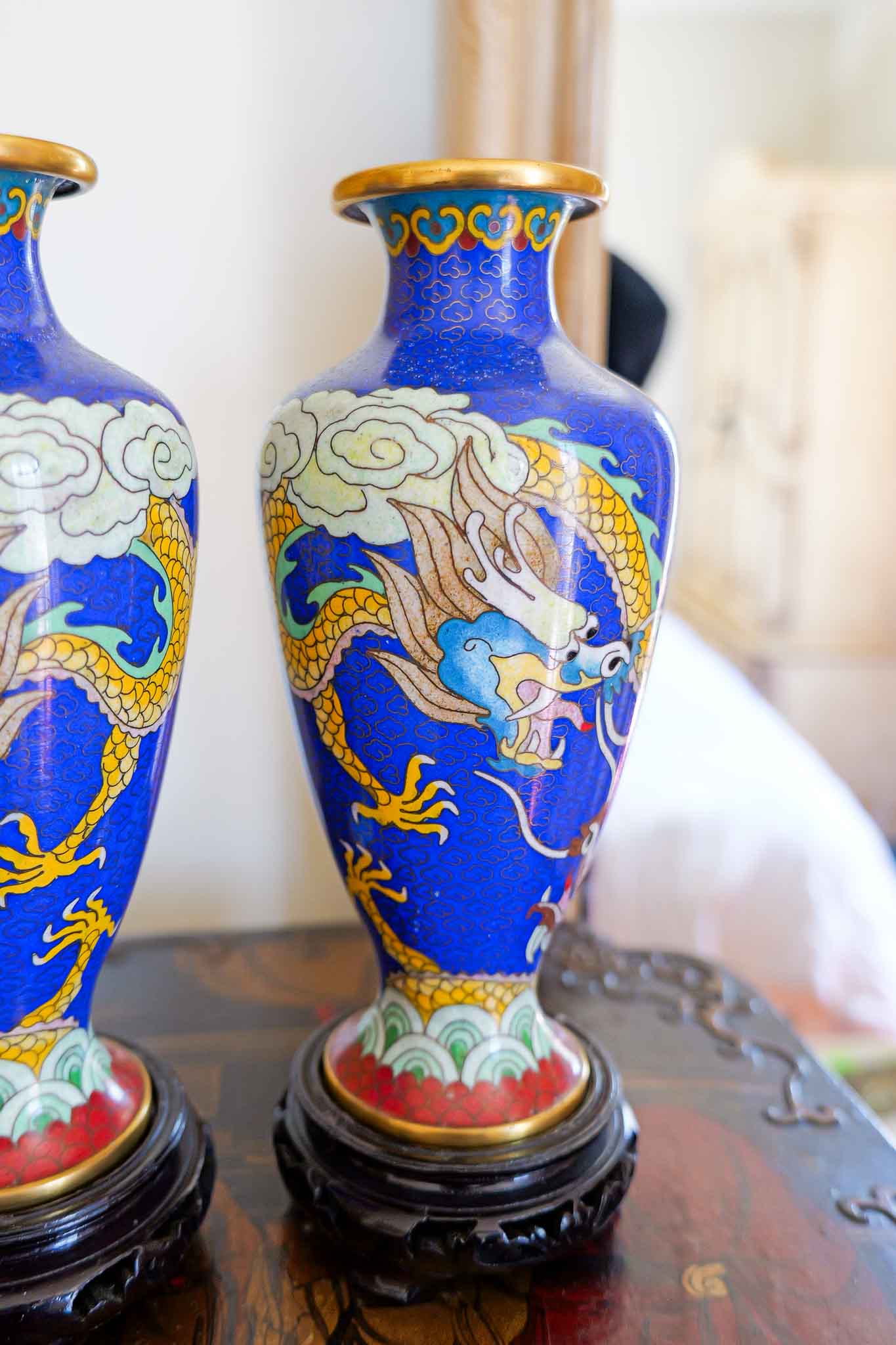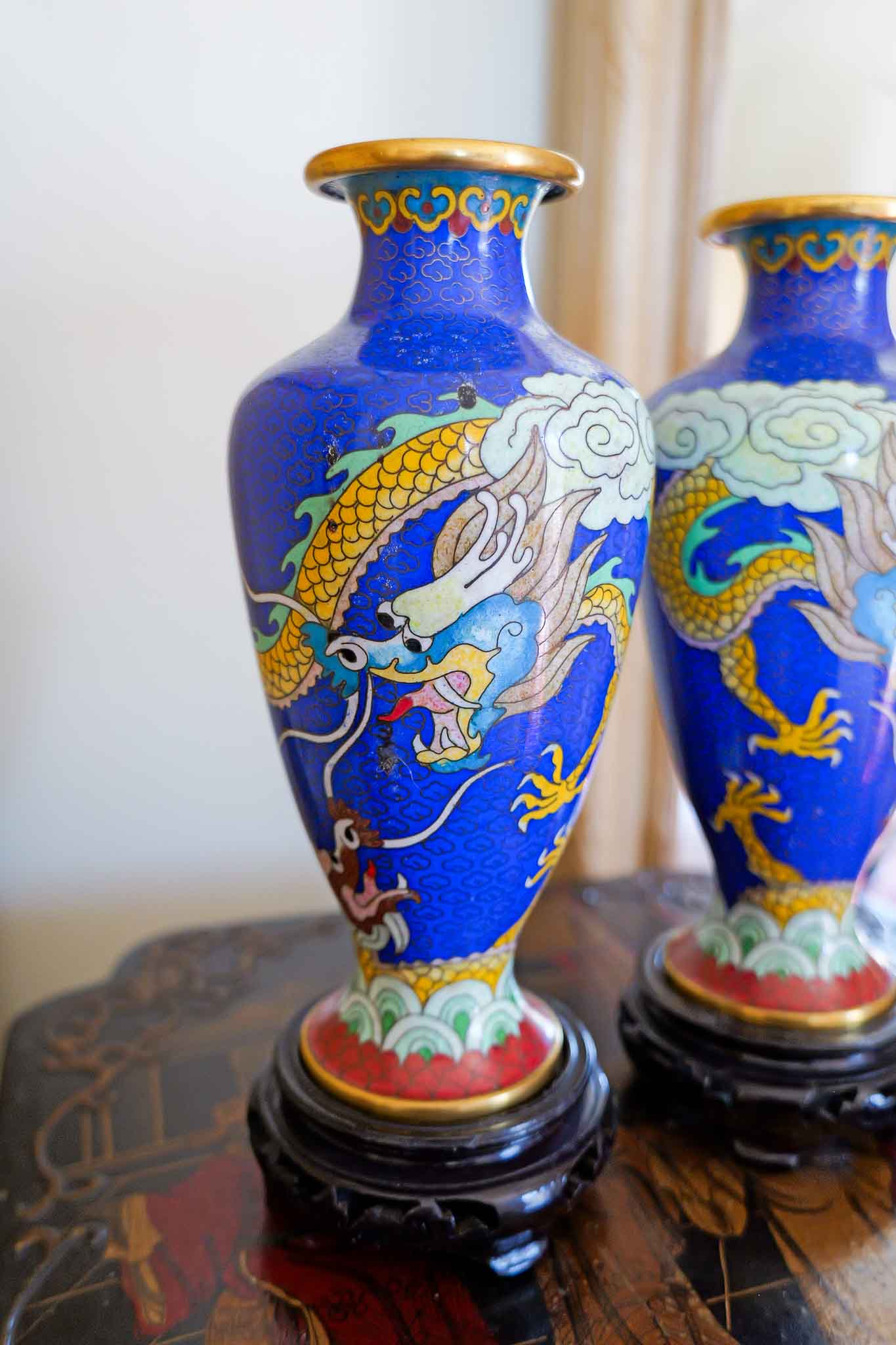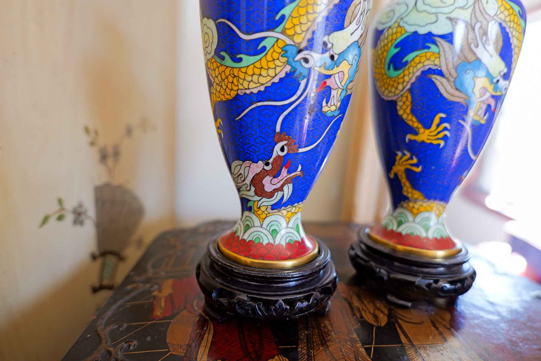 Pair of Chinese Cloisonné Dragon Vases on Wooden Stands – Blue Enamel, 9.5”