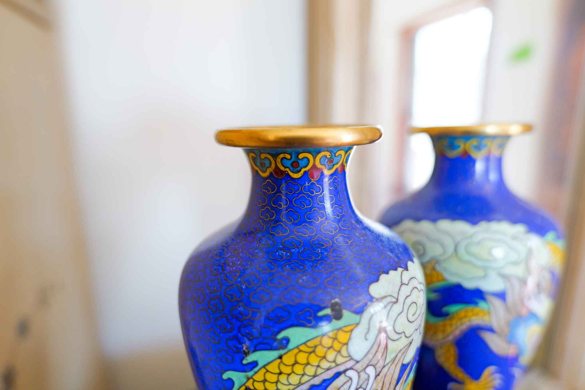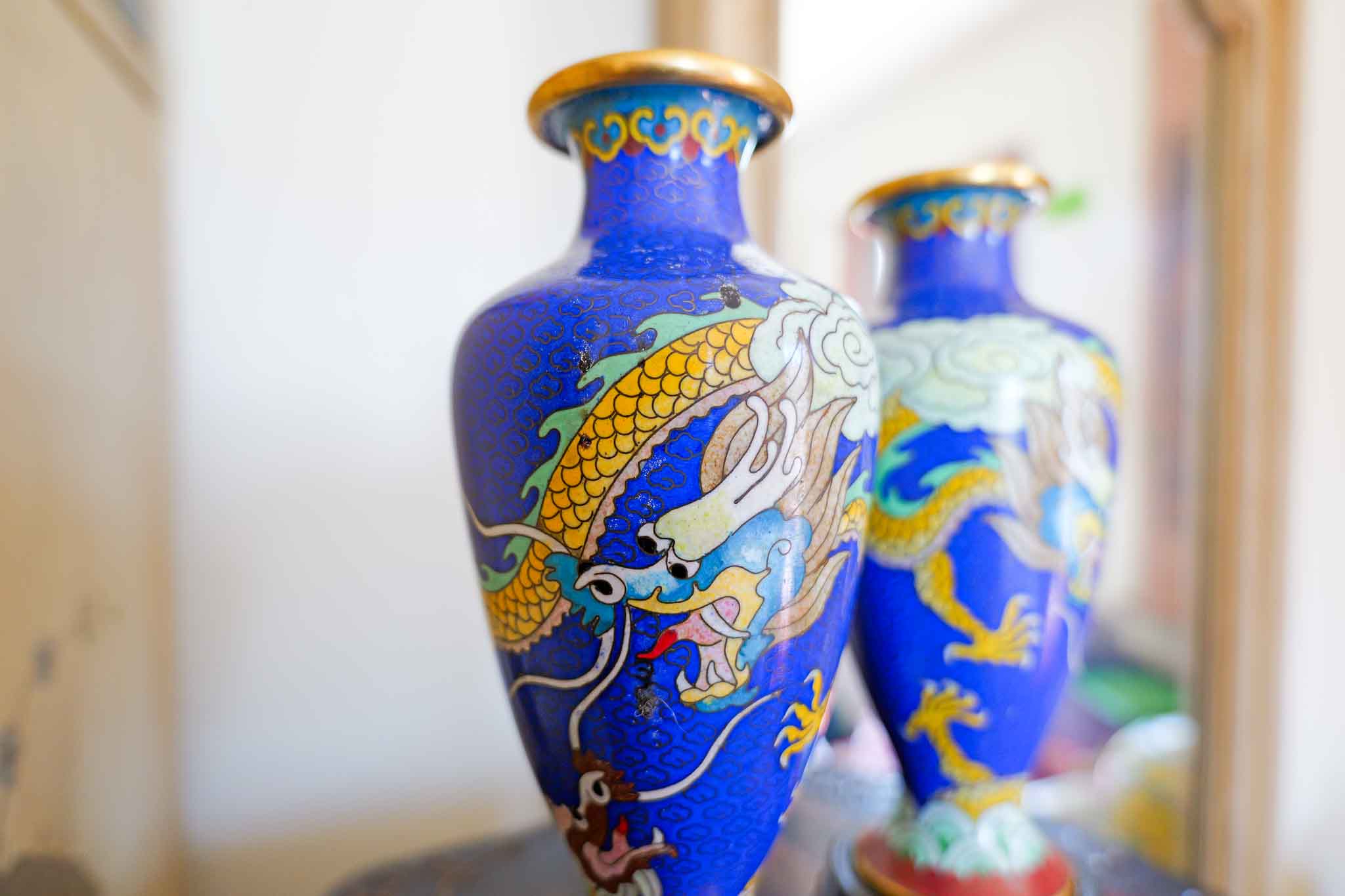 Cloisonné technique showcases intricate metalwork with enamel inlays, giving these pieces a rich, textured appearance. The dragon imagery symbolizes strength, power, and good fortune in Chinese culture.