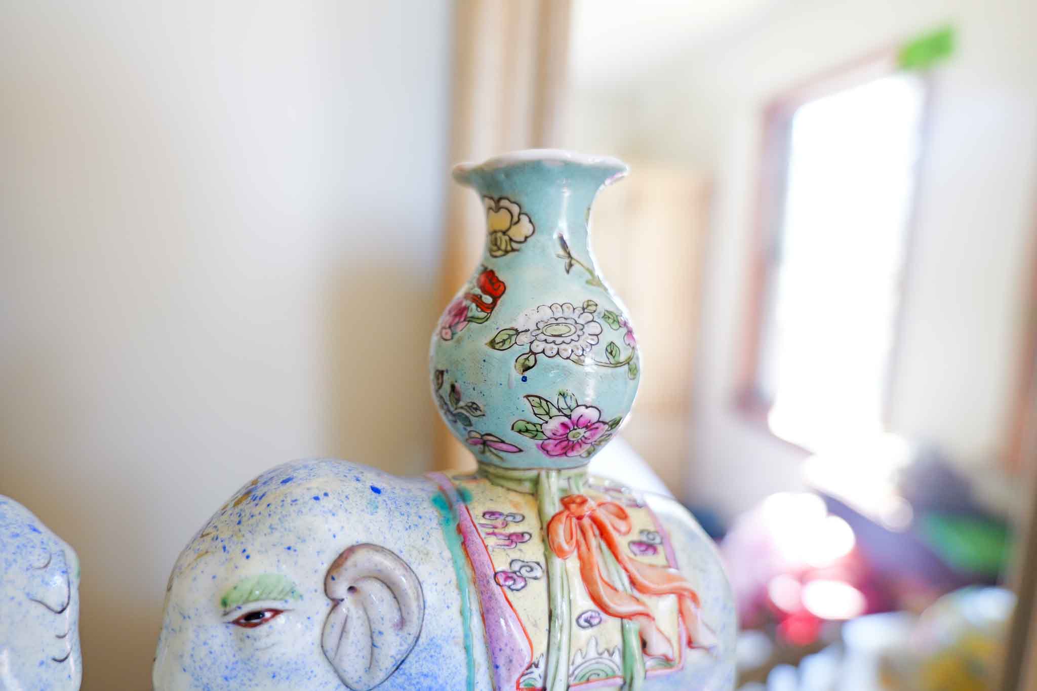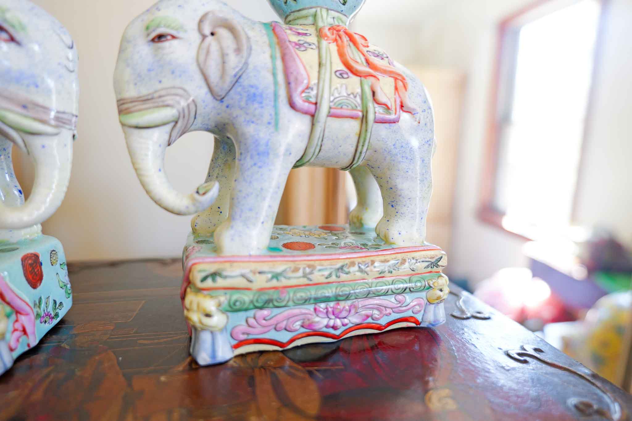 Beautiful pair of Chinese export porcelain elephant candle holders featuring hand-painted famille rose floral decoration with soft pastel tones. Each elephant carries a vase-form candle holder on its back, richly detailed with traditional motifs and vibrant accents.