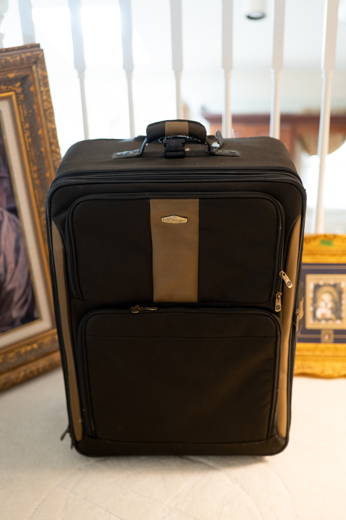Spacious Ricardo rolling suitcase with soft-sided design and sturdy build. Measures approximately 31″ tall, 20″ wide, and 11″ deep, offering ample storage for extended trips. Features zippered compartments for organization and smooth-rolling wheels for easy travel. Excellent used condition.