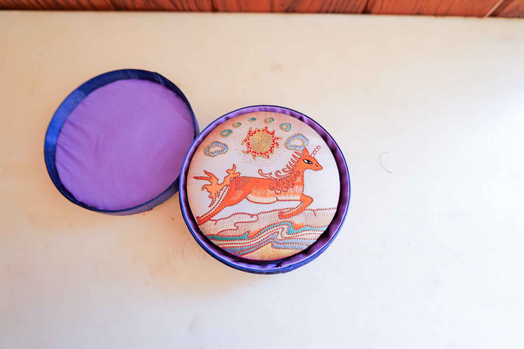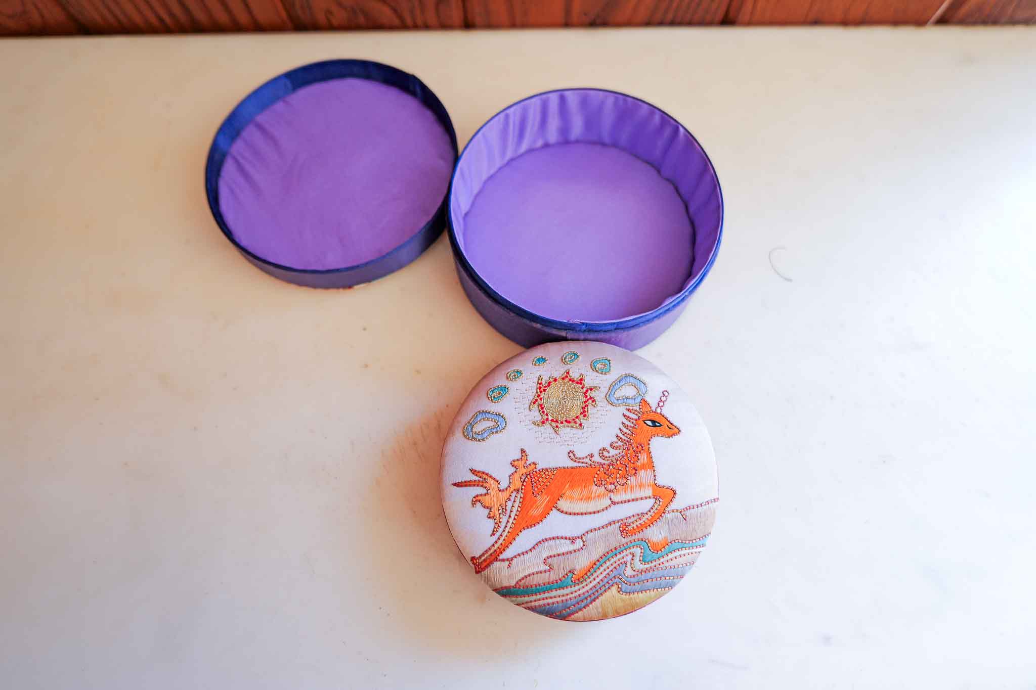 Set of two decorative round storage boxes featuring detailed embroidered lids with a stylized unicorn/deer motif and sun design. The boxes have a satin-like fabric finish with purple sides and soft padded interiors, making them ideal for storing jewelry, keepsakes, or small accessories.