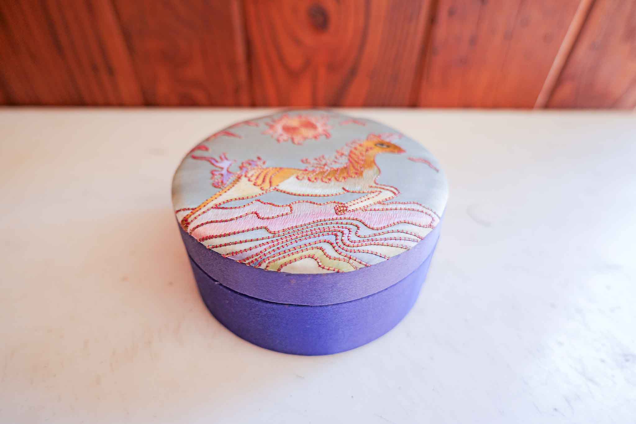 Set of 2 Embroidered Decorative Round Boxes Unicorn Deer Design Satin Lined Trinket Storage