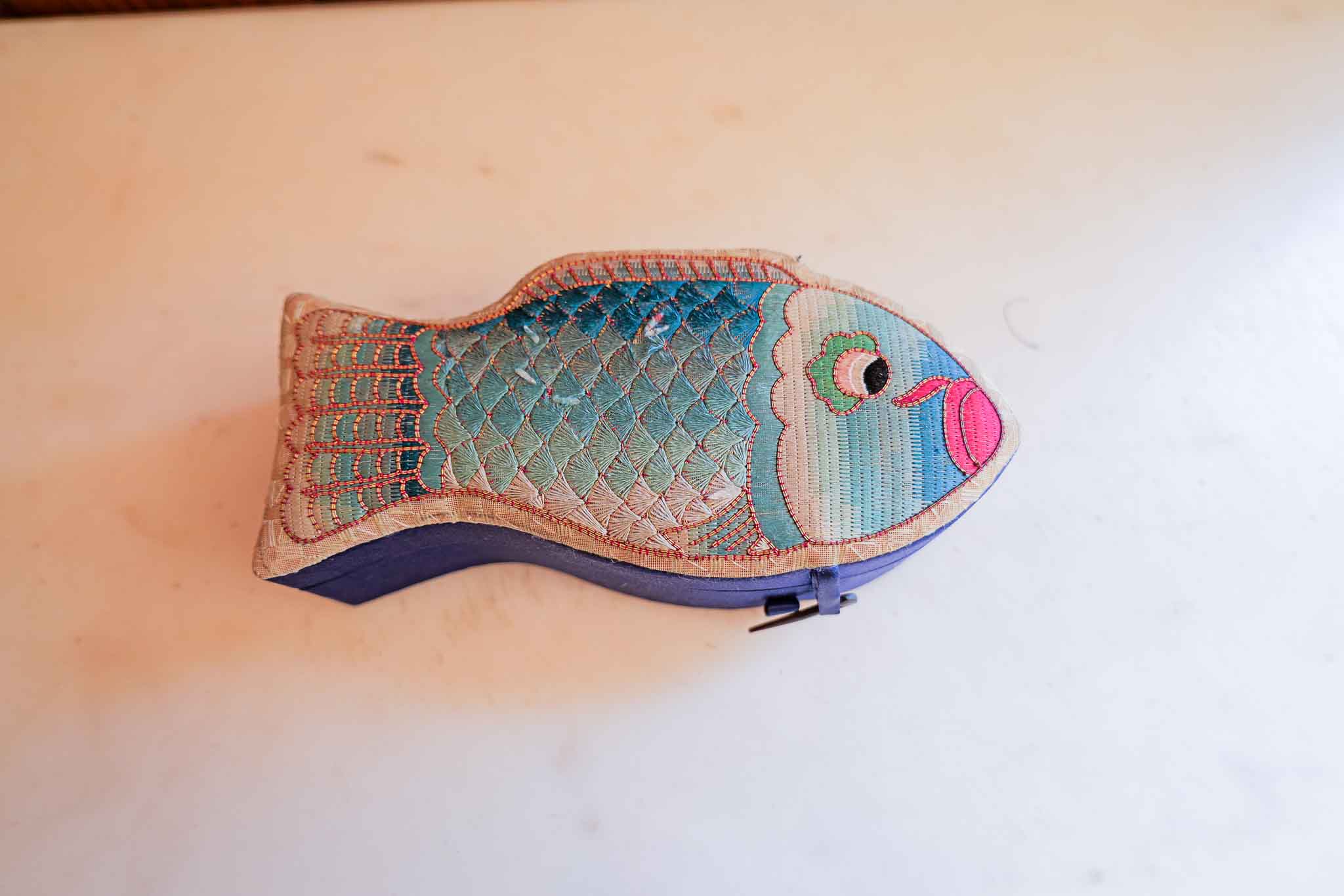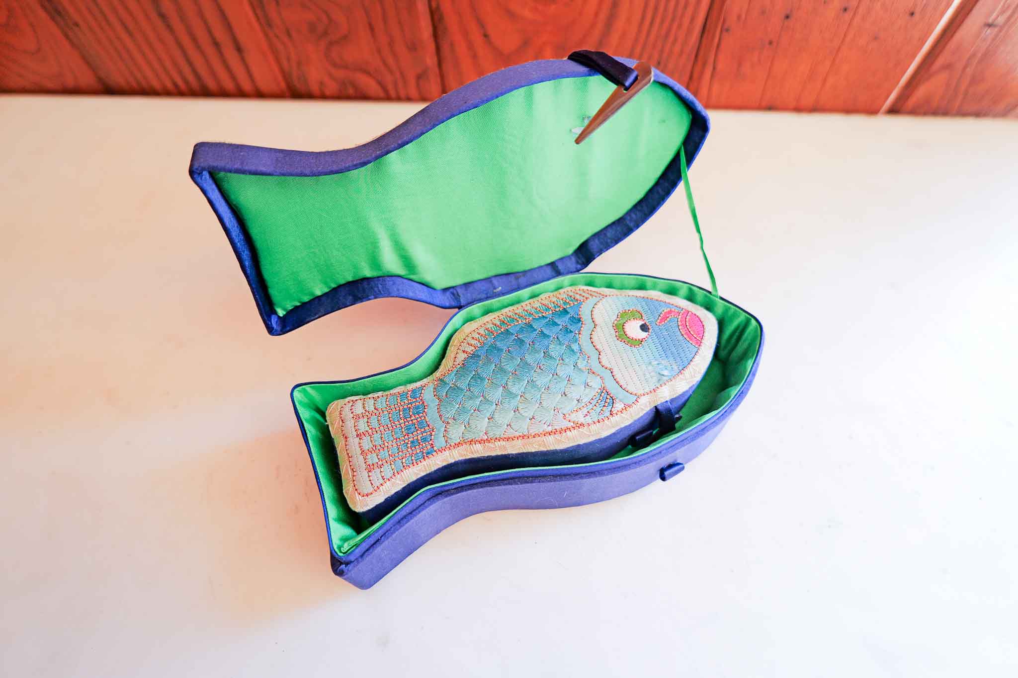 Charming set of two embroidered decorative cases featuring colorful fish designs. Unique sculpted shapes with detailed stitching and vibrant interiors make these great decorative accents or small storage pieces.