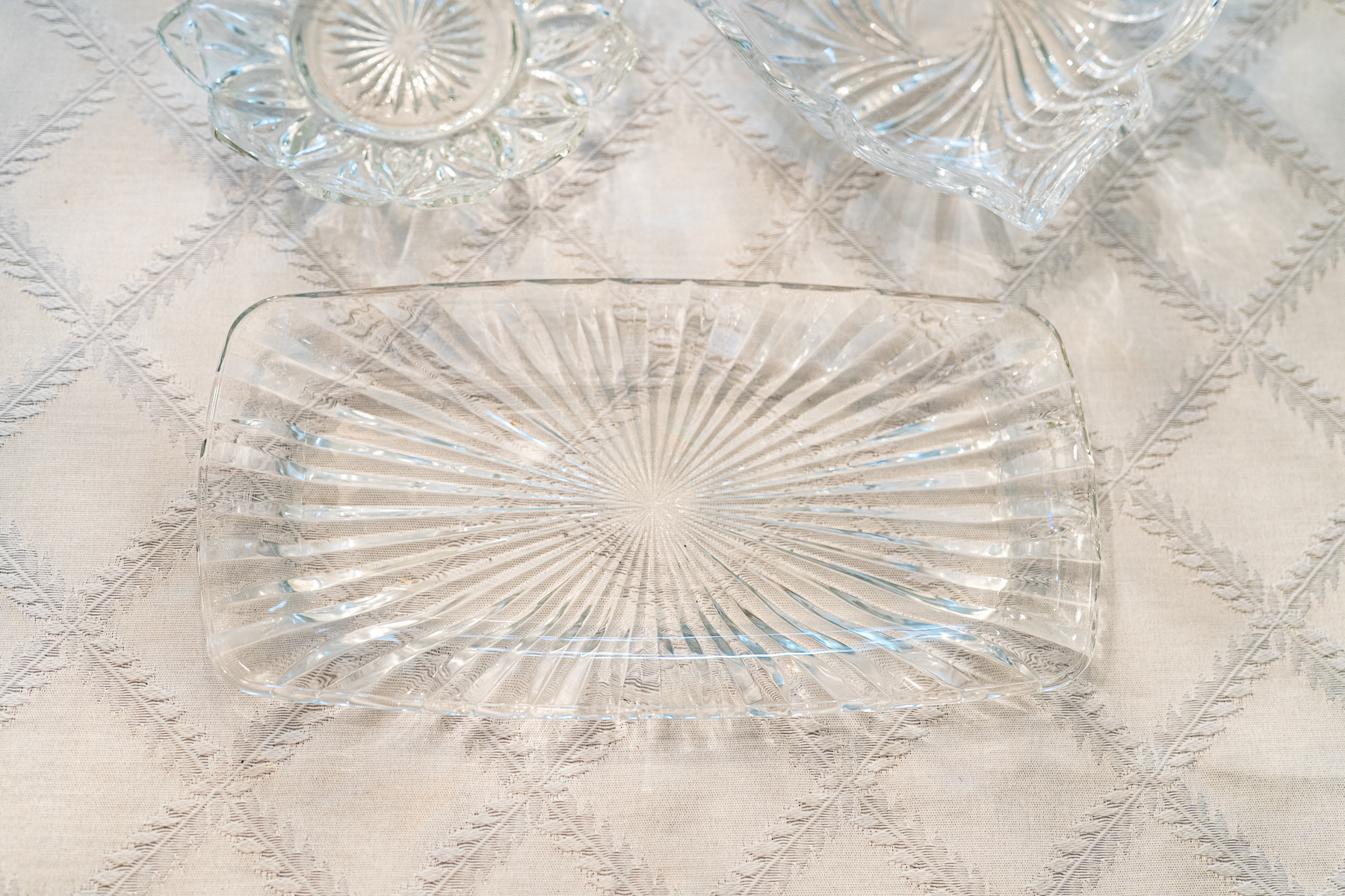 Lovely set of 3 unbranded clear glass serving bowls featuring textured and decorative designs. Perfect for entertaining, candy dishes, or as accent pieces in any dining or display setting.