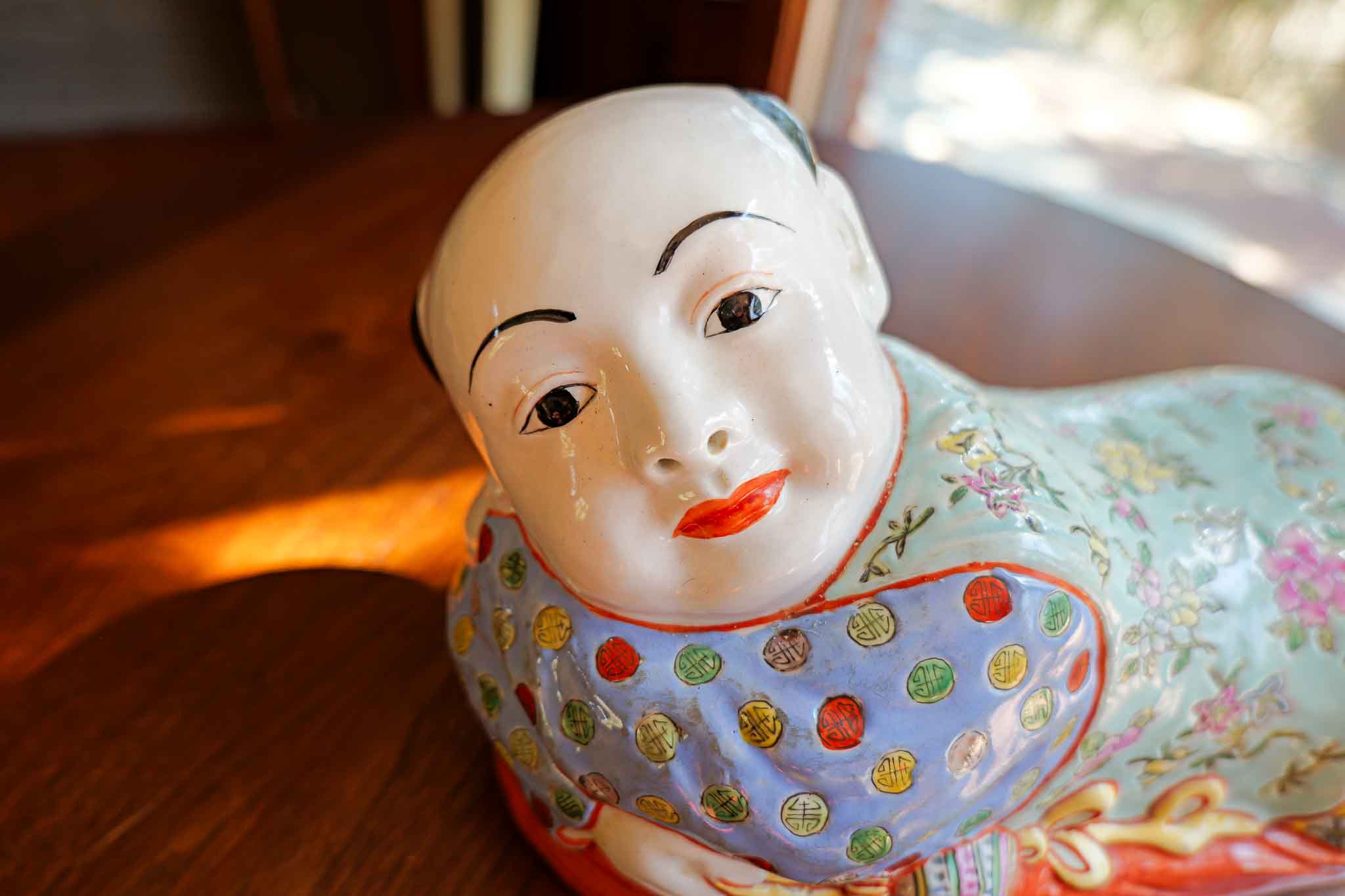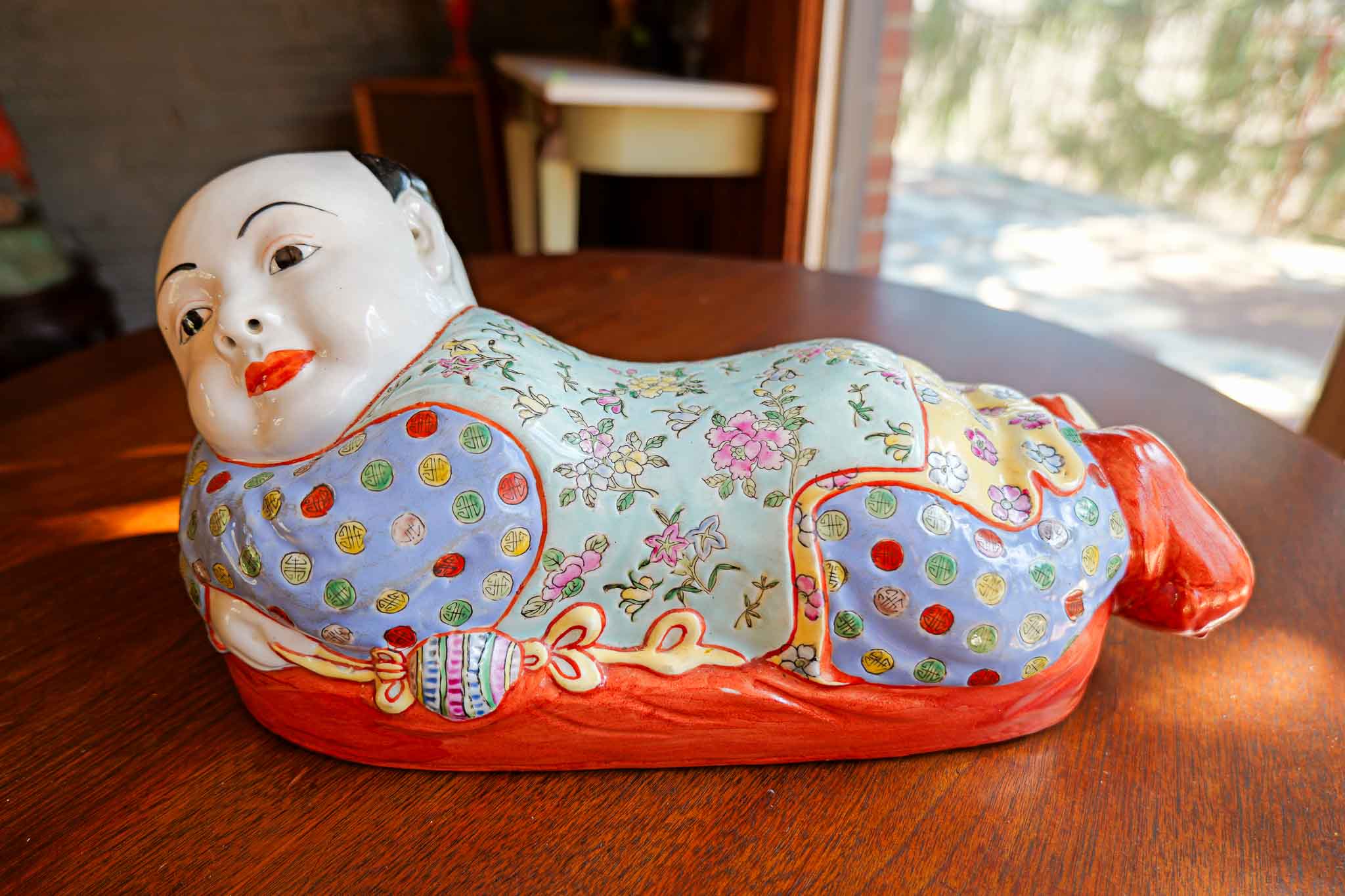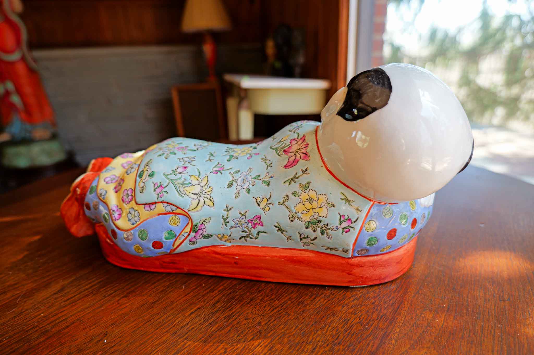 Vintage Chinese porcelain figurine featuring a reclining figure rendered in the traditional famille rose style, known for its vibrant enamel colors and intricate floral detailing.