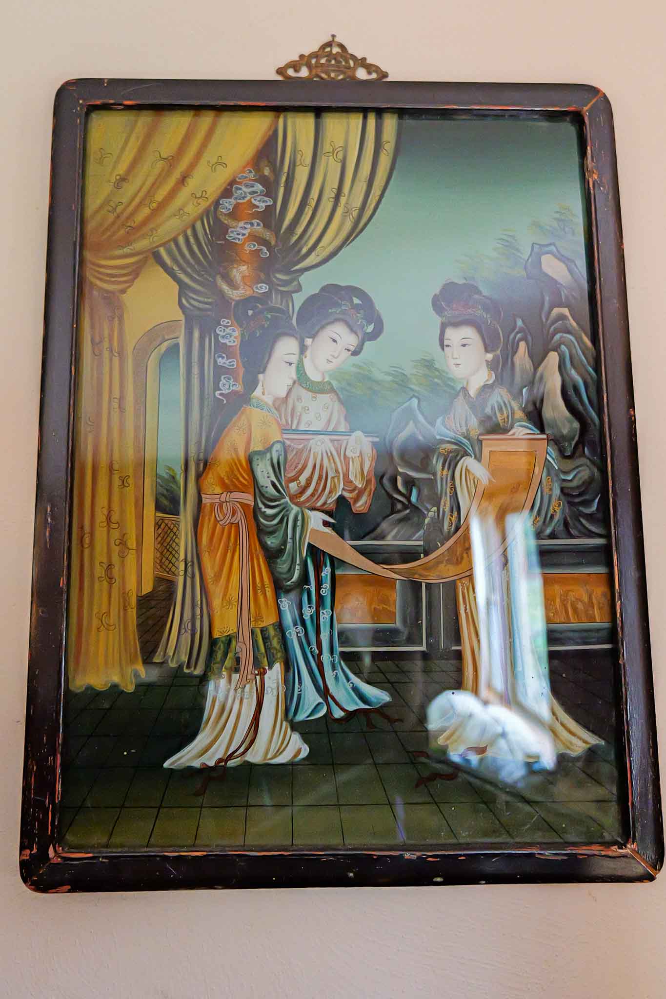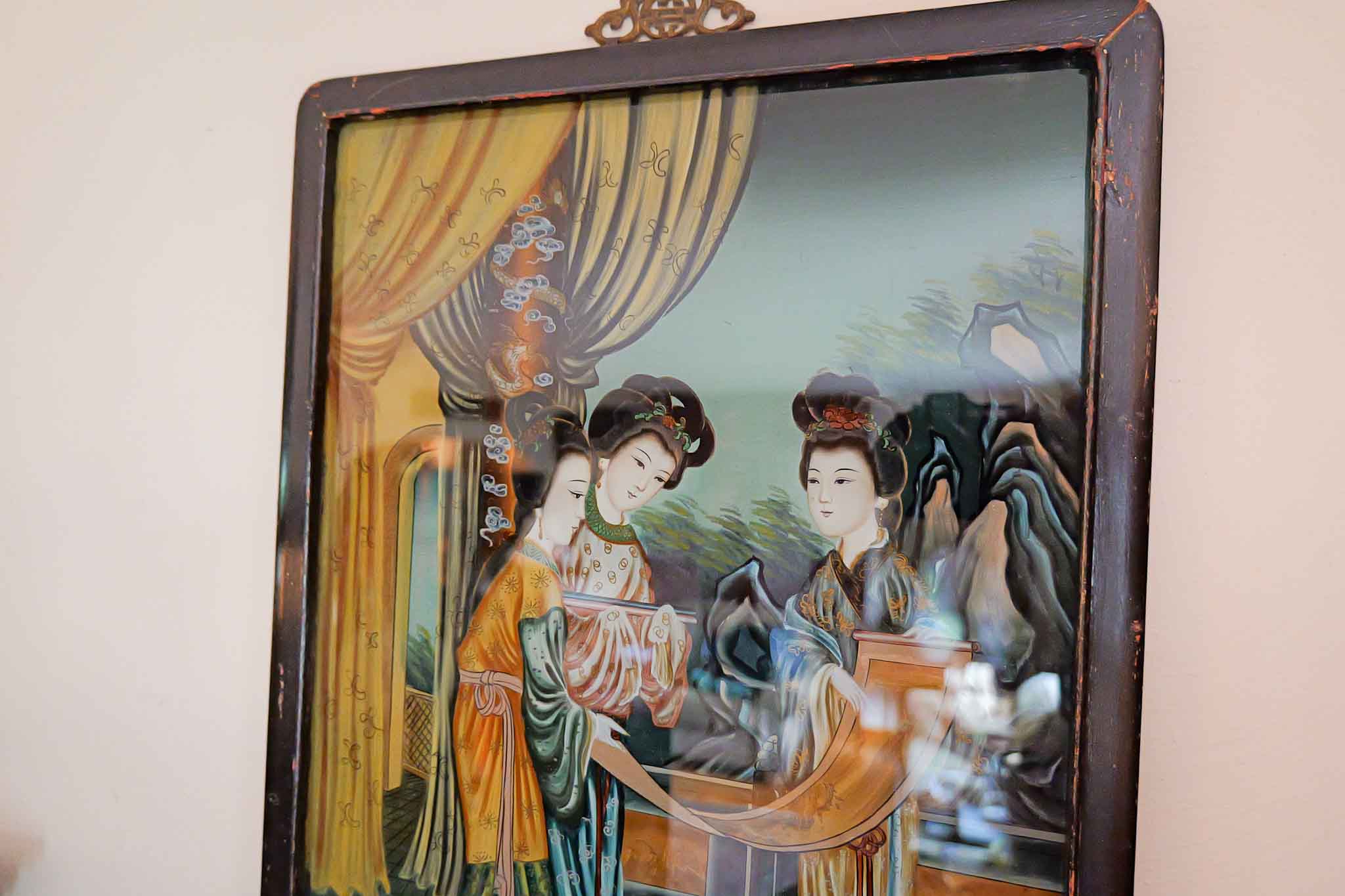 VINTAGE CHINESE REVERSE PAINTING ON GLASS (3 WOMEN WITH SCROLL)