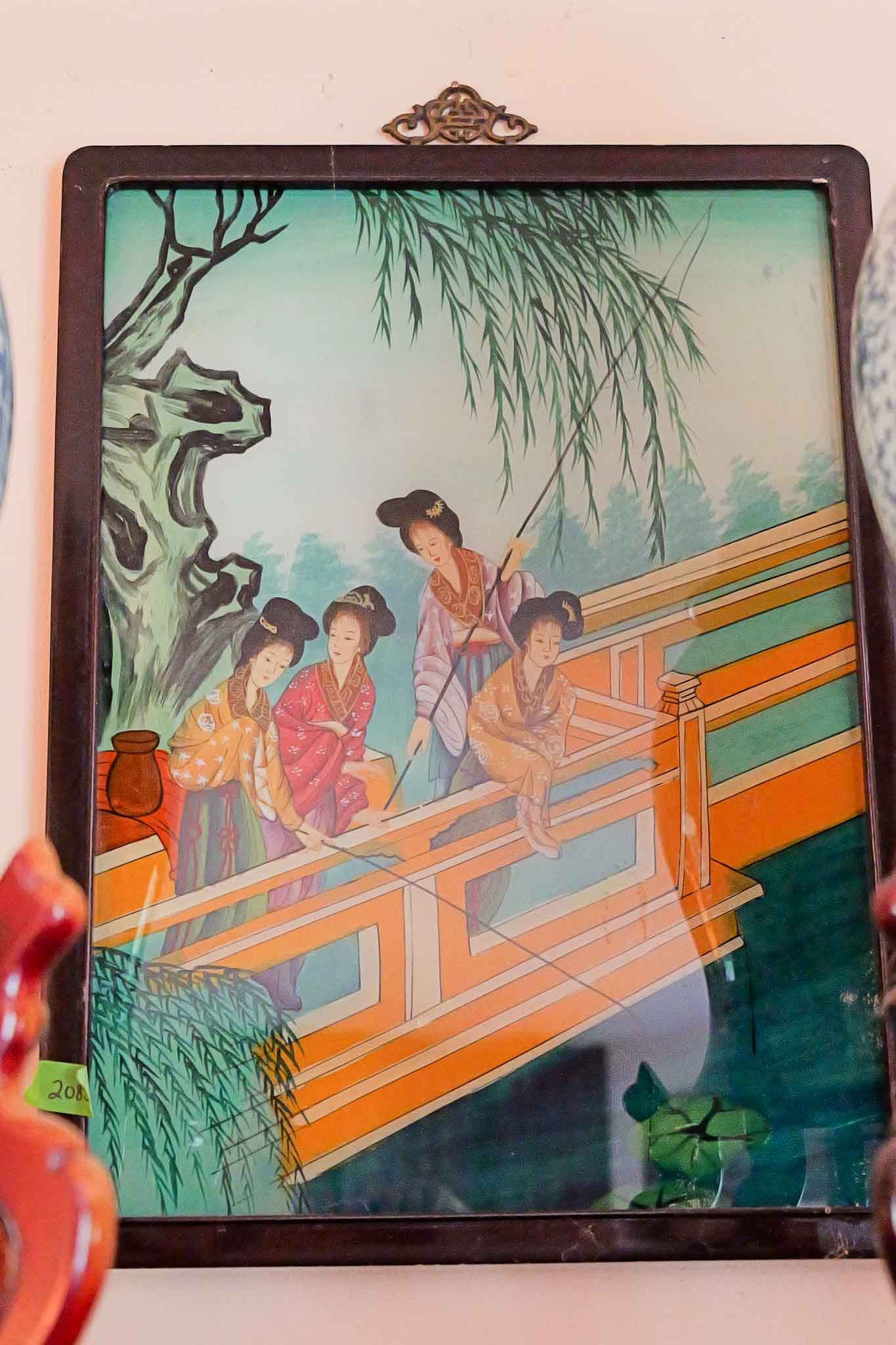 VINTAGE CHINESE REVERSE PAINTING ON GLASS (WOMEN ON BRIDGE)
