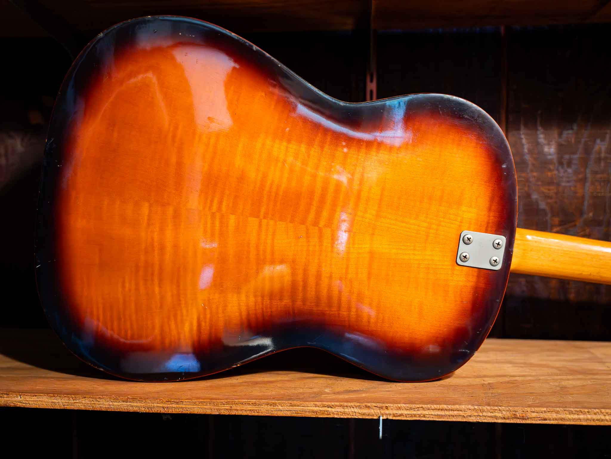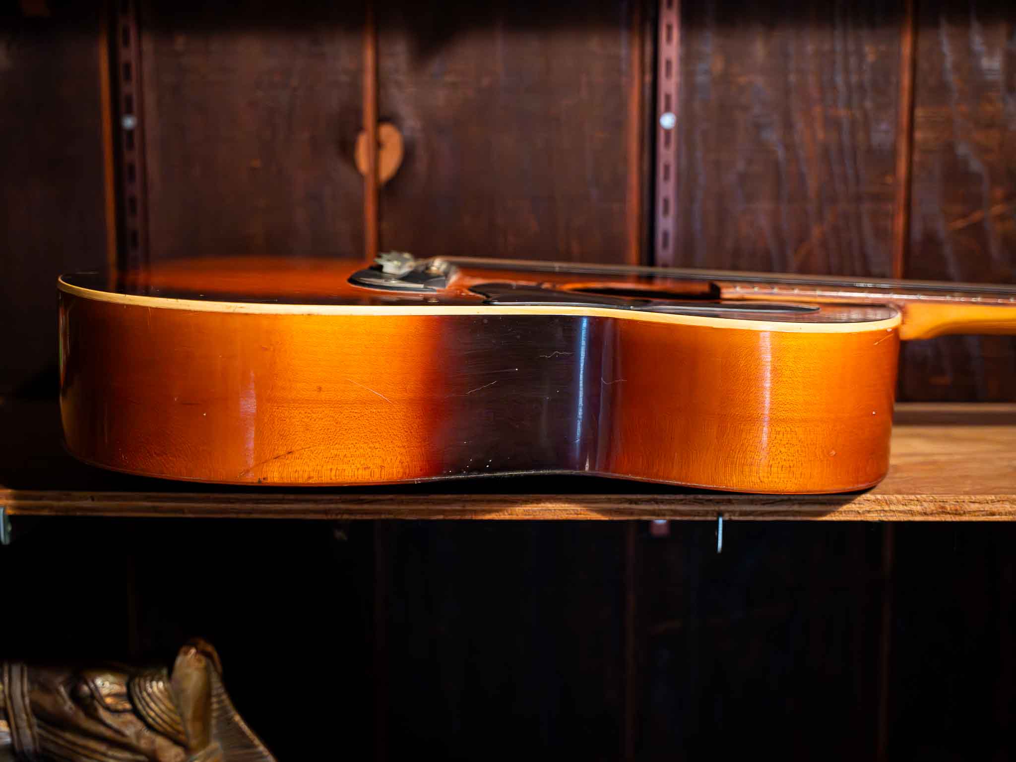 Vintage Framus acoustic guitar featuring a classic sunburst finish and traditional body style. Manufactured in Bavaria, Germany, Framus guitars are well-known for their mid-century craftsmanship and unique European tone.