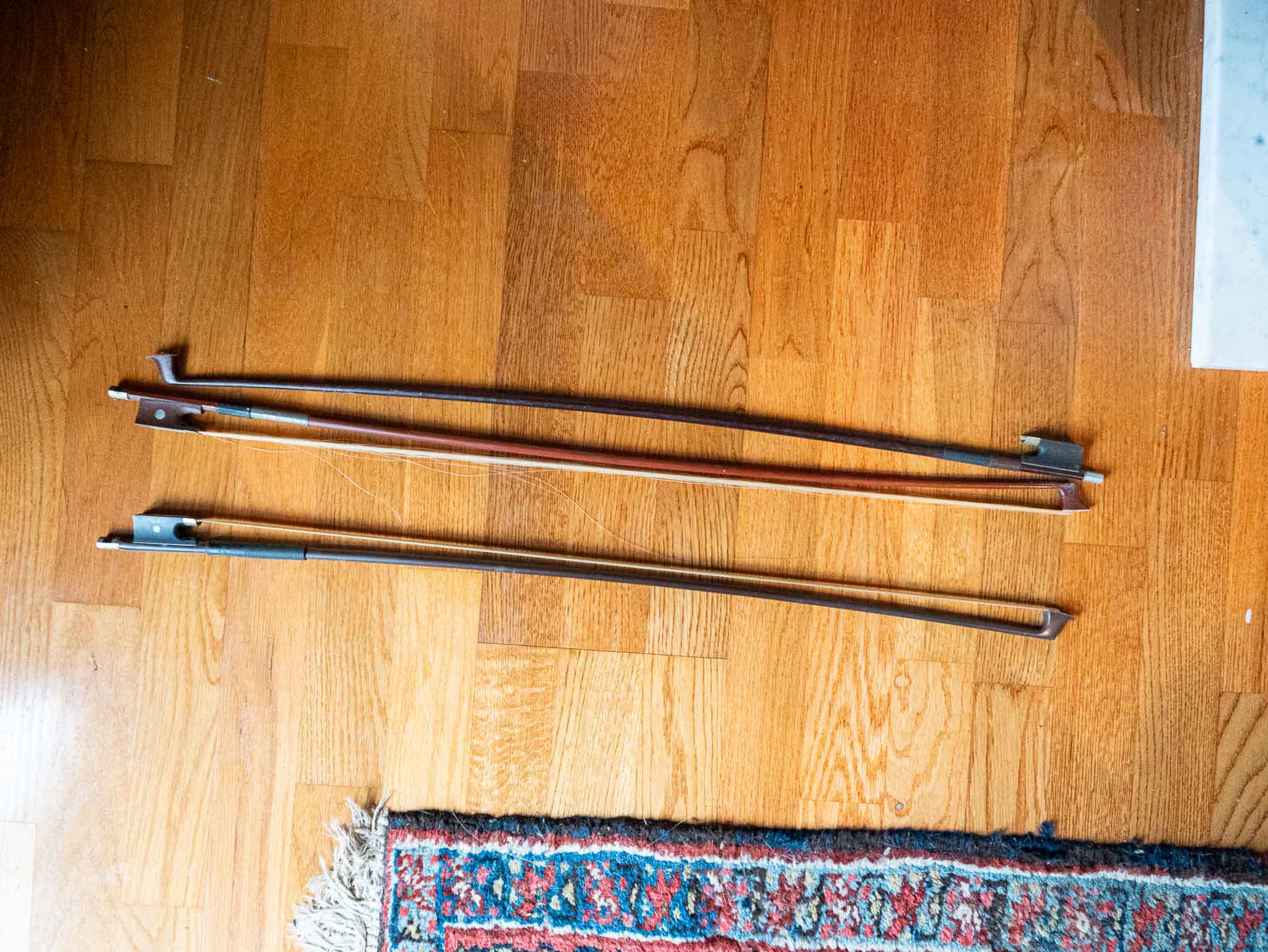 Good vintage condition. Shows age-appropriate wear including surface marks and finish wear. Case has visible wear internally but remains functional. Bows appear used and may need rehairing. Strings likely need replacement and instrument may benefit from a professional setup/tuning. No major structural issues visible from photos.