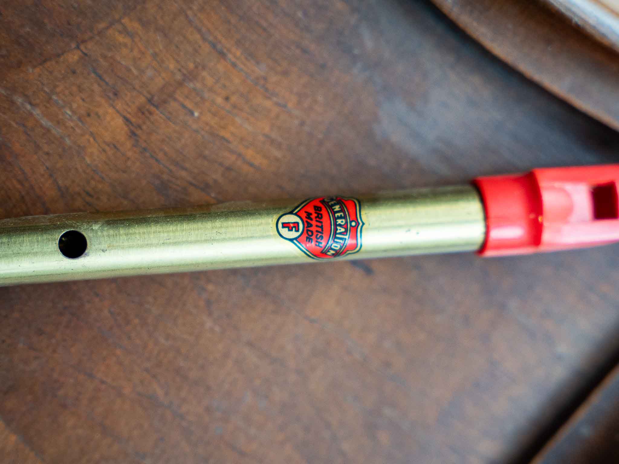 Classic vintage Generation flageolet tin whistle, a well-known and widely respected brand in traditional folk music. Featuring a brass-colored metal body with a red mouthpiece, this whistle delivers the iconic bright, clear tone associated with Irish and Celtic music.