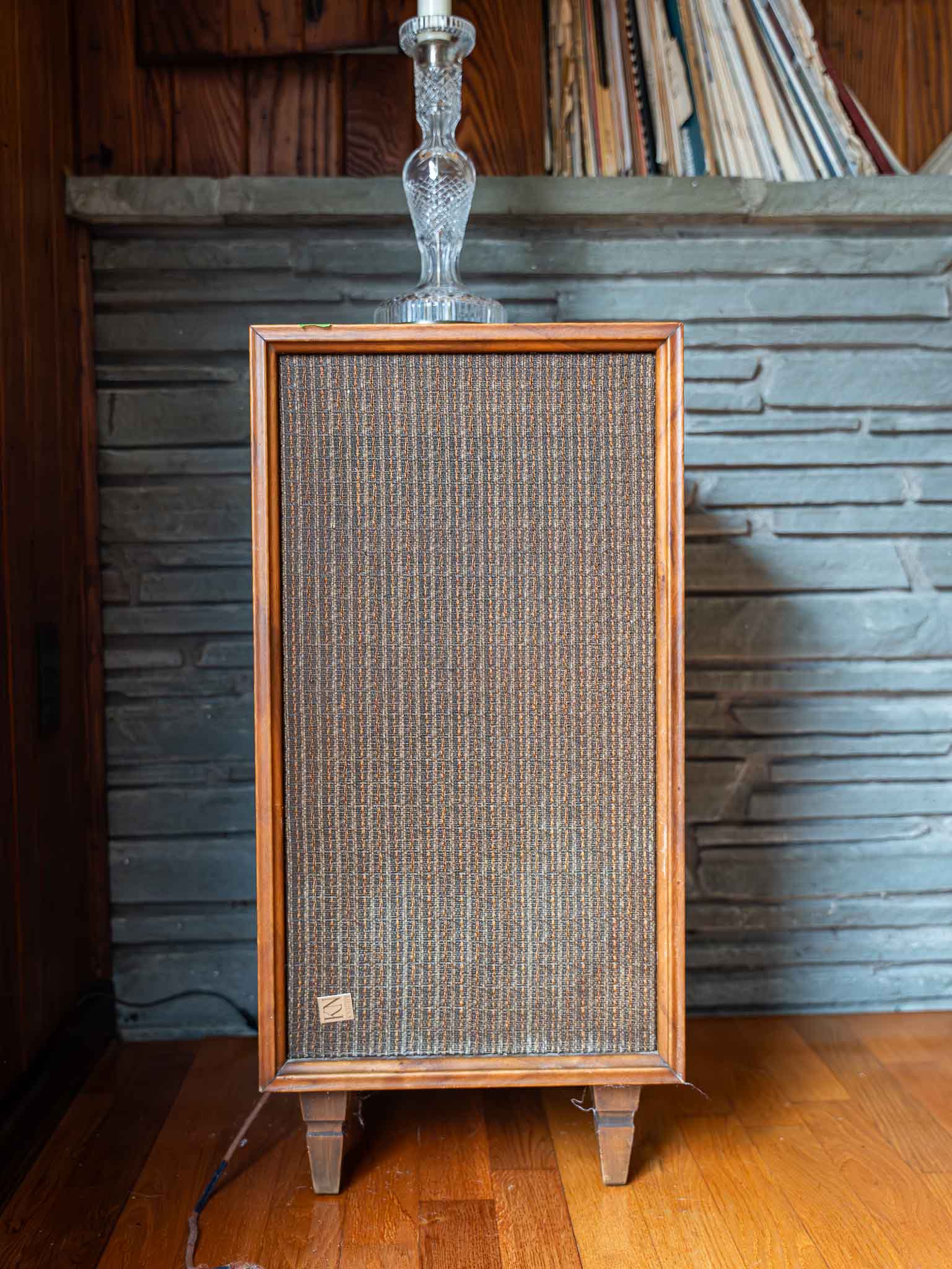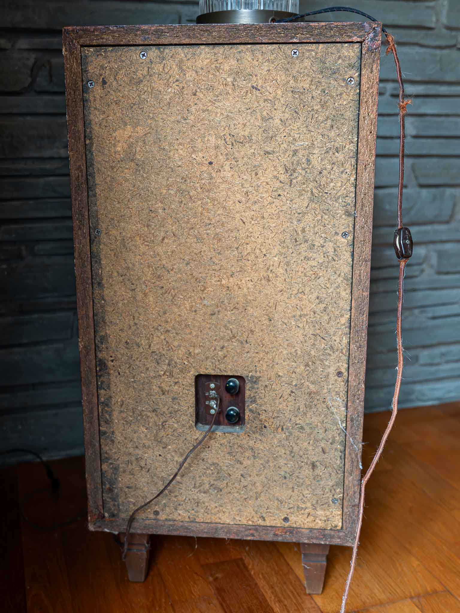 Condition is used. Cabinets show age-related wear including surface marks and finish wear. Fabric grilles appear intact with typical vintage wear. Wiring is older and may benefit from inspection or updating depending on use.